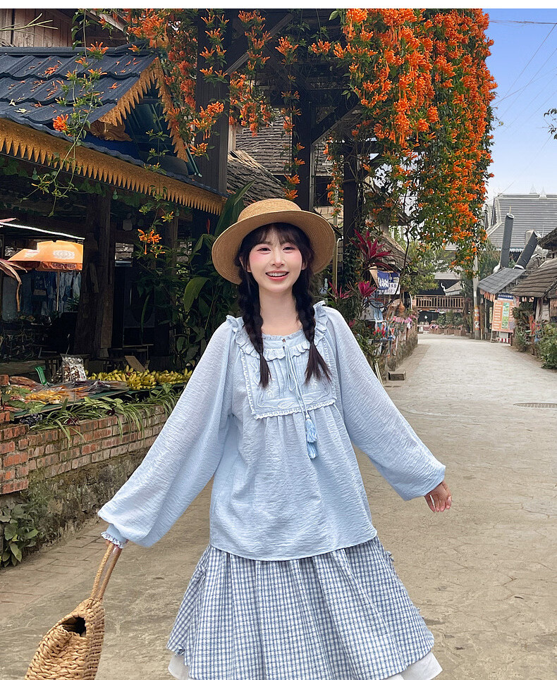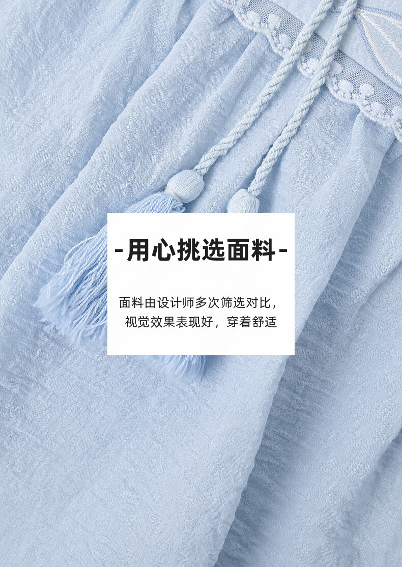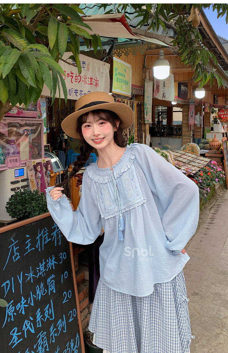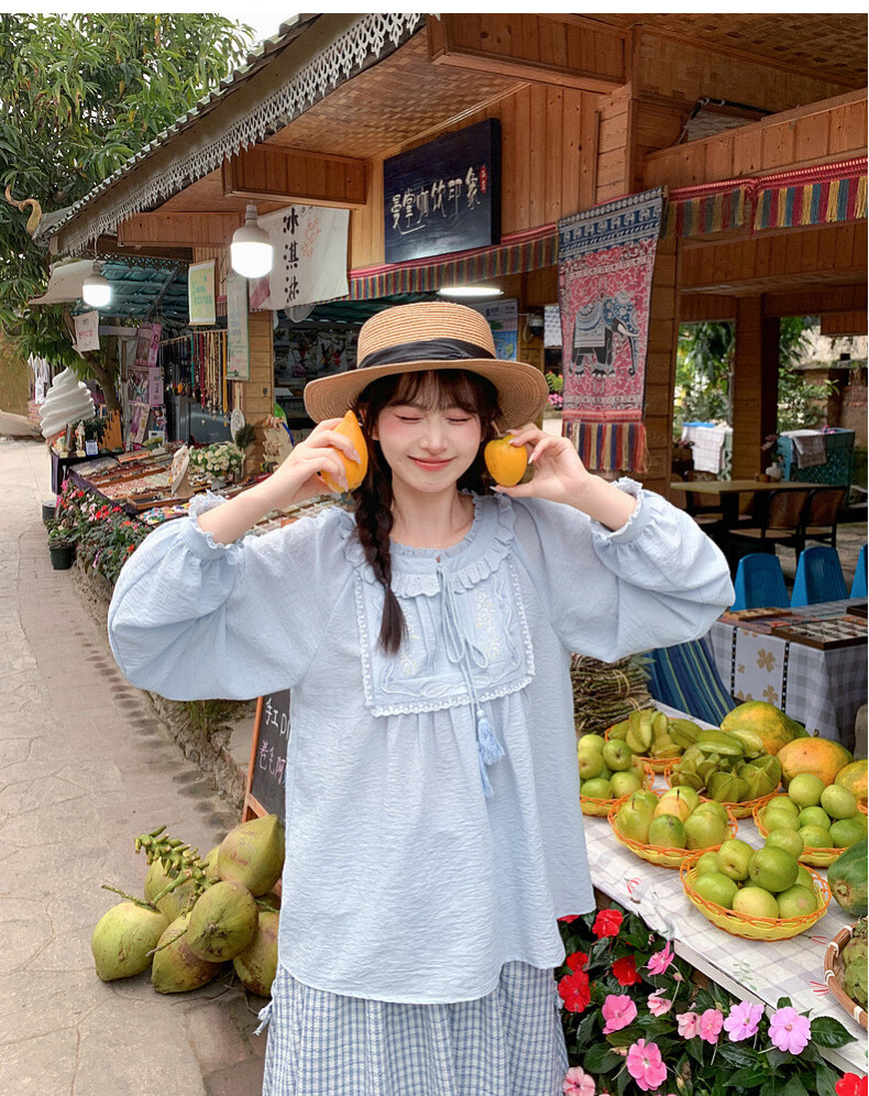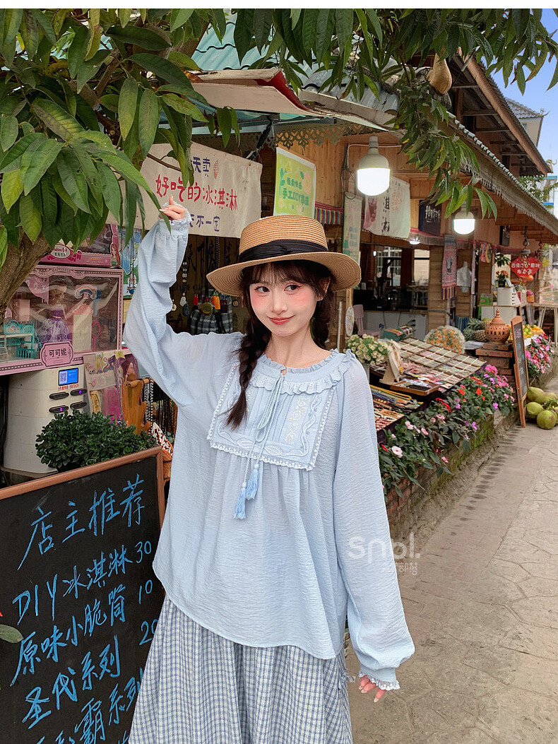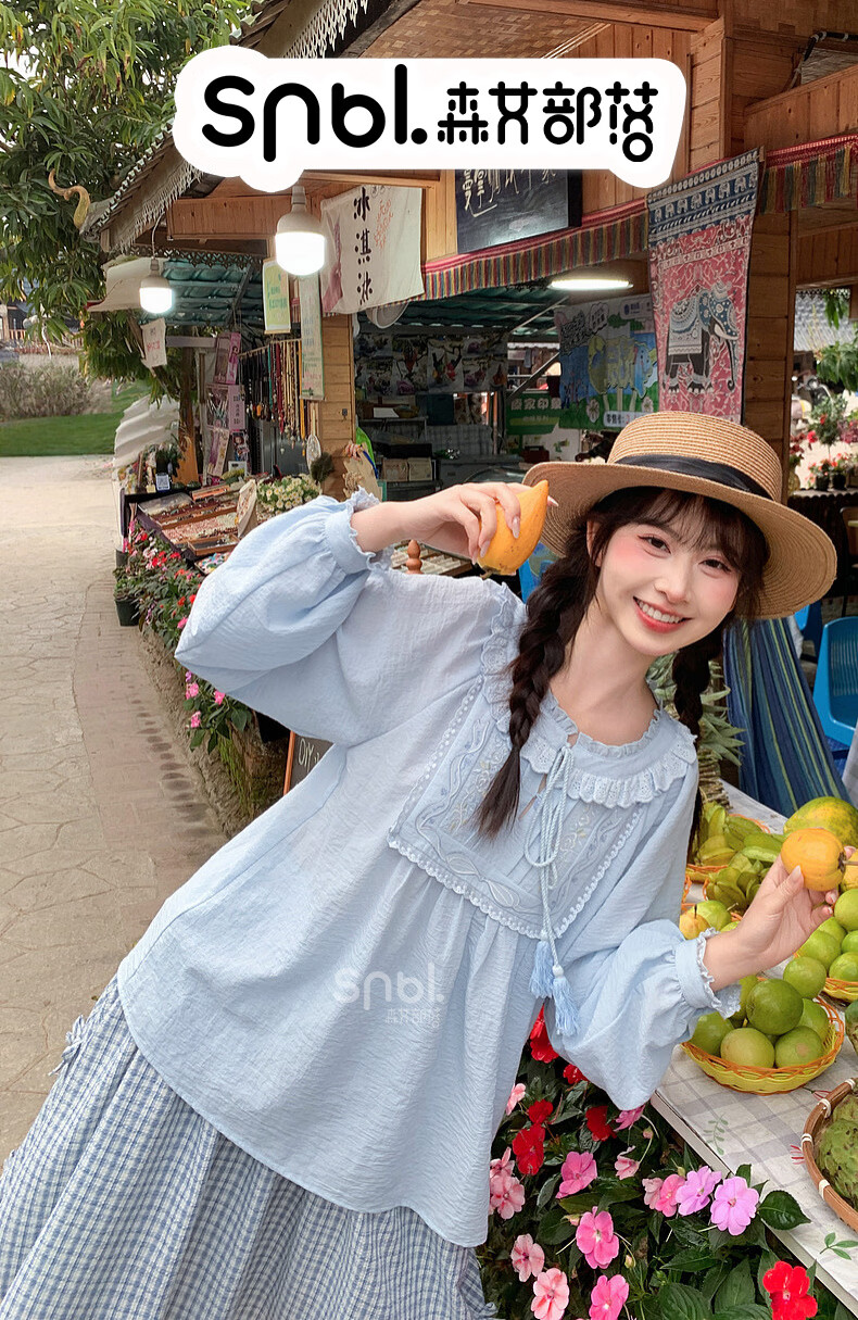 Forest Girl Tribal Sweet Style Embroidered Shirt Women's New Tassel Lace Design Forest Style Versatile Loose Top Summer Blue Top S Model Code