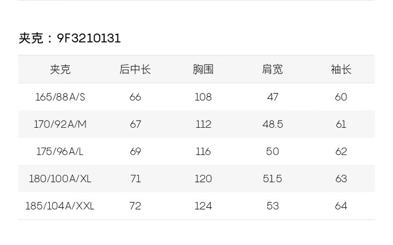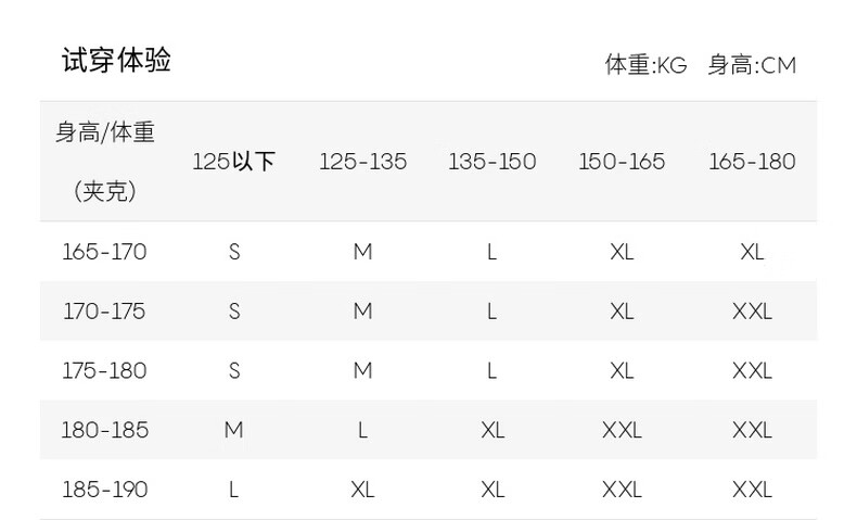China (cm) 165 / 88-90 170 / 96-98 175 / 108-110 180 / 118-122 185 / 126-130