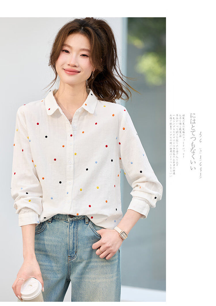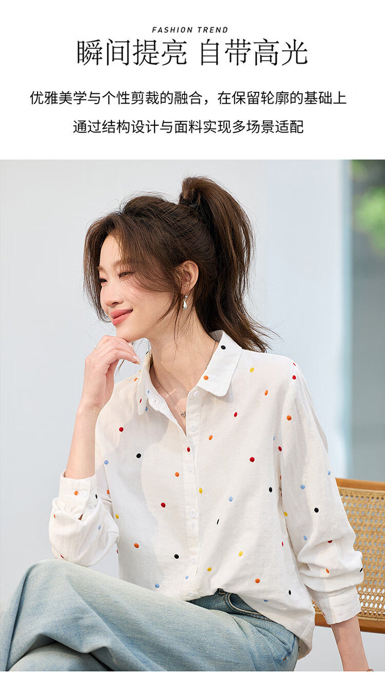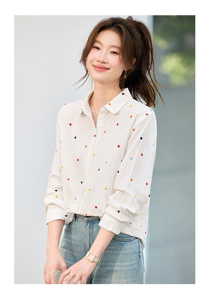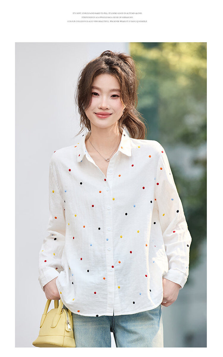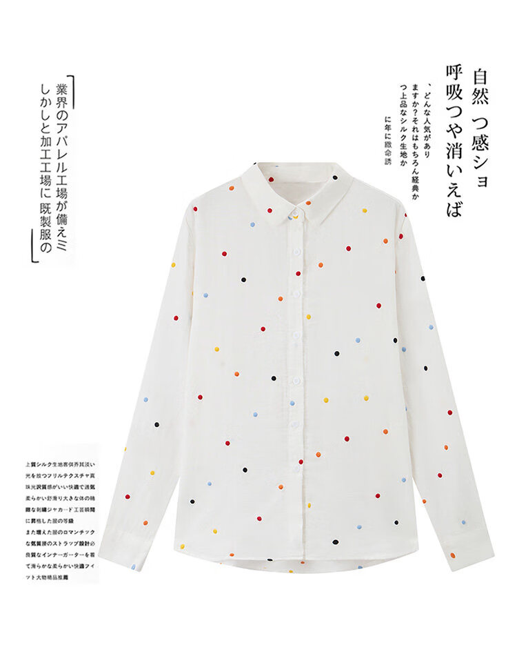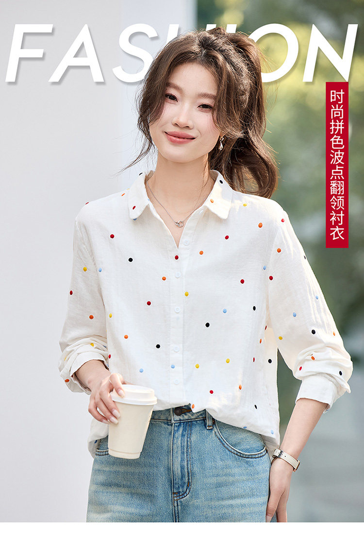 ROMON high-end colorful polka-dot shirt for women 2026 spring long-sleeved lapel shirt top white M 90-130Jin Jin equals 0.5 kg
