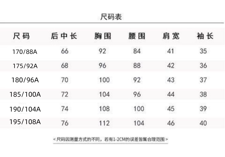 China (cm) 160-165/84-86 165-170 / 88-90 167-172 / 92-96 168-173 / 98-102 170-176 / 106-110