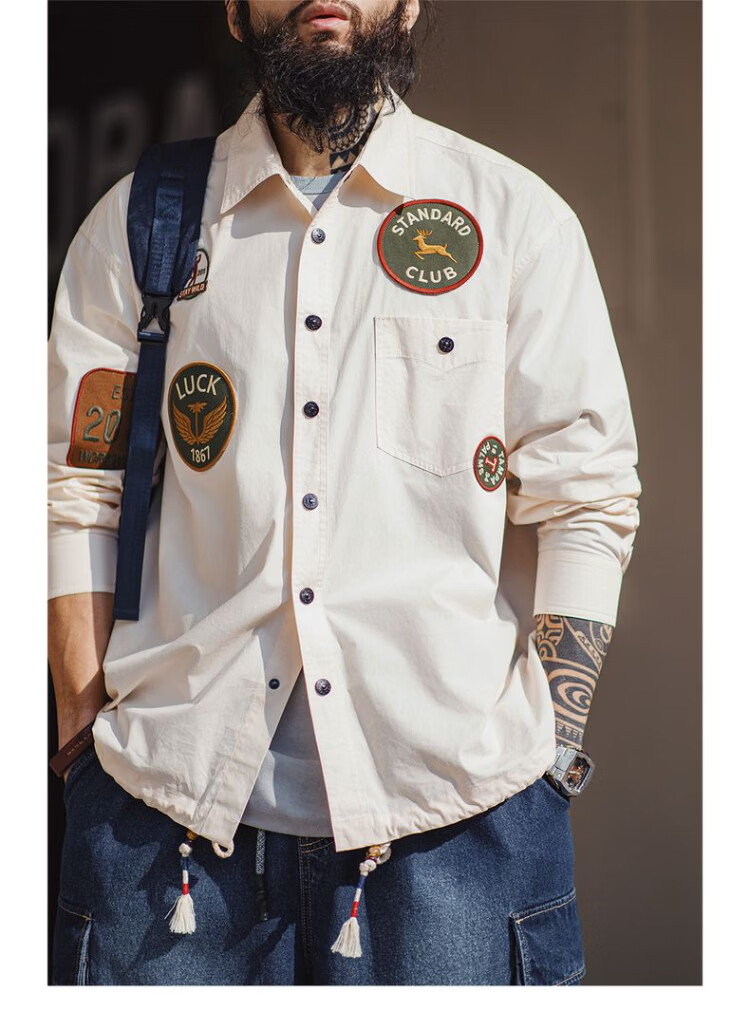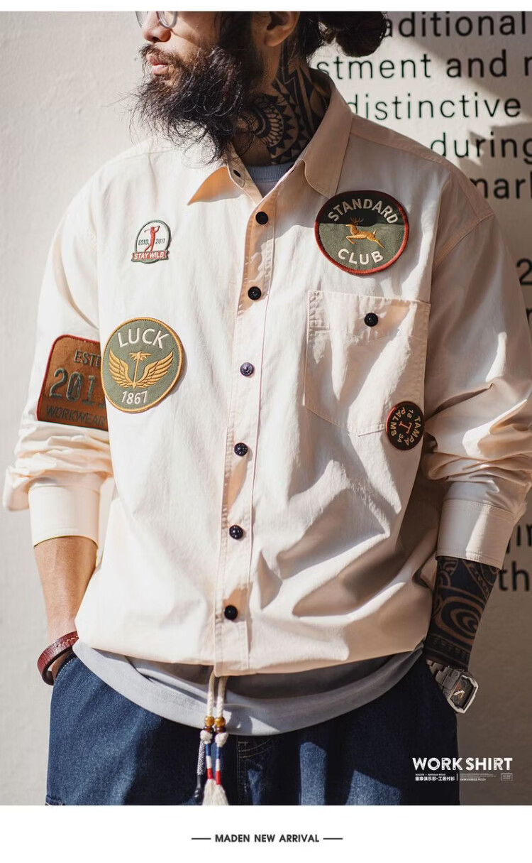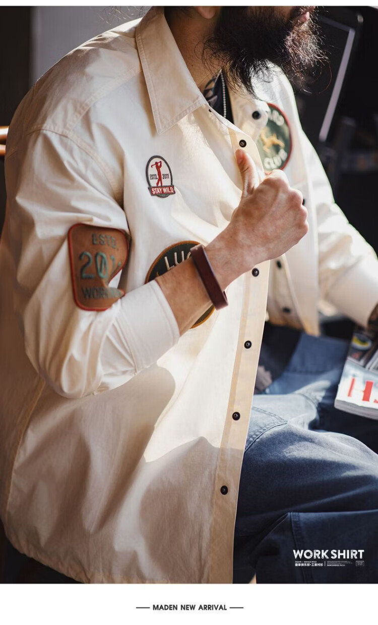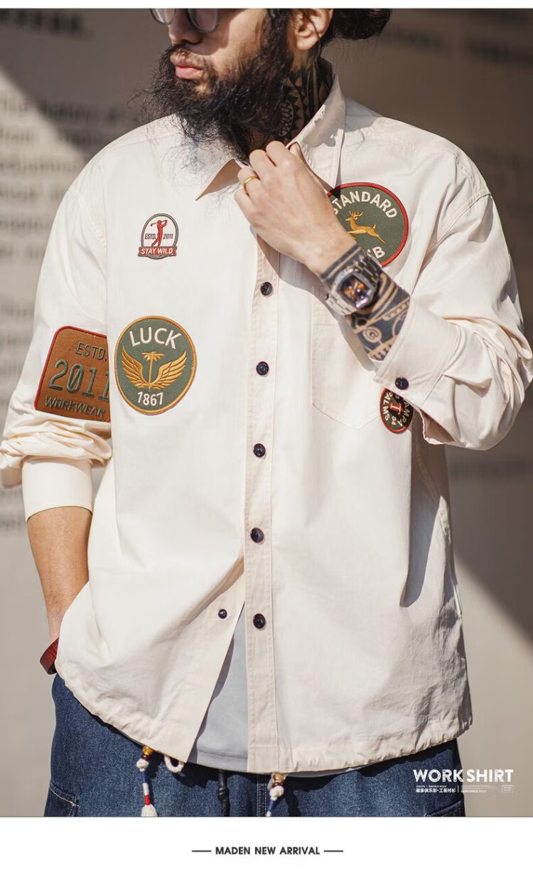Madden Workwear American Chapter Embroidered Long Sleeve Shirt Jacket Thin White Pocket Splicing Shirt Jacket Men's Spring Beige Loose Too Large 2XL