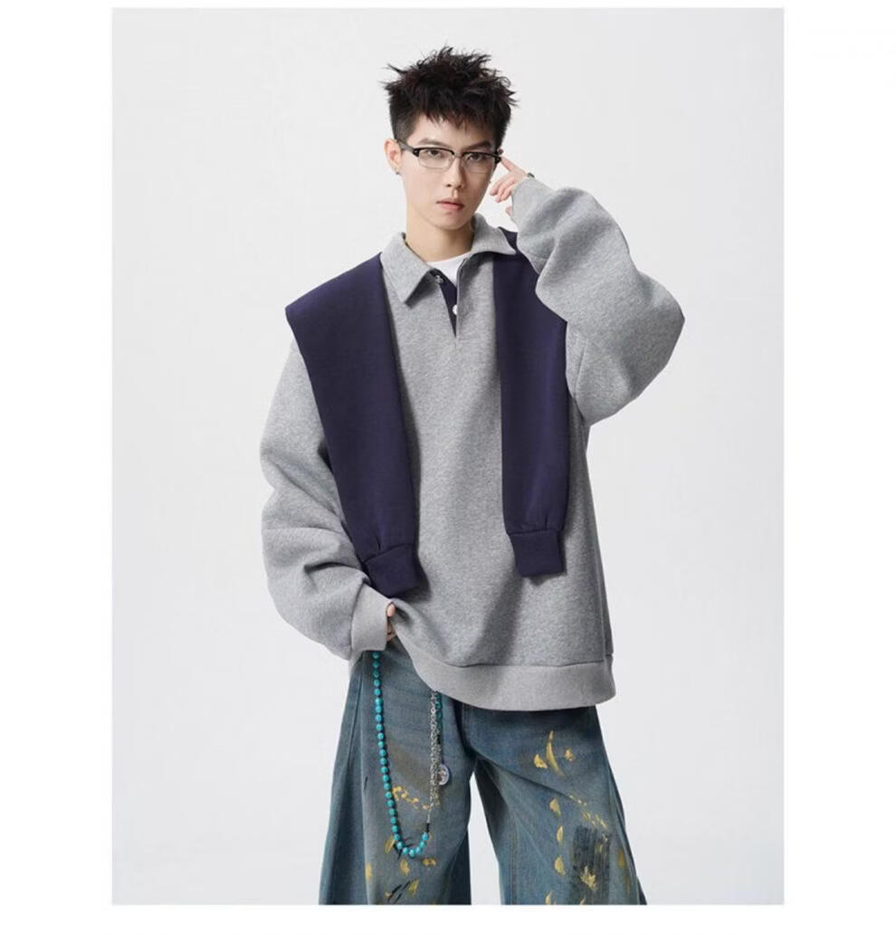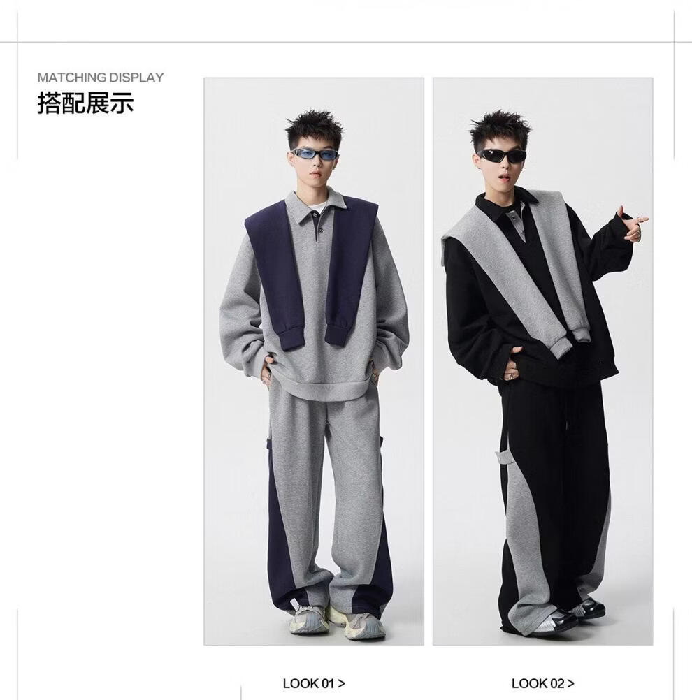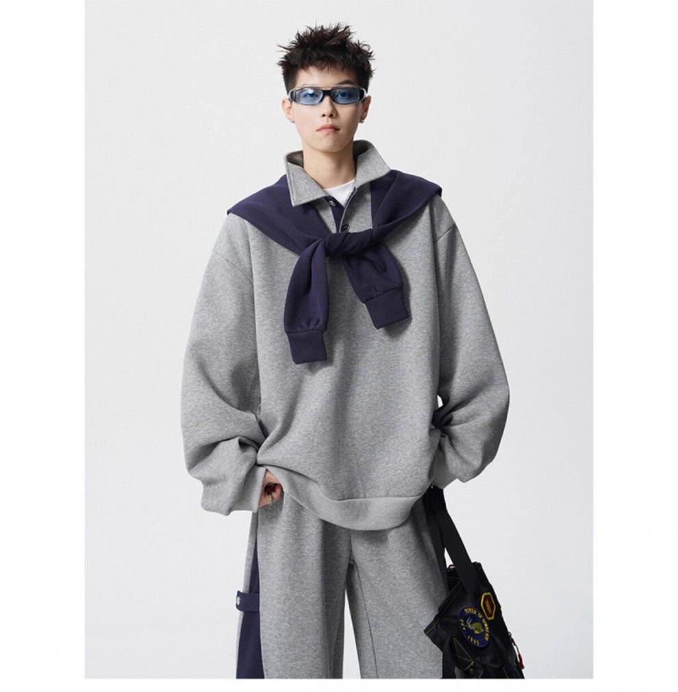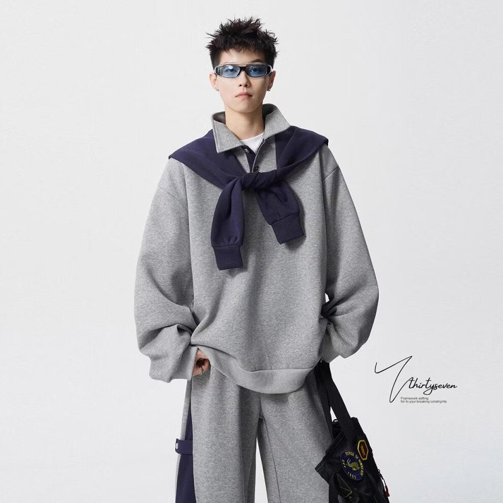ROMON V37 American retro high street contrasting color shawl sports sweatshirt men's autumn fashion brand loose casual gray couple suit suit black M (105-120Jin Jin equals 0.5 kg)