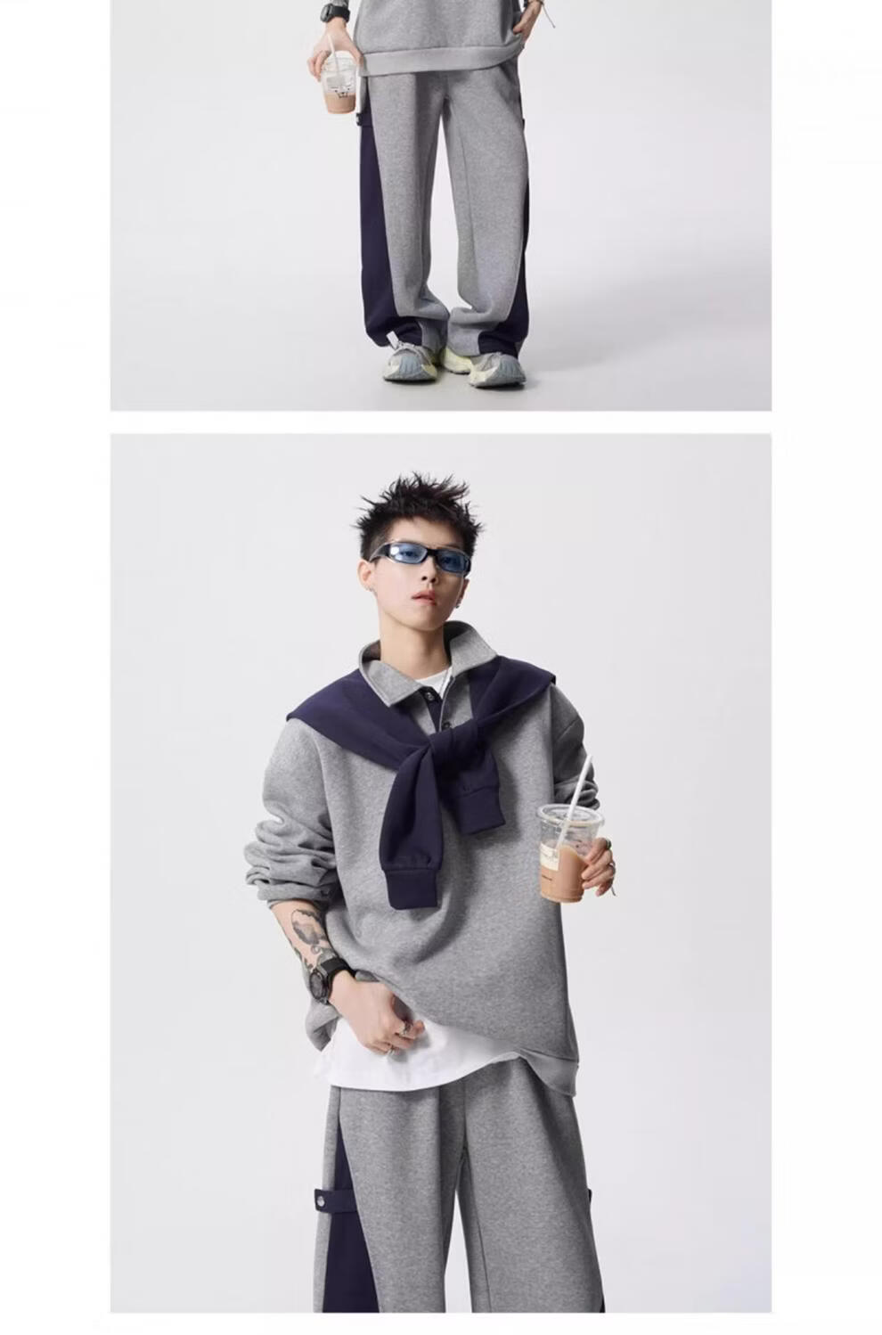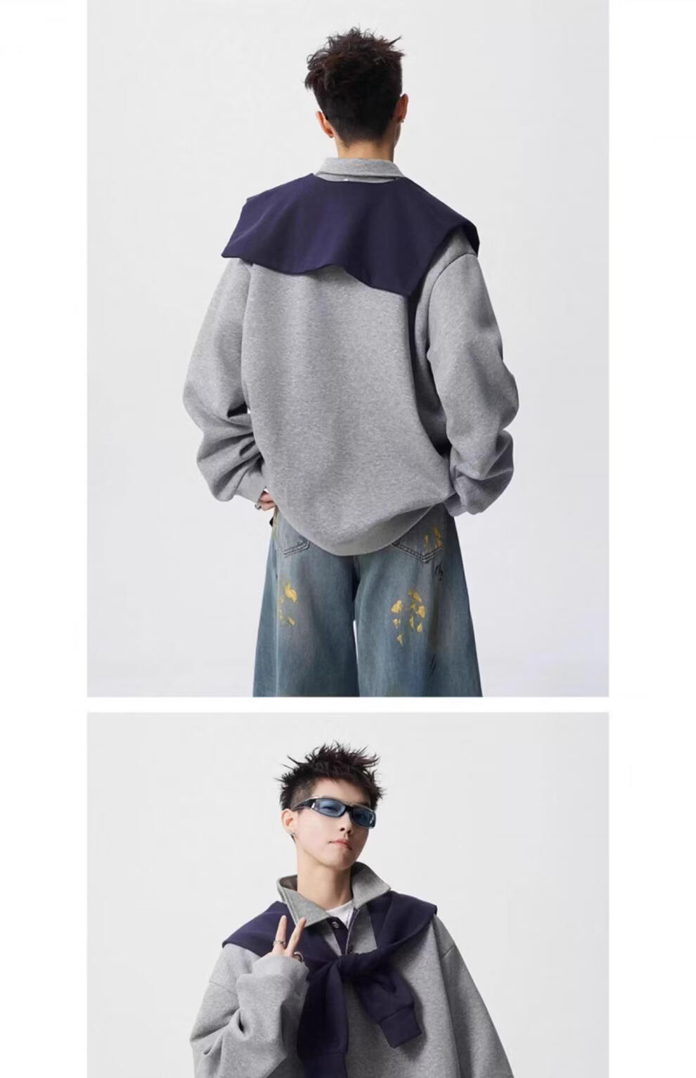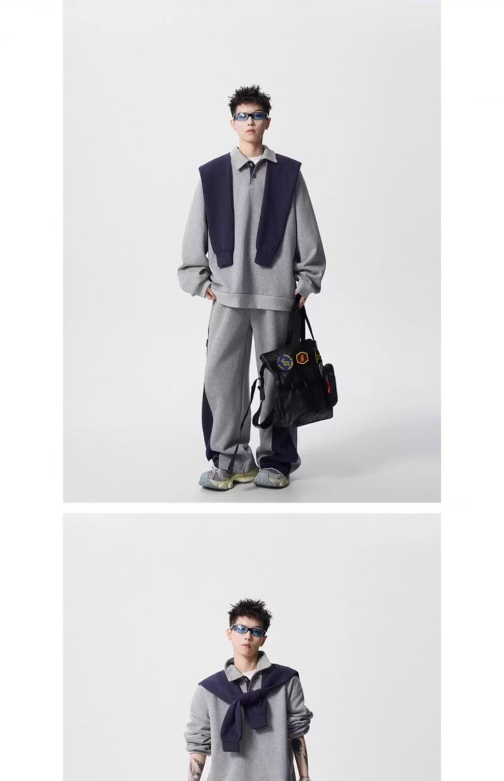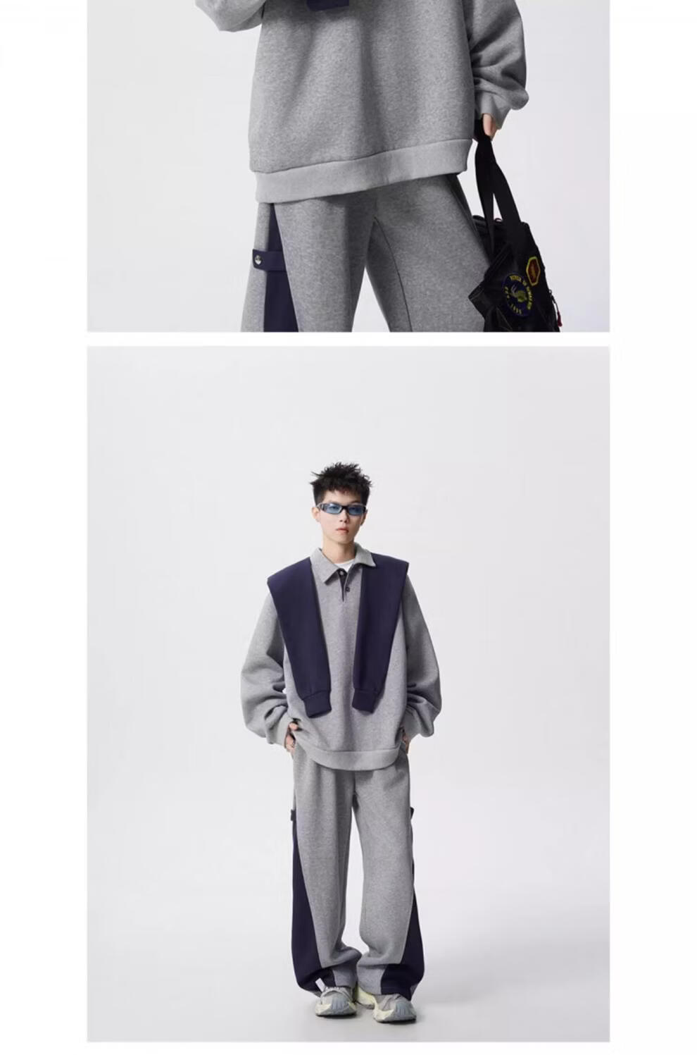 ROMON V37 American retro high street contrasting color shawl sports sweatshirt men's autumn fashion brand loose casual gray couple suit suit black M (105-120Jin Jin equals 0.5 kg)