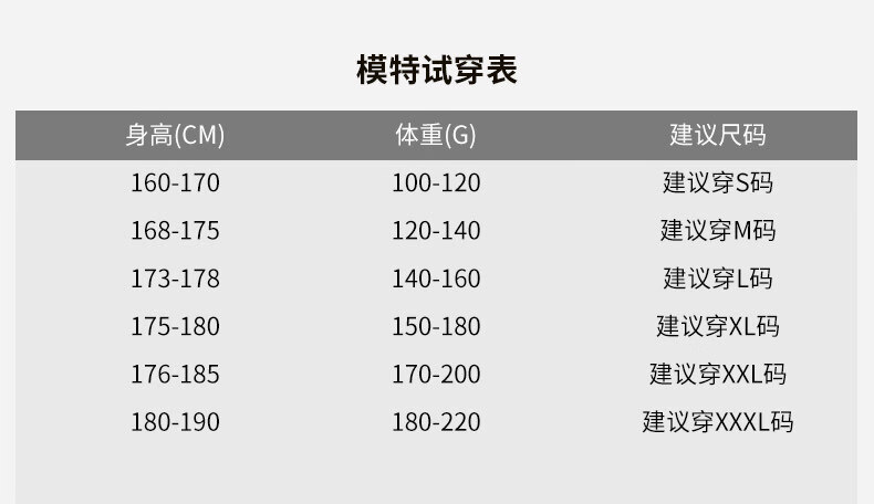 China (cm) 165 / 88-90 170 / 96-98 175 / 108-110 180 / 118-122 185 / 126-130