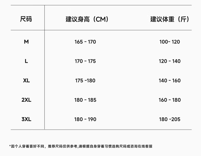 China (cm) 165 / 88-90 170 / 96-98 175 / 108-110 180 / 118-122 185 / 126-130