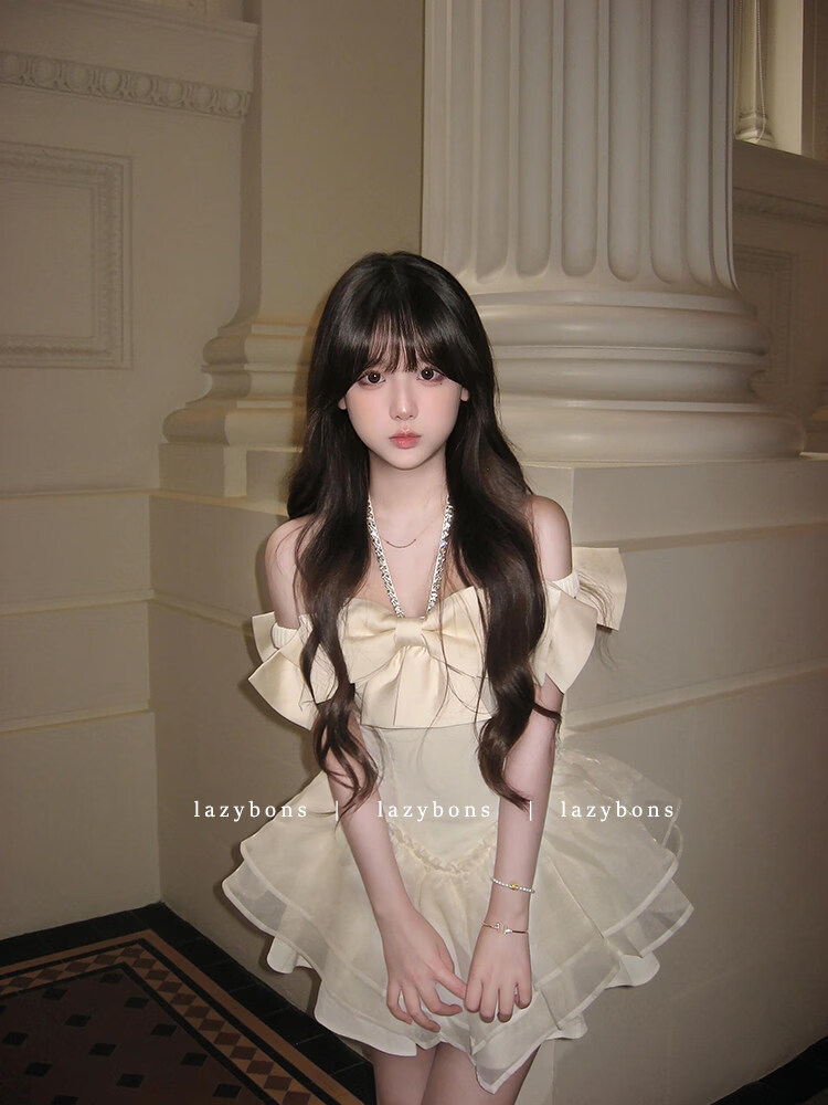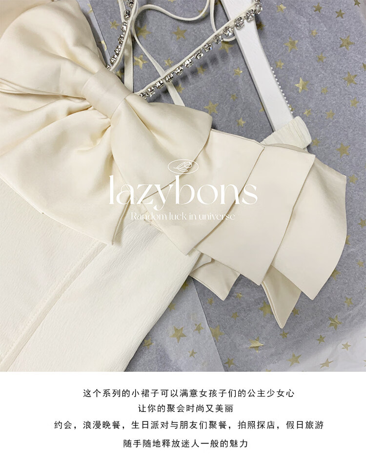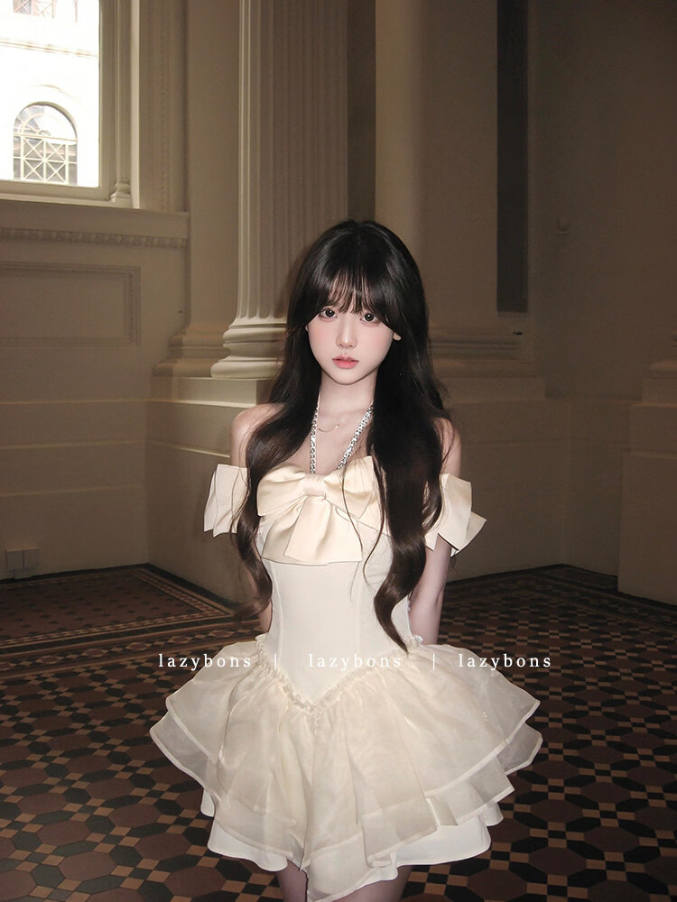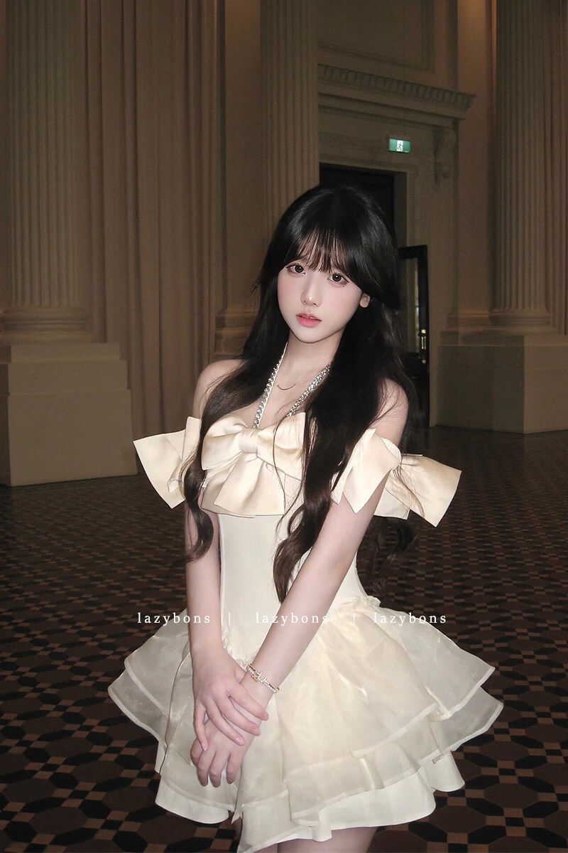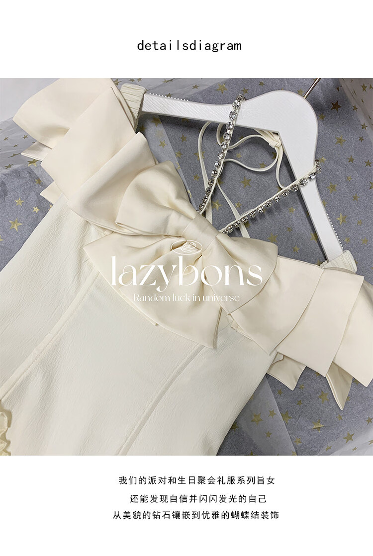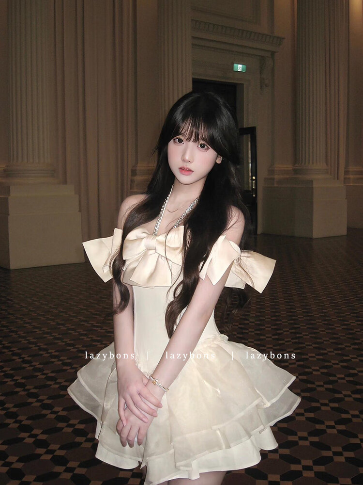 Xiaohongshu hanging neck dress girl's rich girl's birthday dress with bow and diamonds, apricot S
