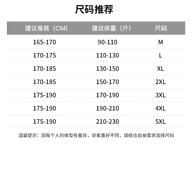 China (cm) 165 / 88-90 170 / 96-98 175 / 108-110 180 / 118-122 185 / 126-130