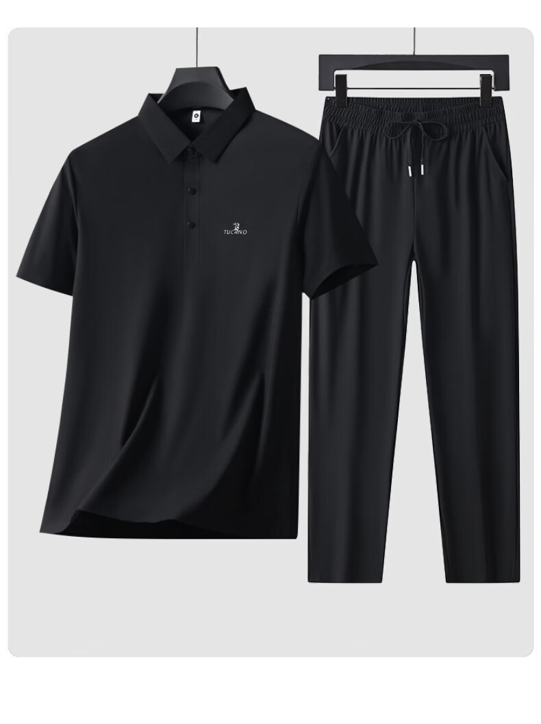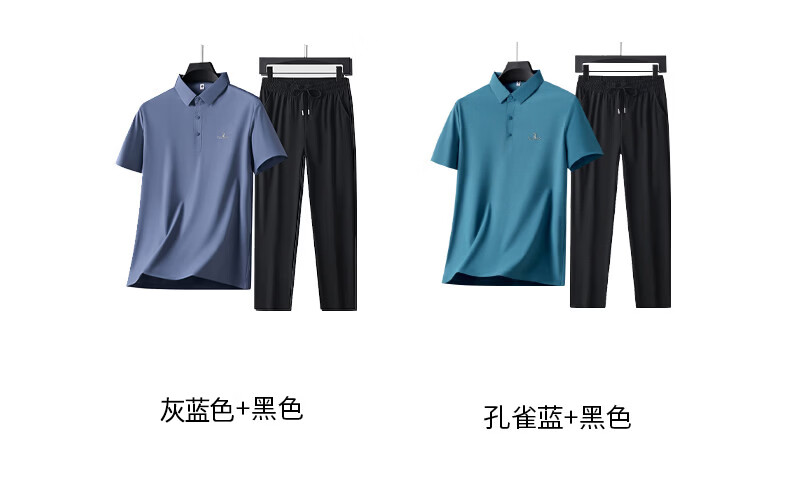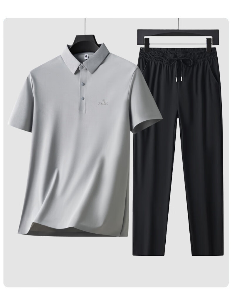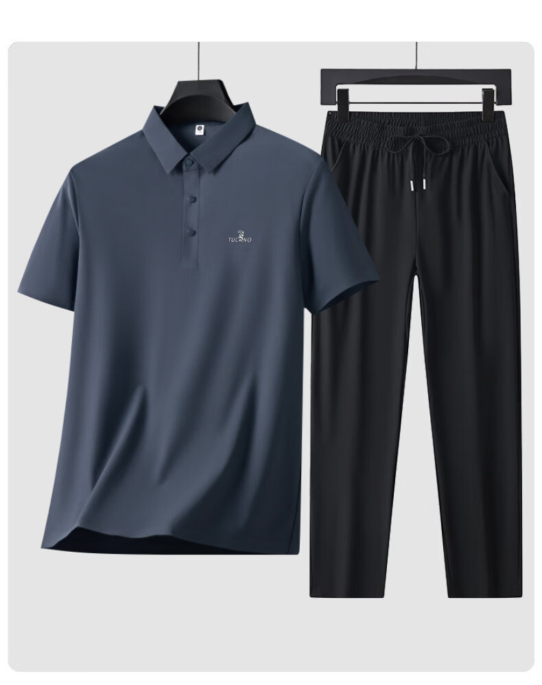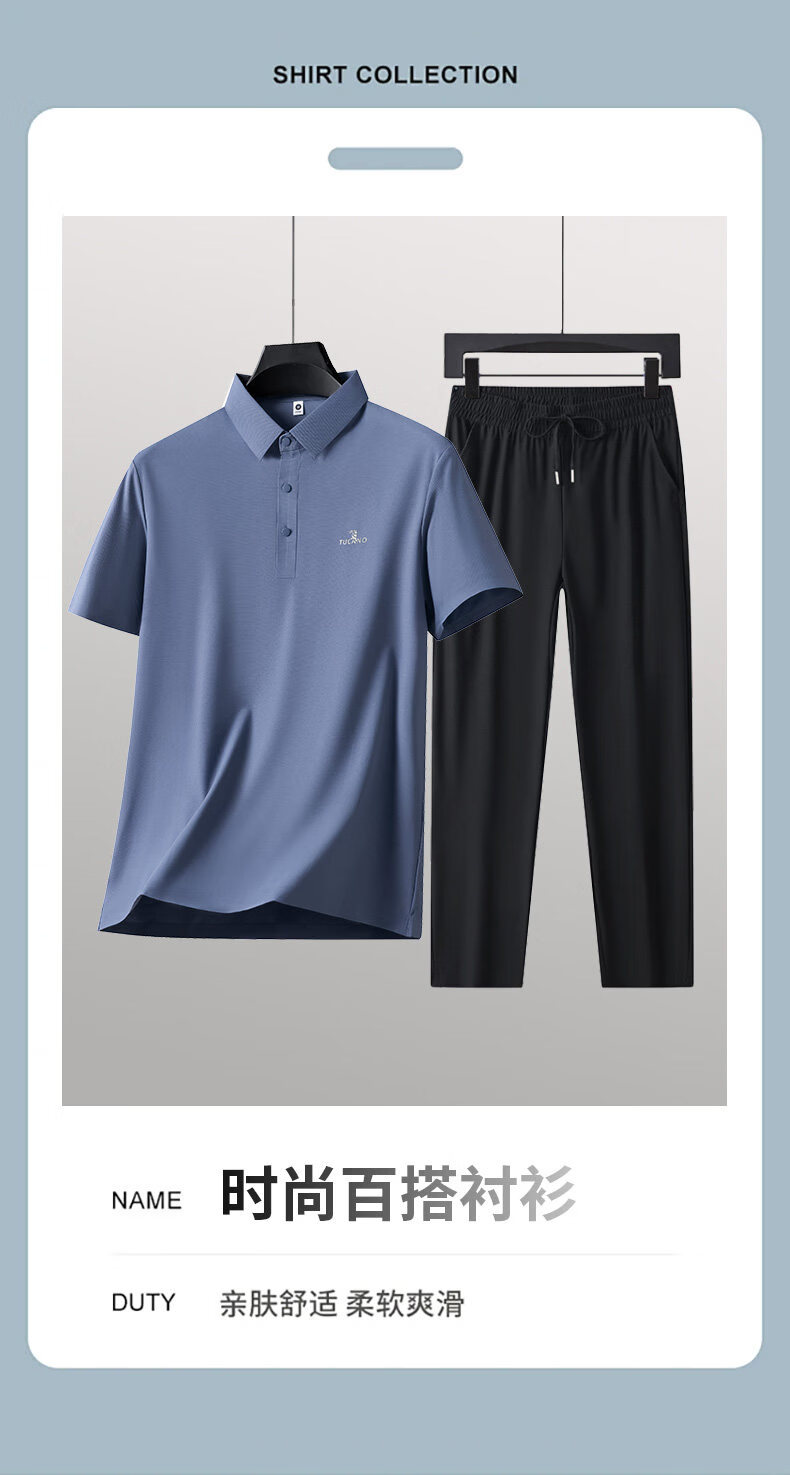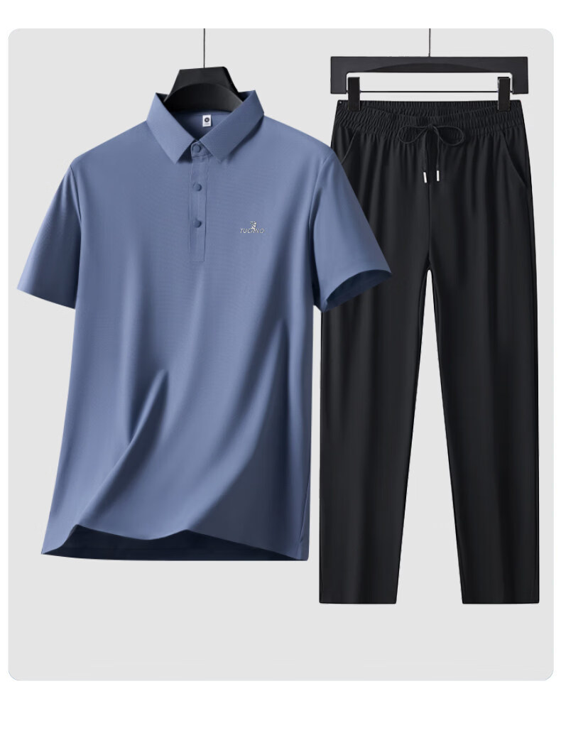 Woodpecker Ice Silk Short Sleeve T-Shirt Men's Dad Suit 2026 New Summer Father's Day Gift Middle-aged and Elderly Men's Polo Shirt Haze Blue Short Sleeve + Black Pants XL (Recommended 125-140 Jin Jin equals 0.5 kg)