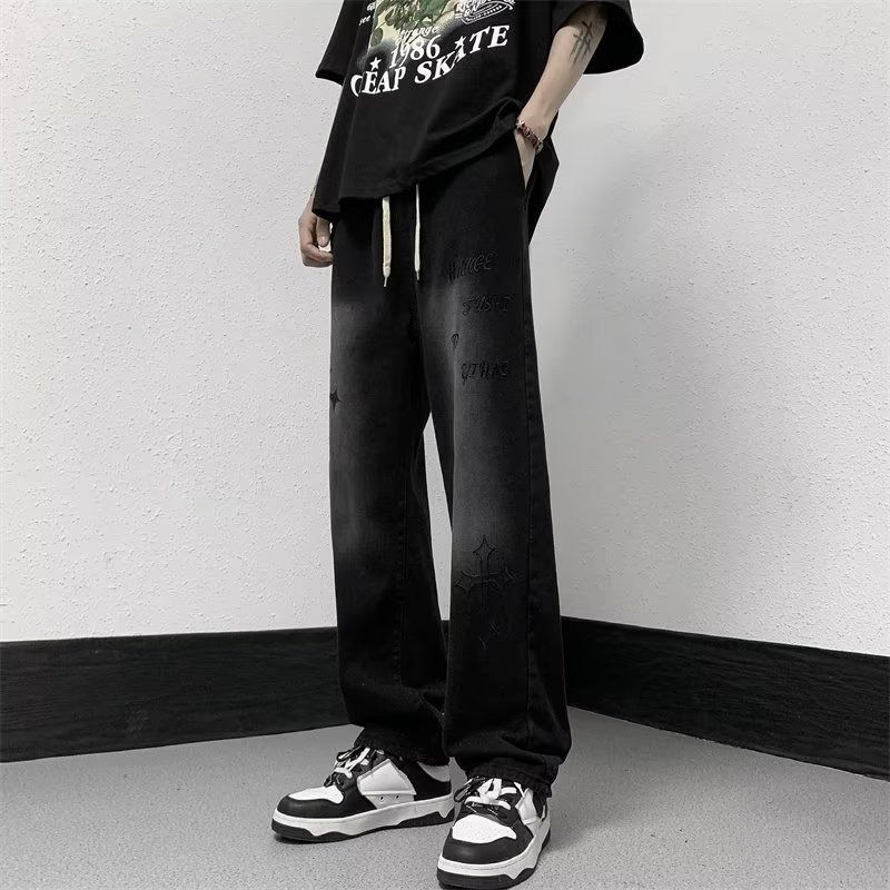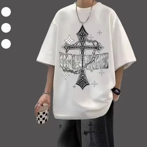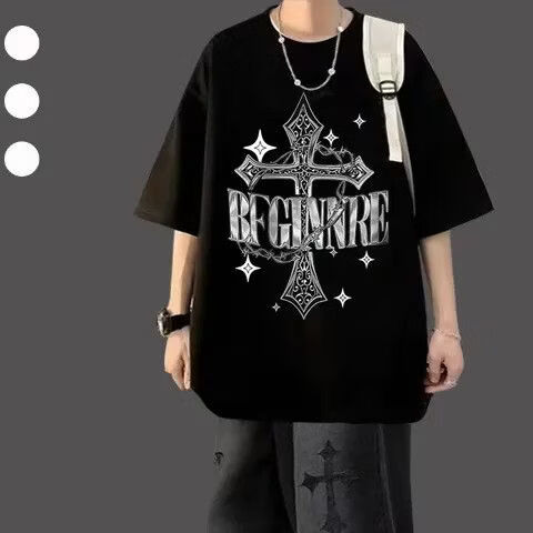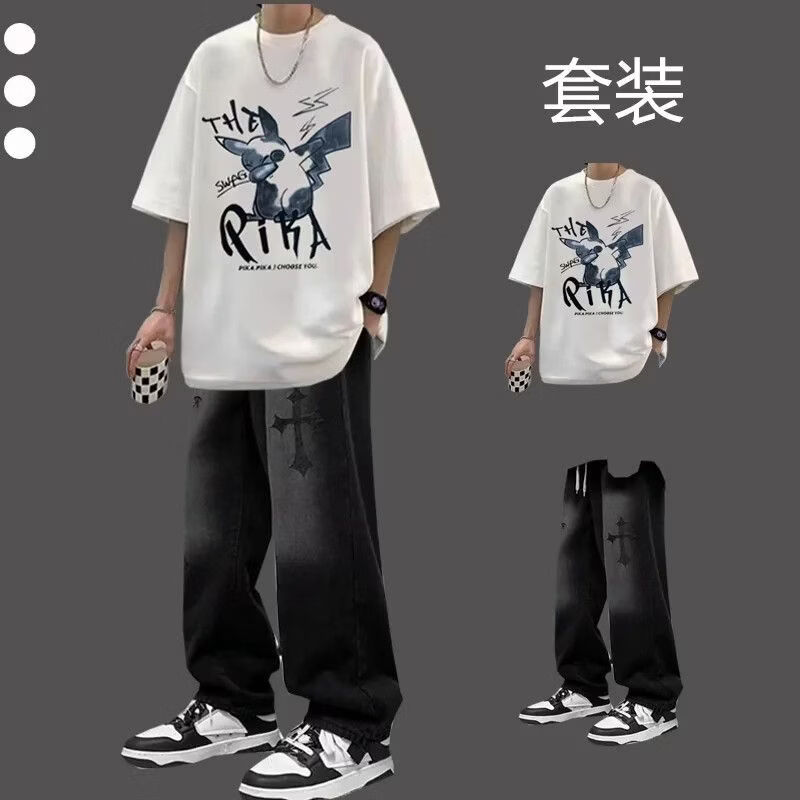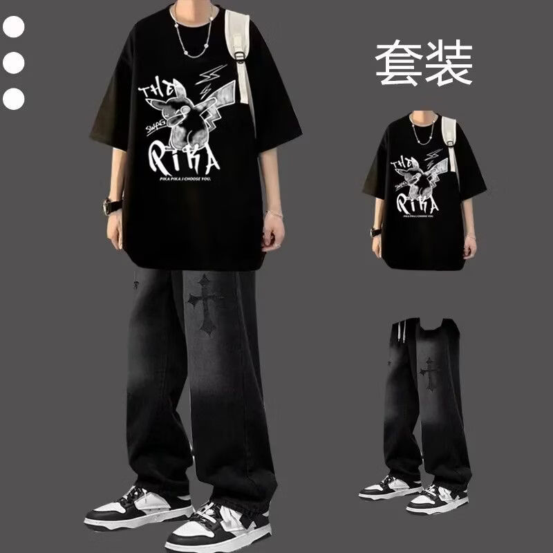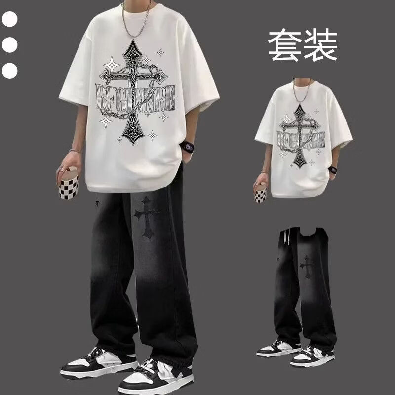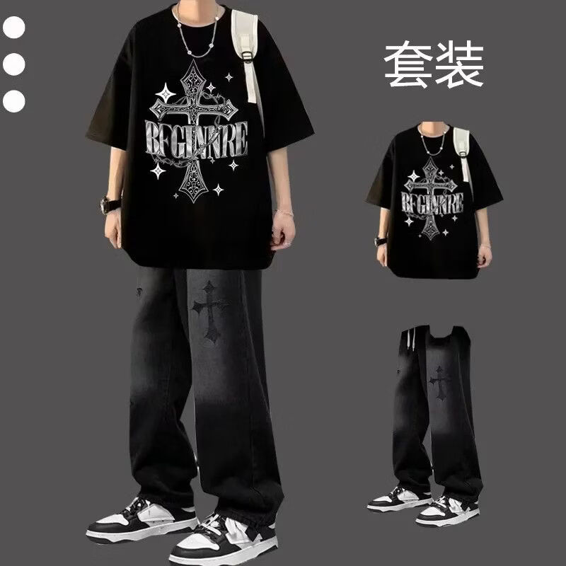Playboy (PLAYBOY) short-sleeved T-shirt summer suit trendy casual youth men's clothing complete set with jeans trendy two-piece suit Cross short-sleeved black + cross black jeans M number recommended 95-109 Jin Jin equals 0.5 kg