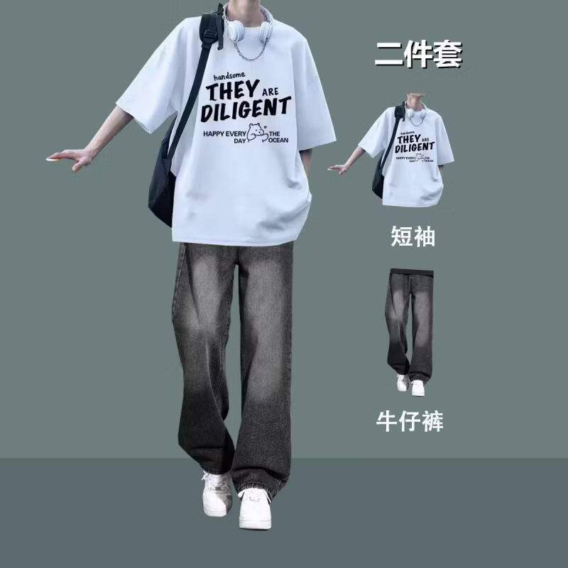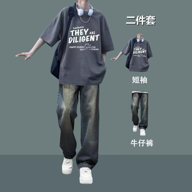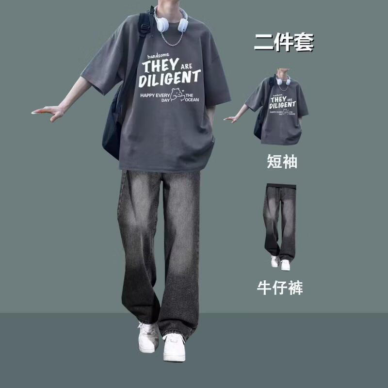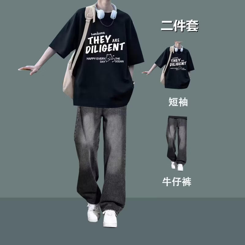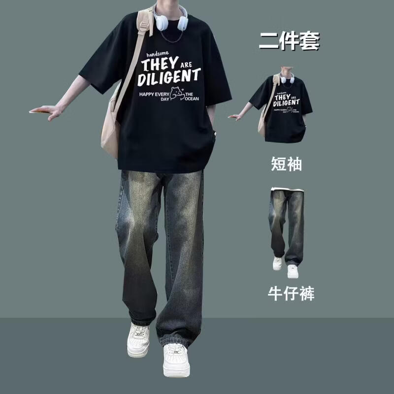 Playboy (PLAYBOY) summer boys' Hong Kong style loose short-sleeved T-shirts for teenagers with trendy jeans men's handsome casual suits 2 pieces T145 pure cotton T-shirt black + 7013 denim M
