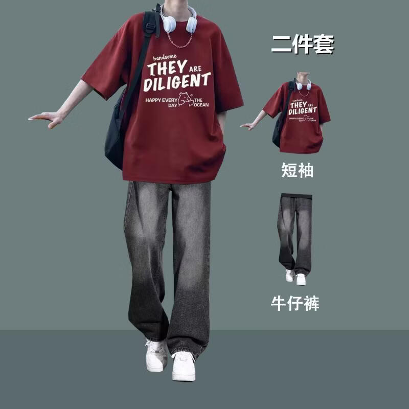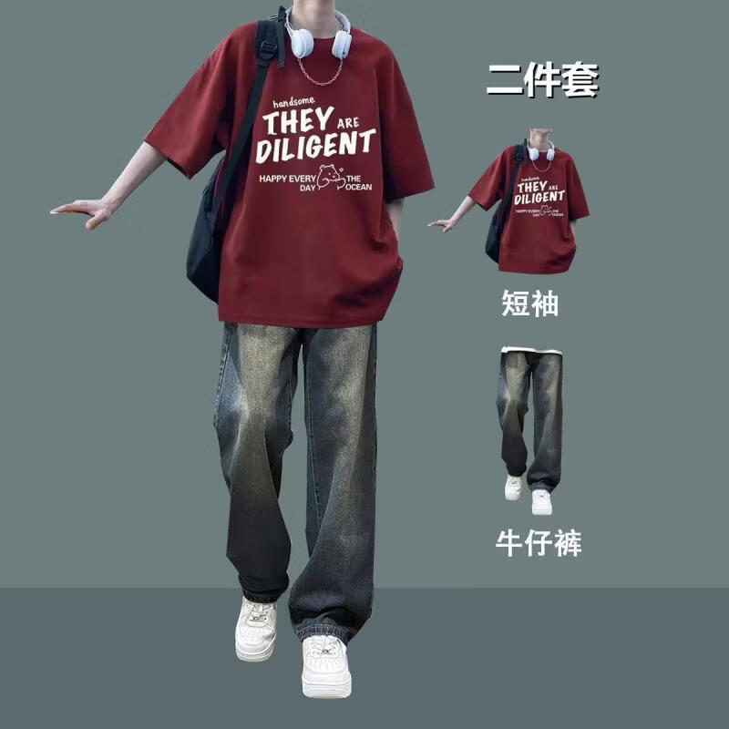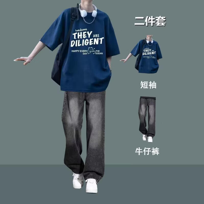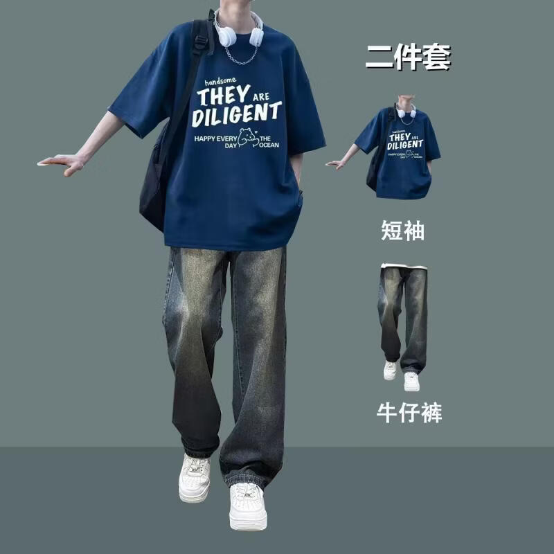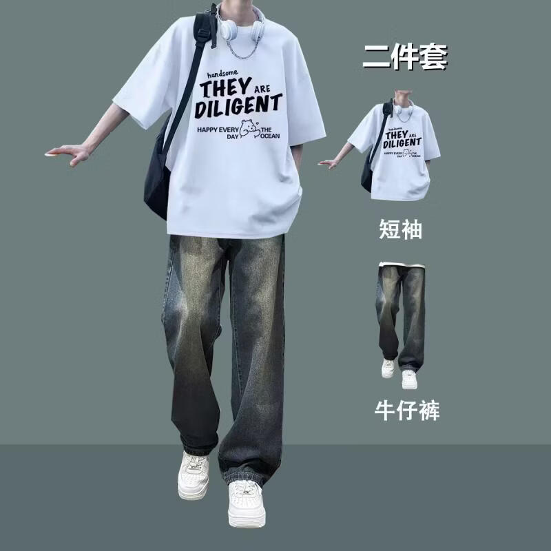 Playboy (PLAYBOY) summer boys' Hong Kong style loose short-sleeved T-shirts for teenagers with trendy jeans men's handsome casual suits 2 pieces T145 pure cotton T-shirt black + 7013 denim M