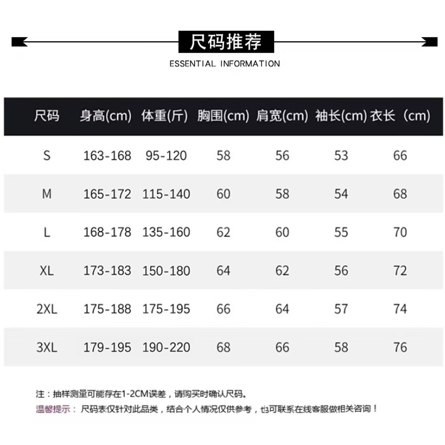 China (cm) 165 / 88-90 170 / 96-98 175 / 108-110 180 / 118-122 185 / 126-130