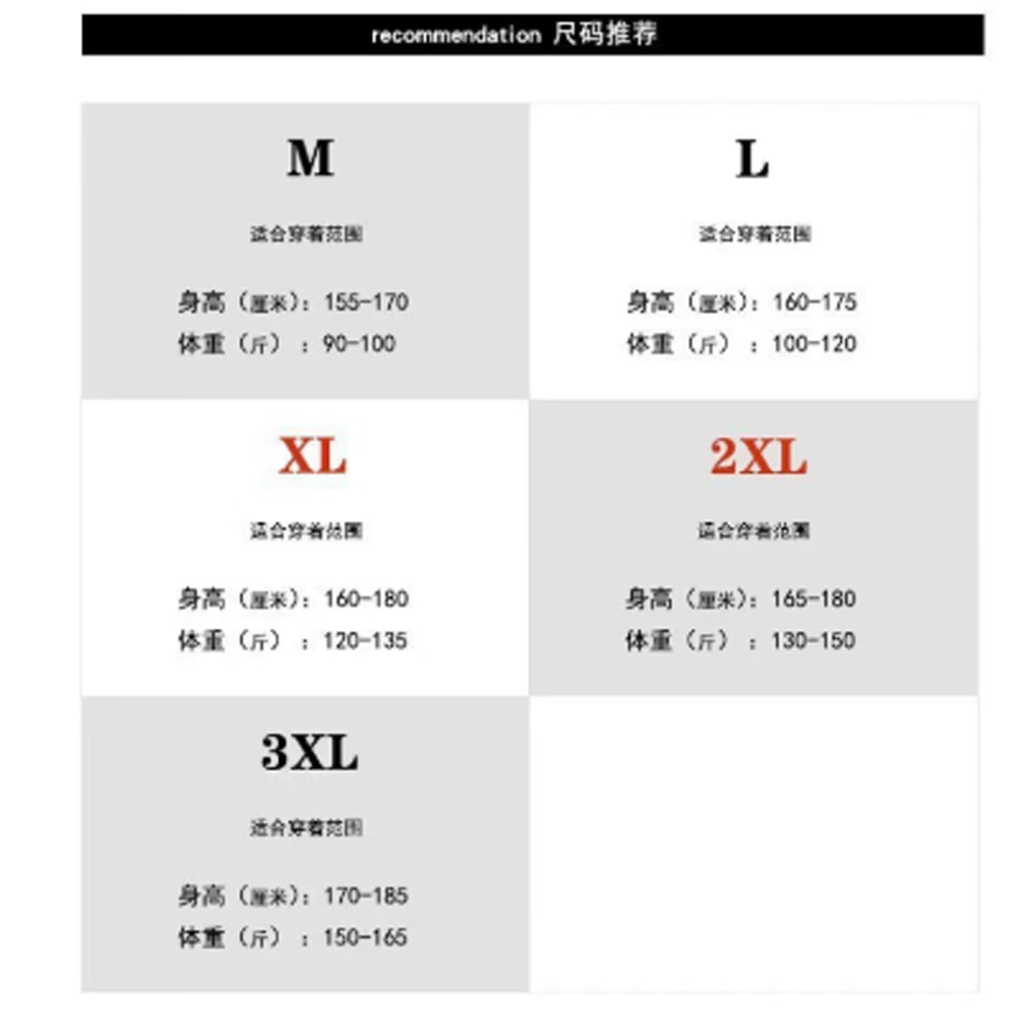 China (cm) 160-165/84-86 165-170 / 88-90 167-172 / 92-96 168-173 / 98-102 170-176 / 106-110