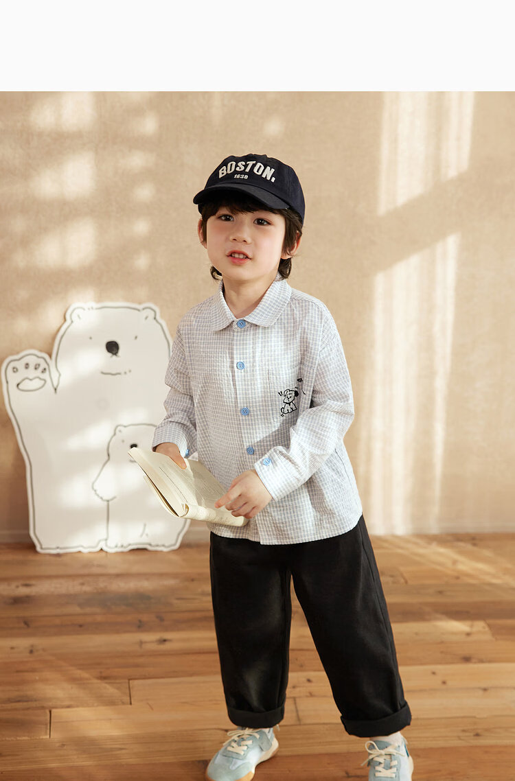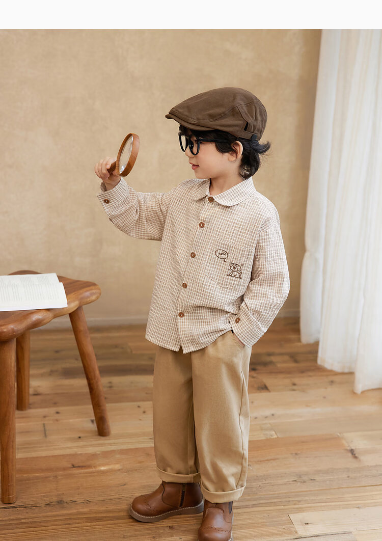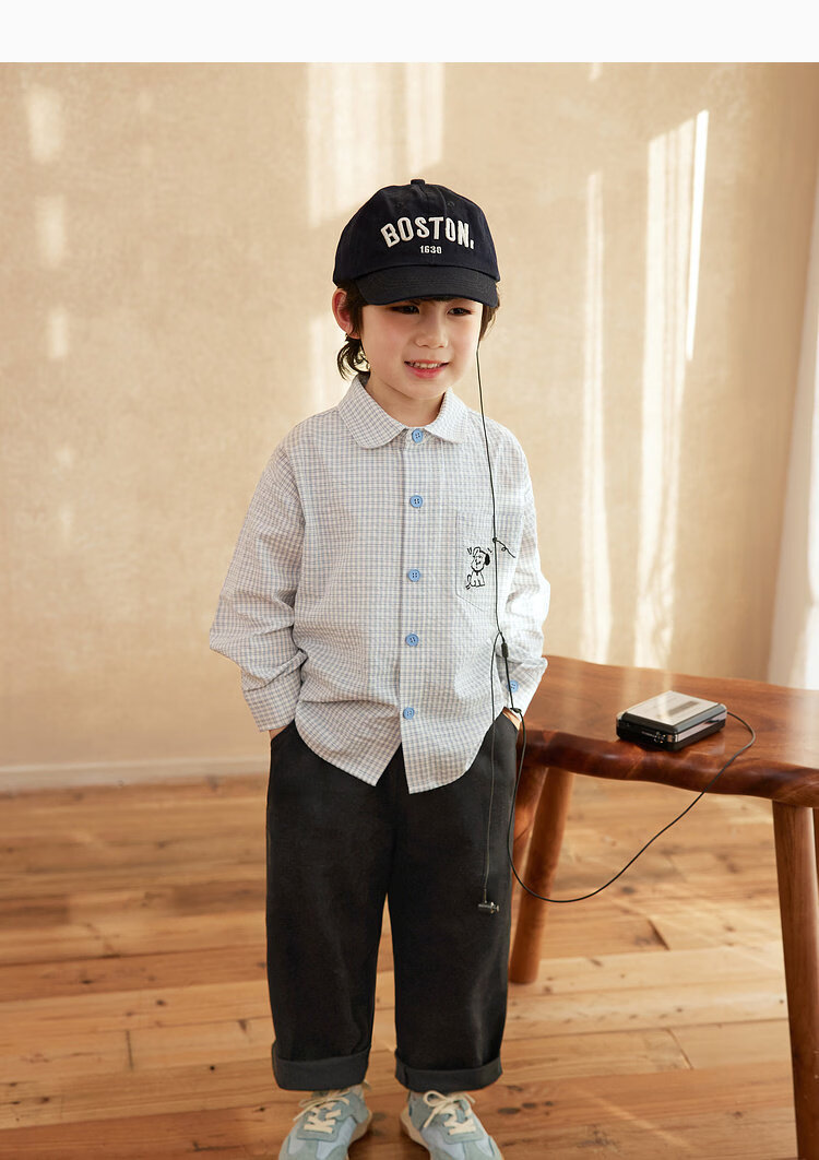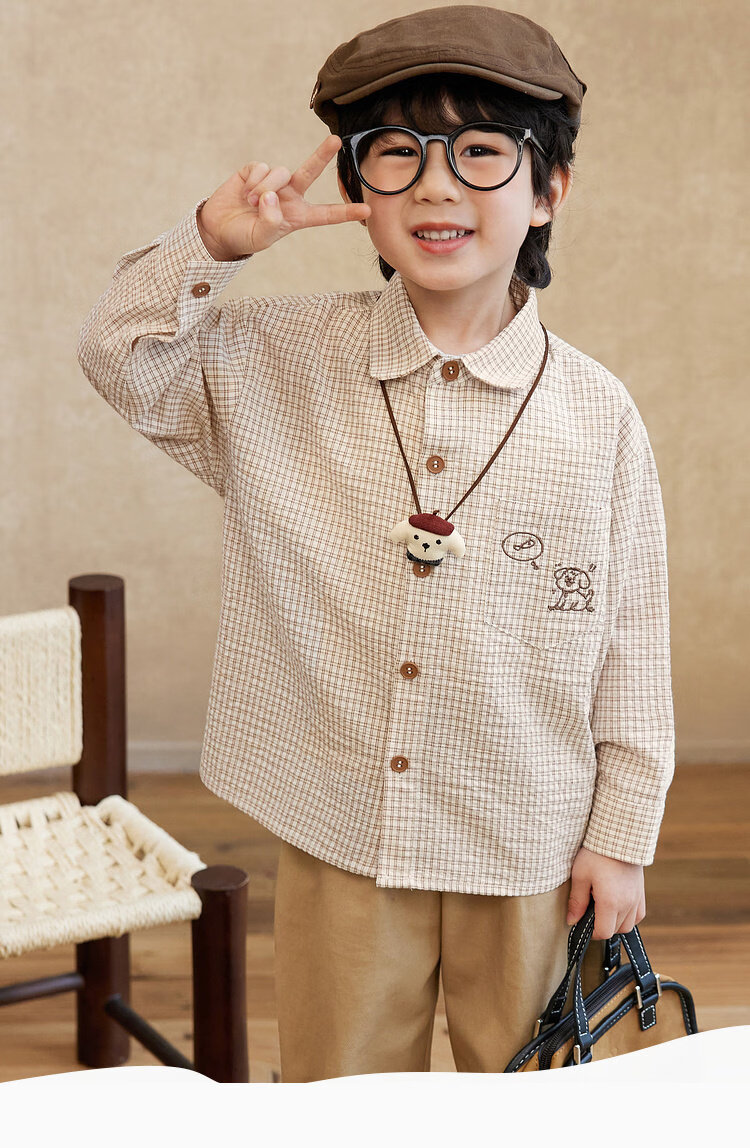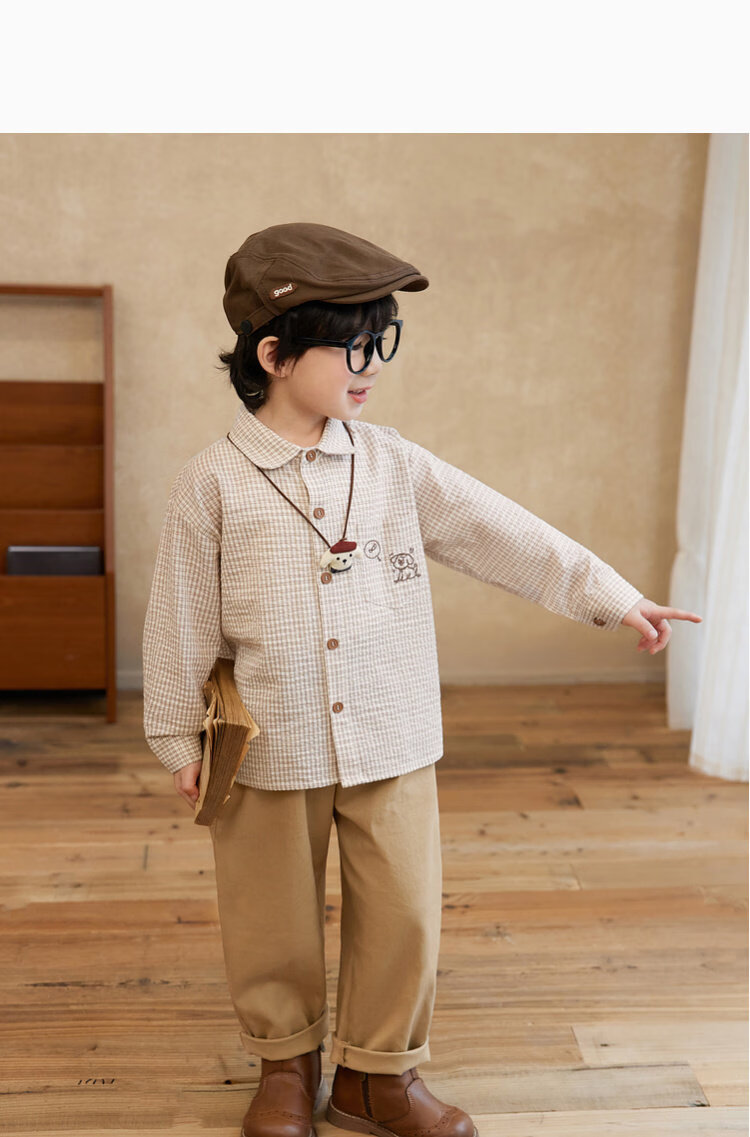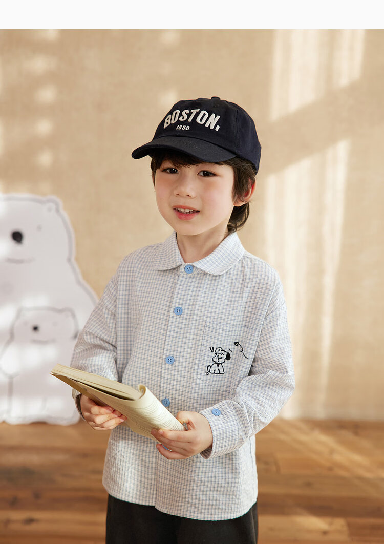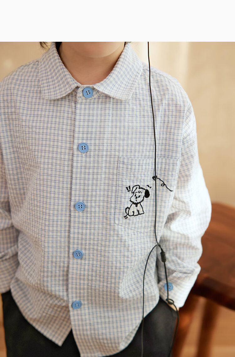 LUSON Boys Classic Plaid Embroidered Shirt 2026 Spring New Cute Retro College Style Top Blue 90