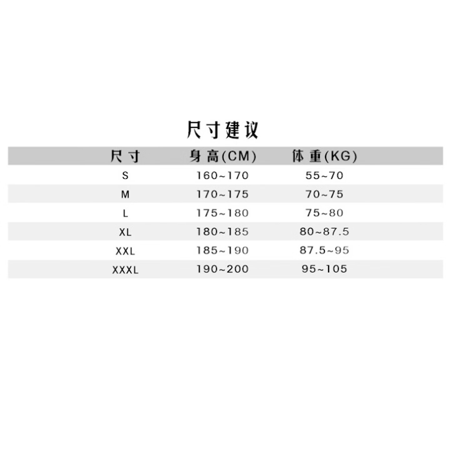 China (cm) 160-165/84-86 165-170 / 88-90 167-172 / 92-96 168-173 / 98-102 170-176 / 106-110
