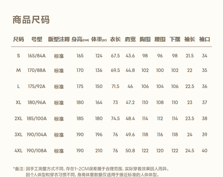 China (cm) 165 / 88-90 170 / 96-98 175 / 108-110 180 / 118-122 185 / 126-130