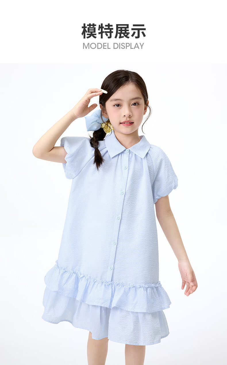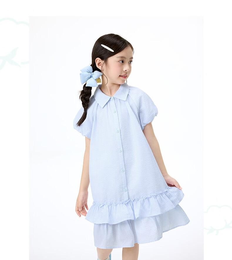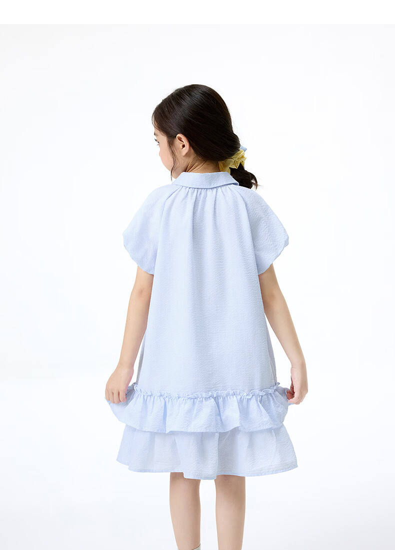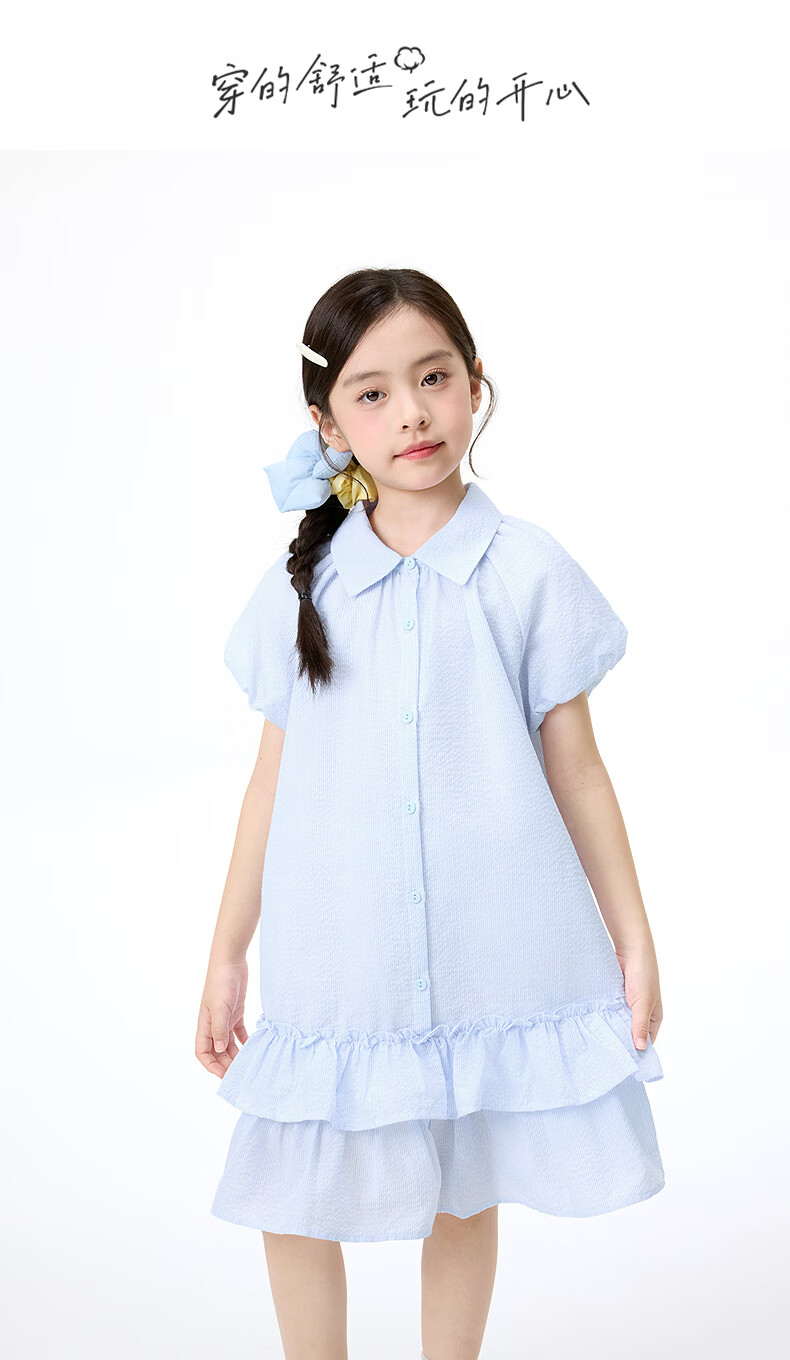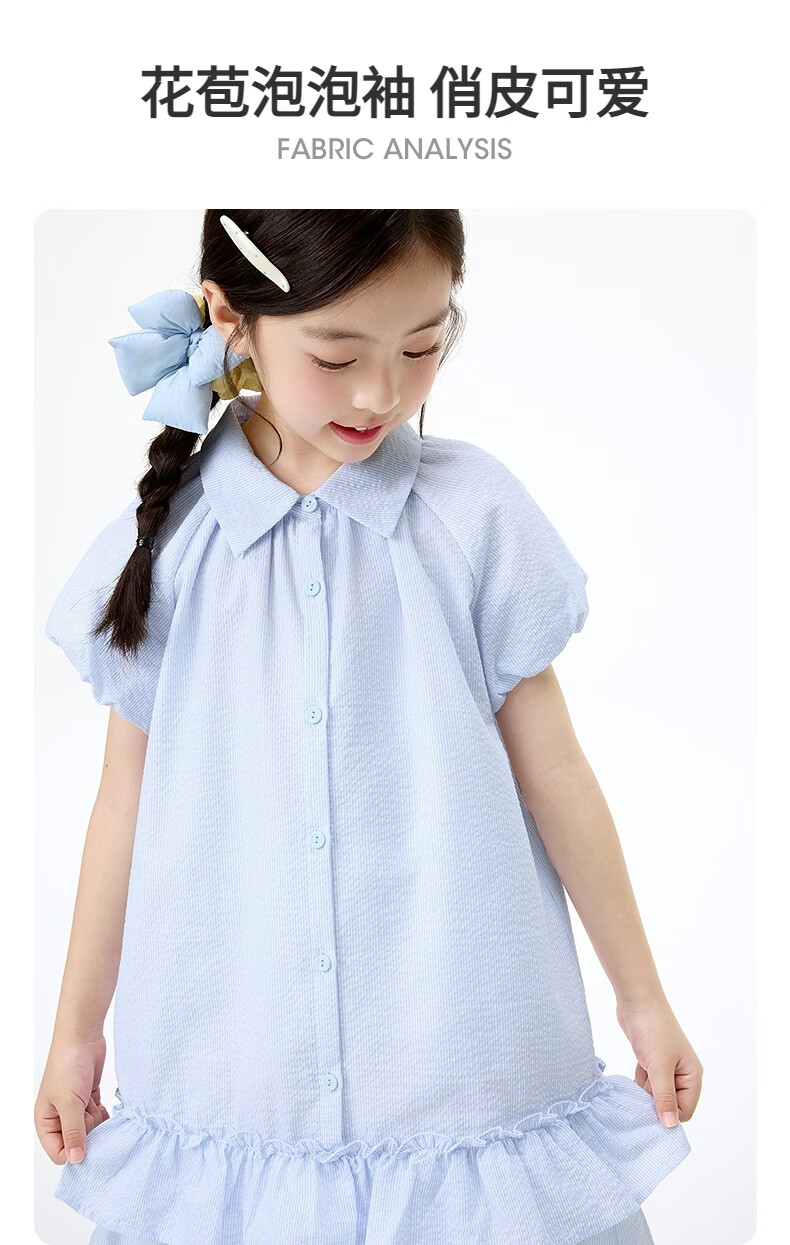 Xiaoyinman children's clothing girls cute puff sleeve dress 26 mid-summer big children's shirt lapel comfortable casual skirt blue strip 110