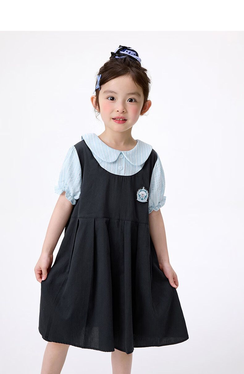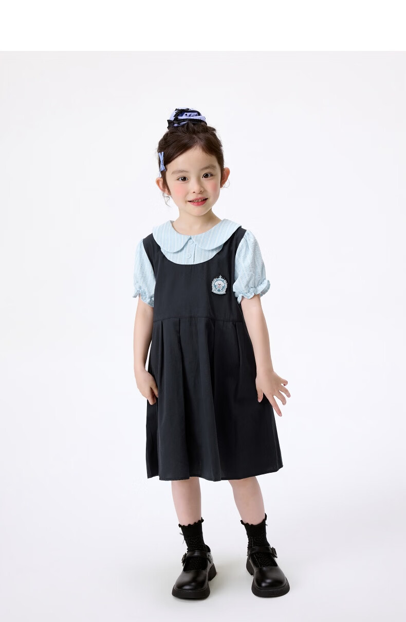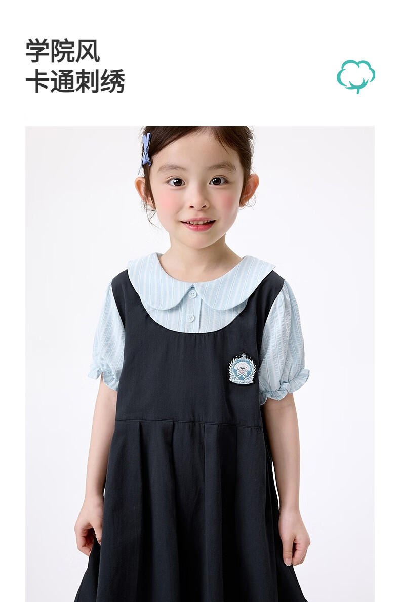 Xiaoyinman girls fake two-piece dress college style cartoon embroidery 26 summer dress fashionable and sweet doll collar suspender skirt navy 105