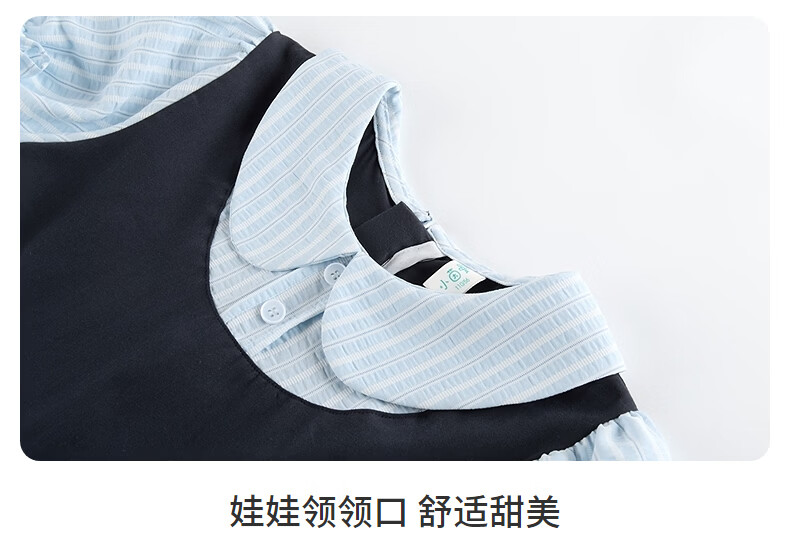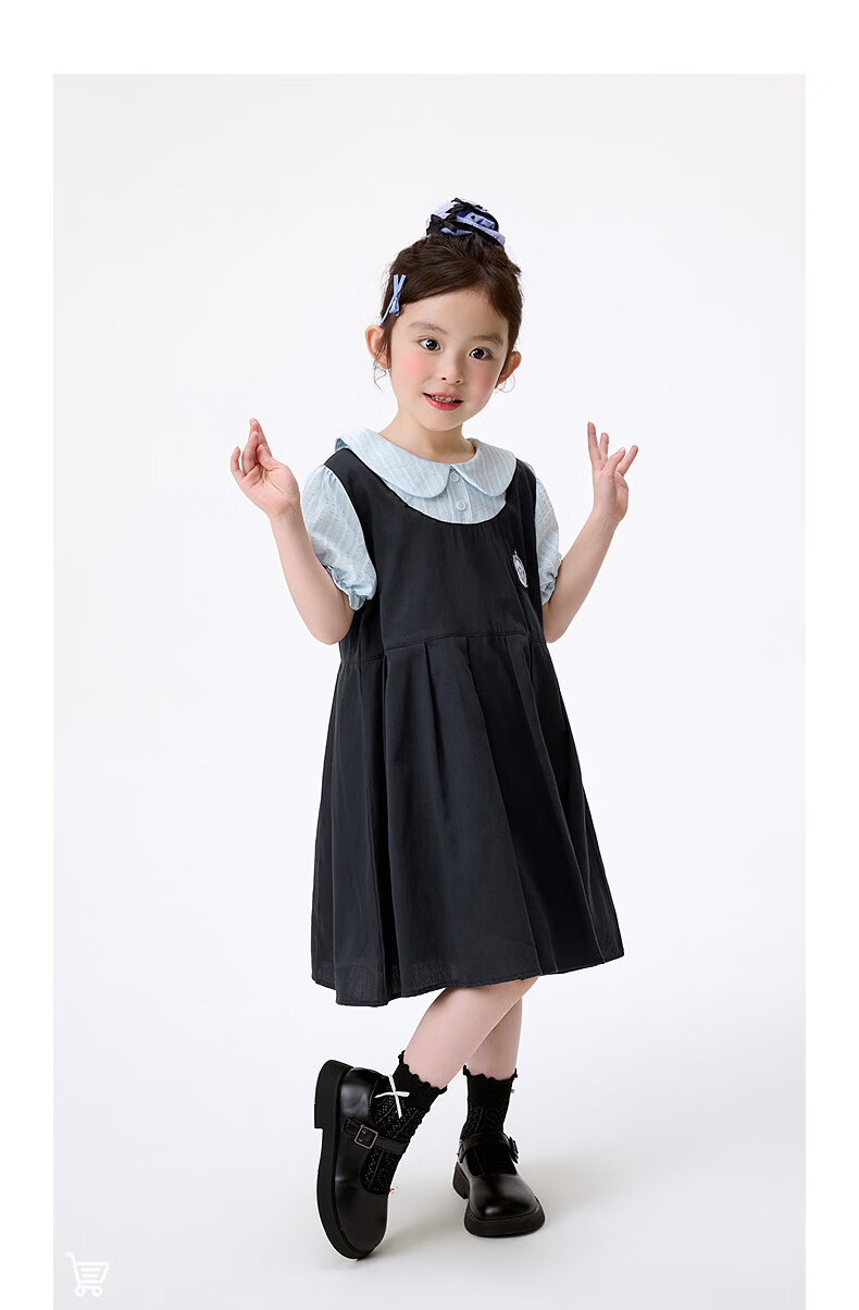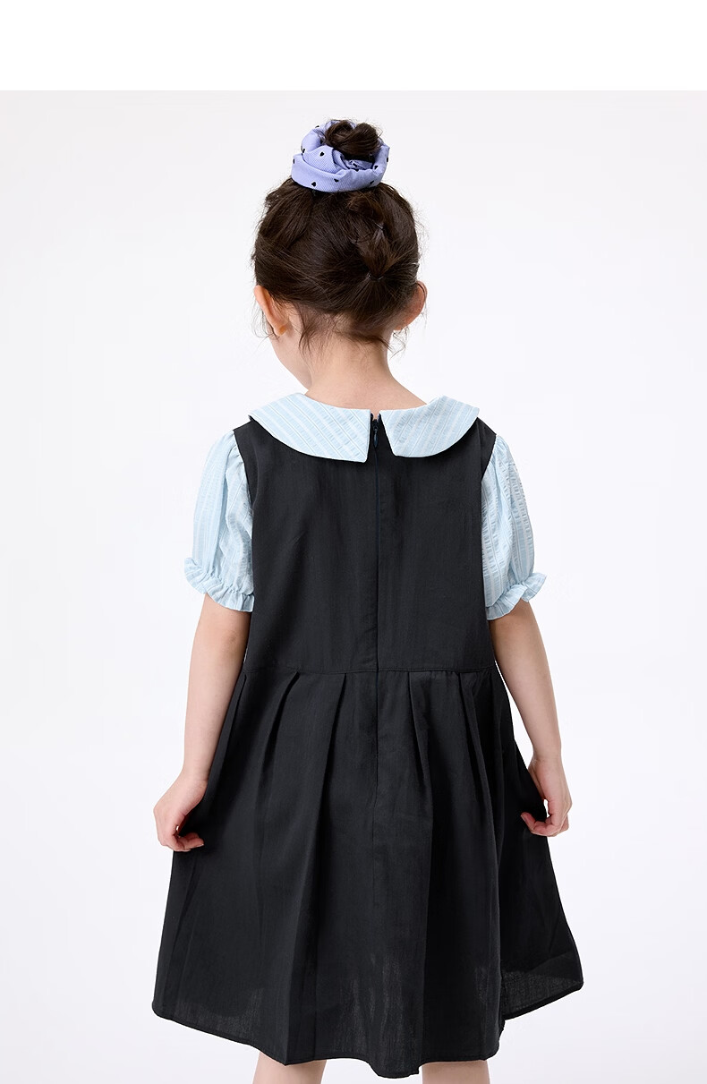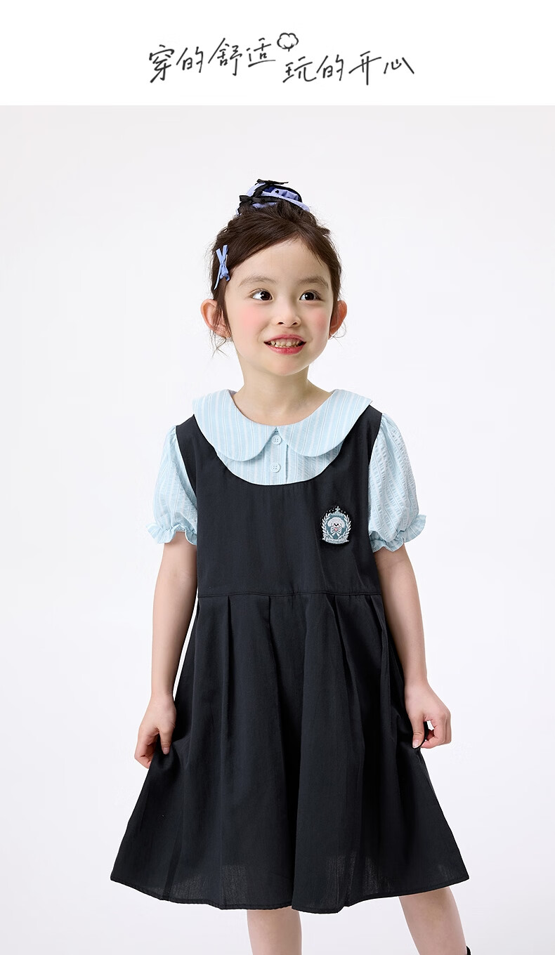 Xiaoyinman girls fake two-piece dress college style cartoon embroidery 26 summer dress fashionable and sweet doll collar suspender skirt navy 105