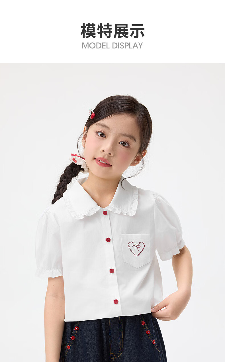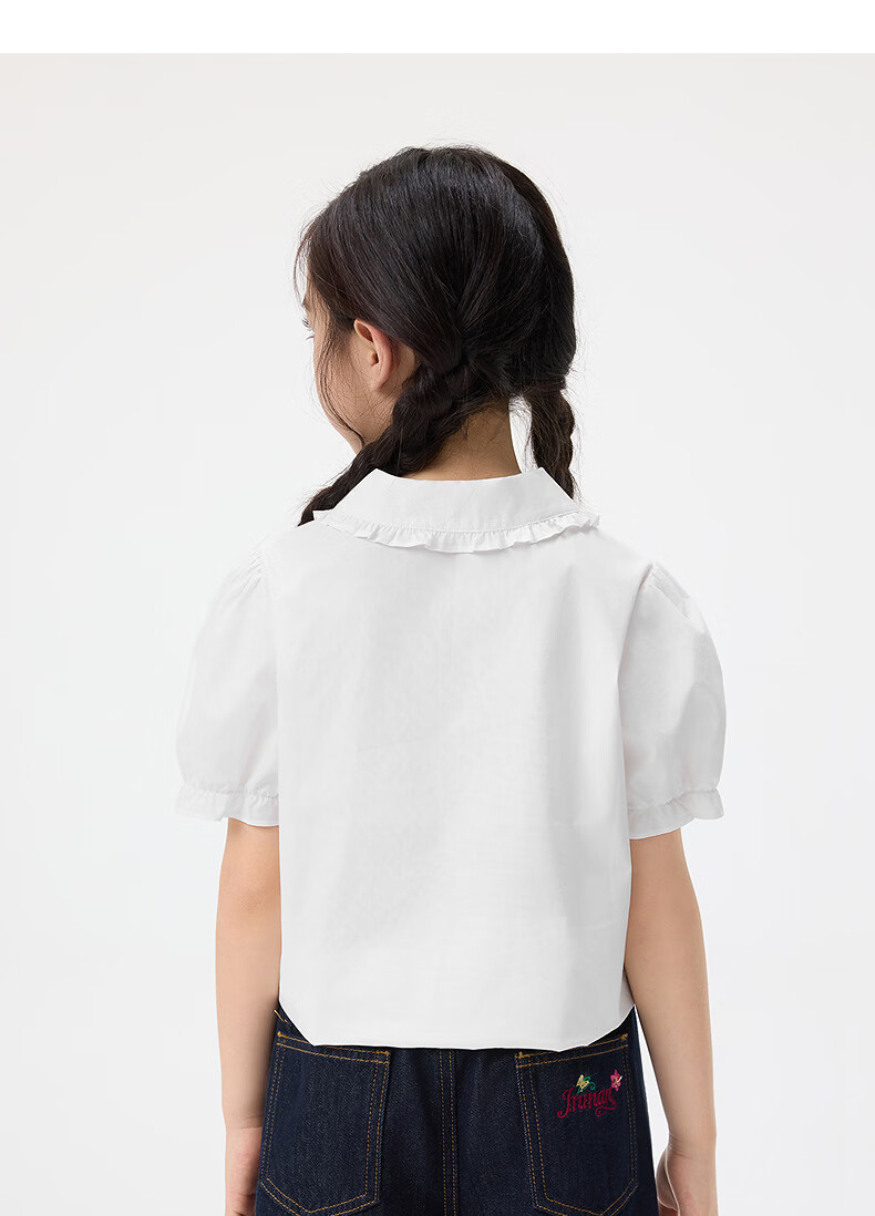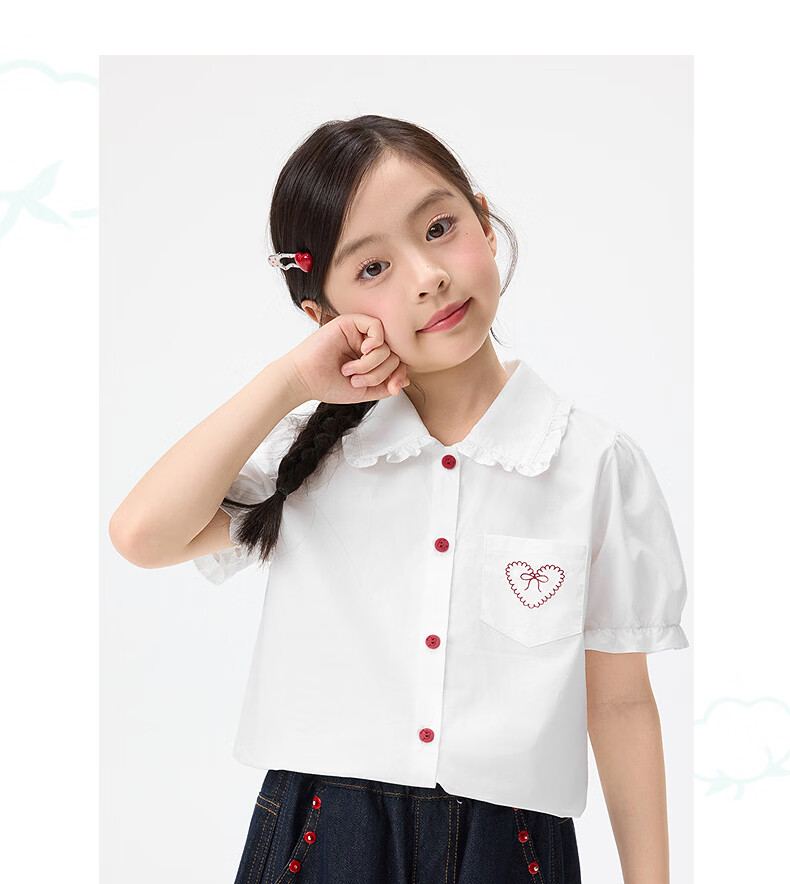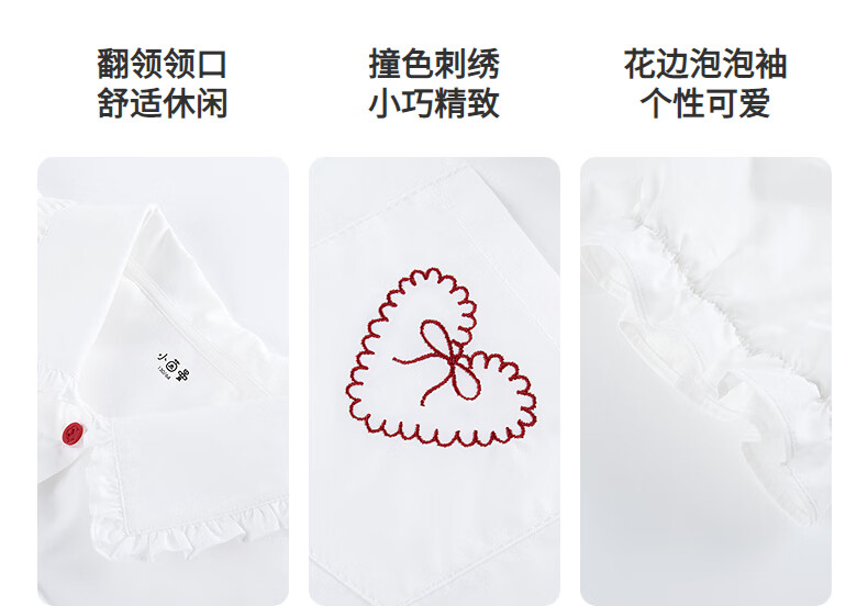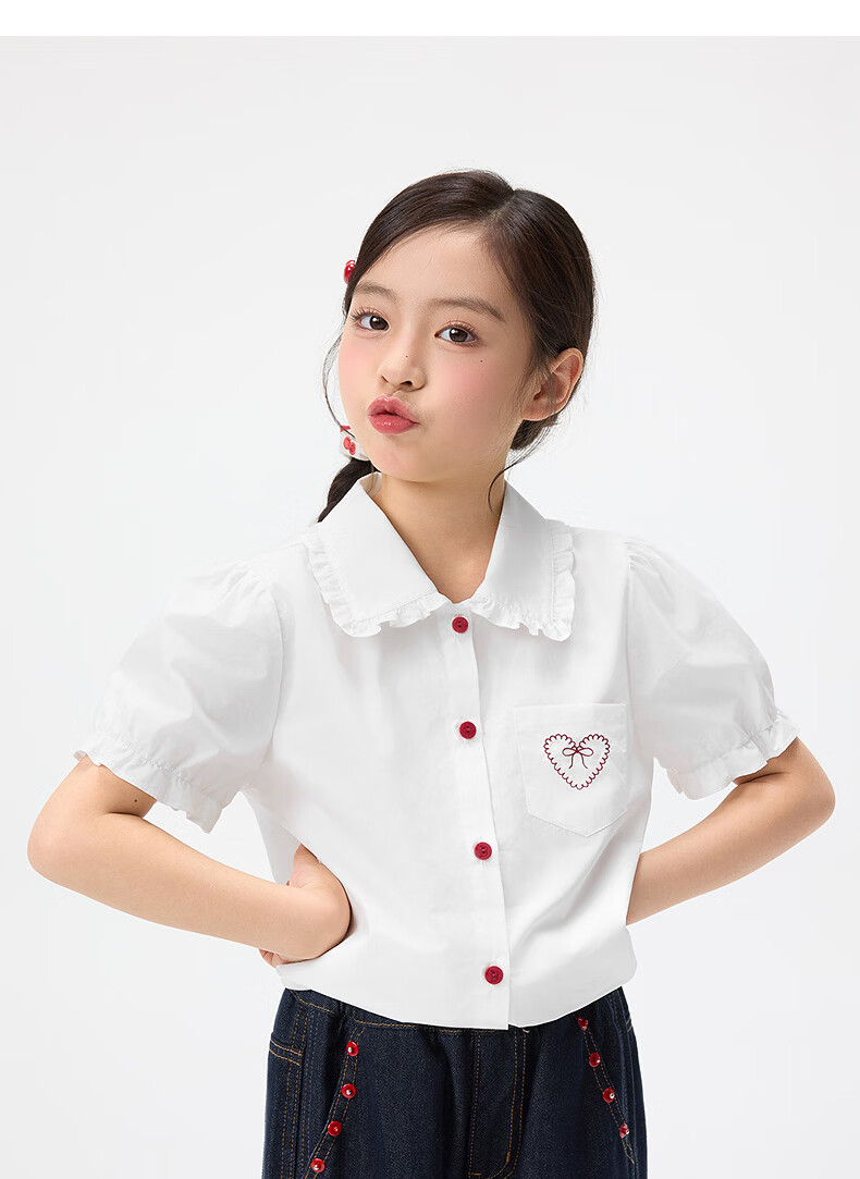 Xiaoyinman children's clothing girls' puff sleeve pure cotton shirt with love embroidery 26 spring fashion lapel top for big children, white 120