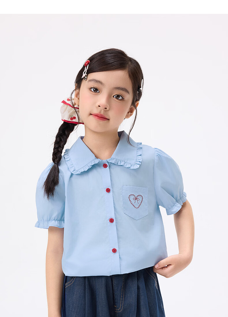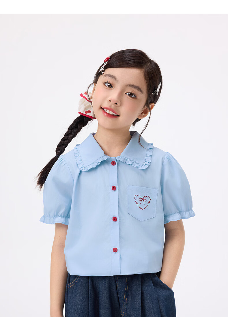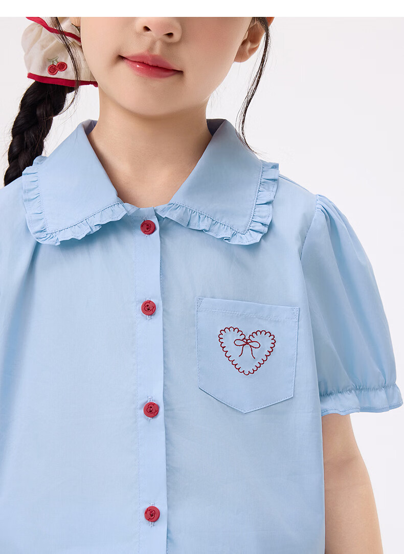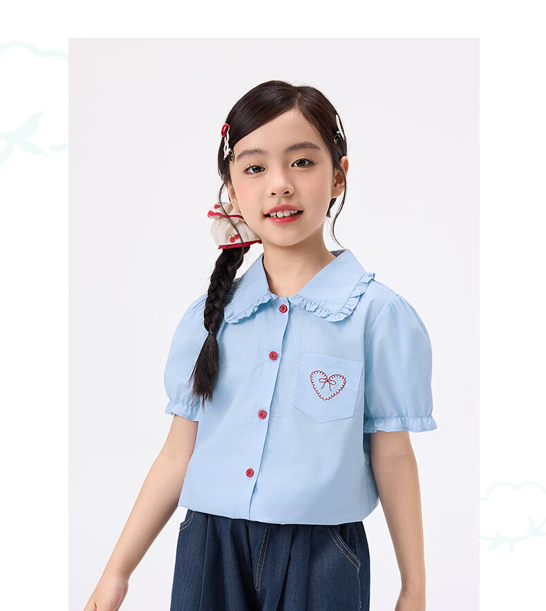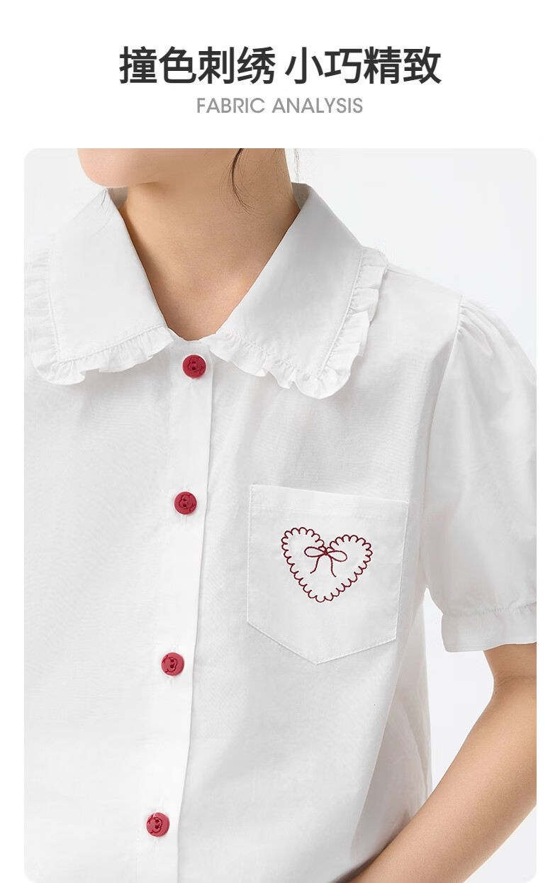 Xiaoyinman children's clothing girls' puff sleeve pure cotton shirt with love embroidery 26 spring fashion lapel top for big children, white 120