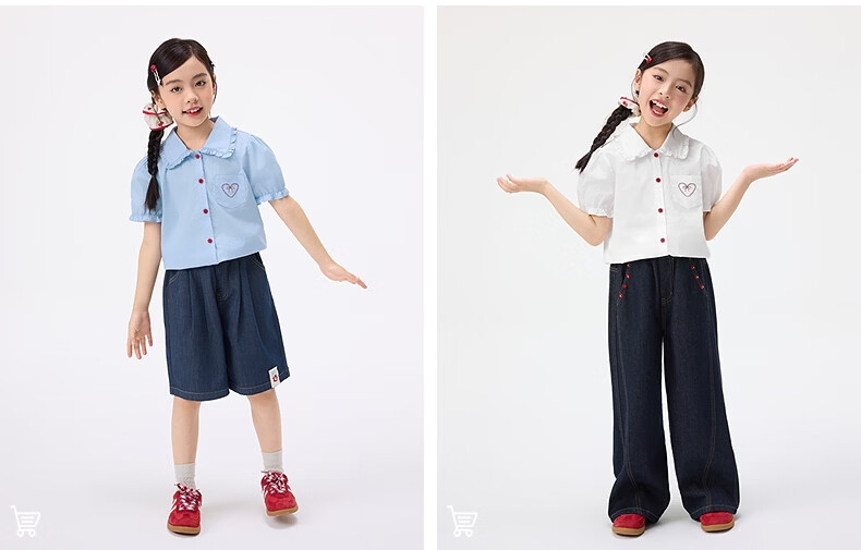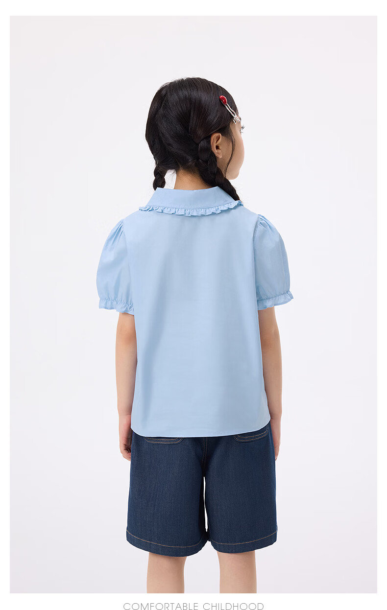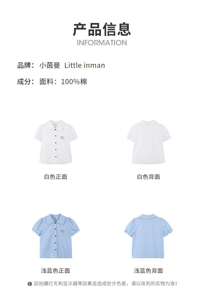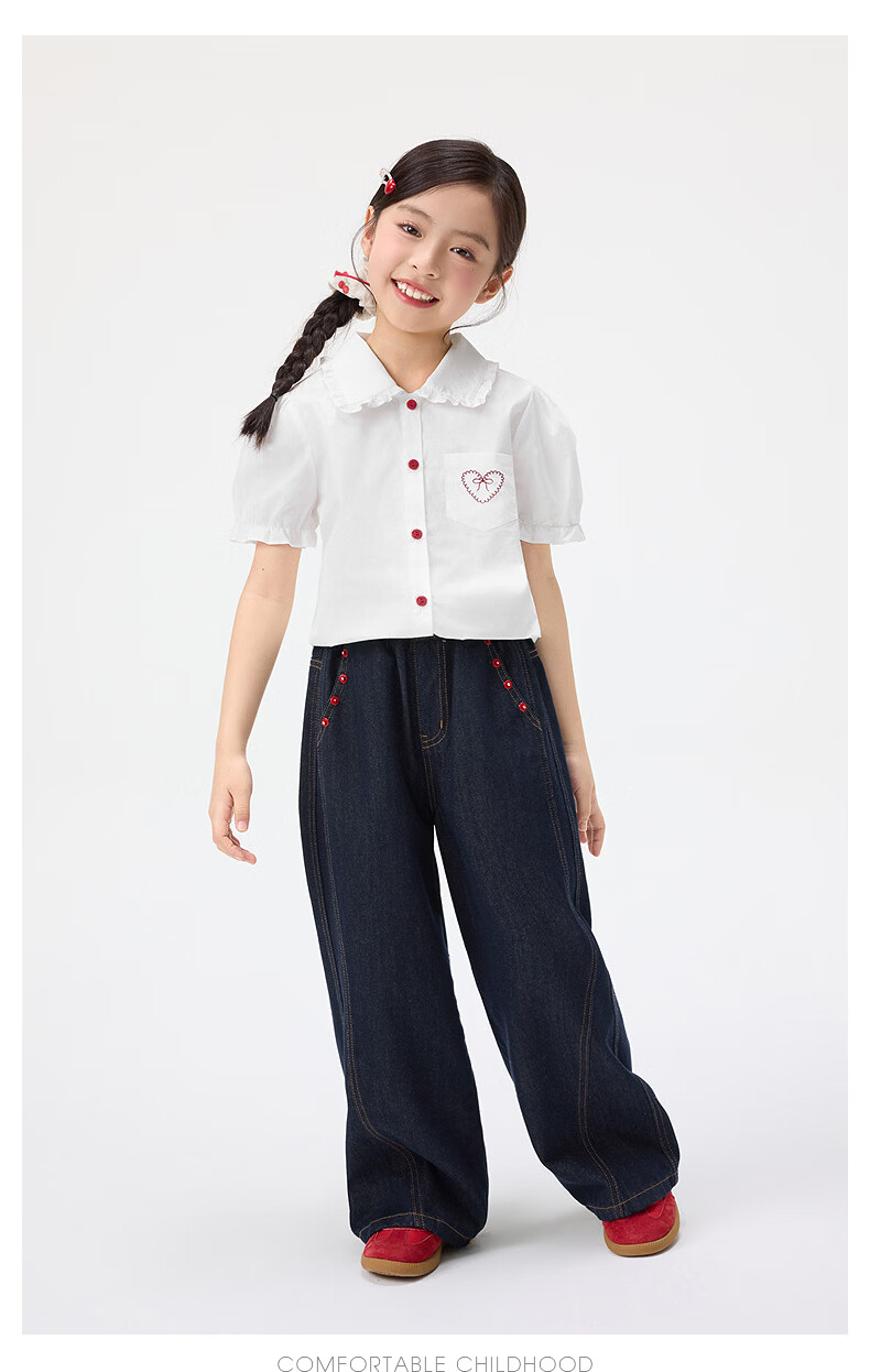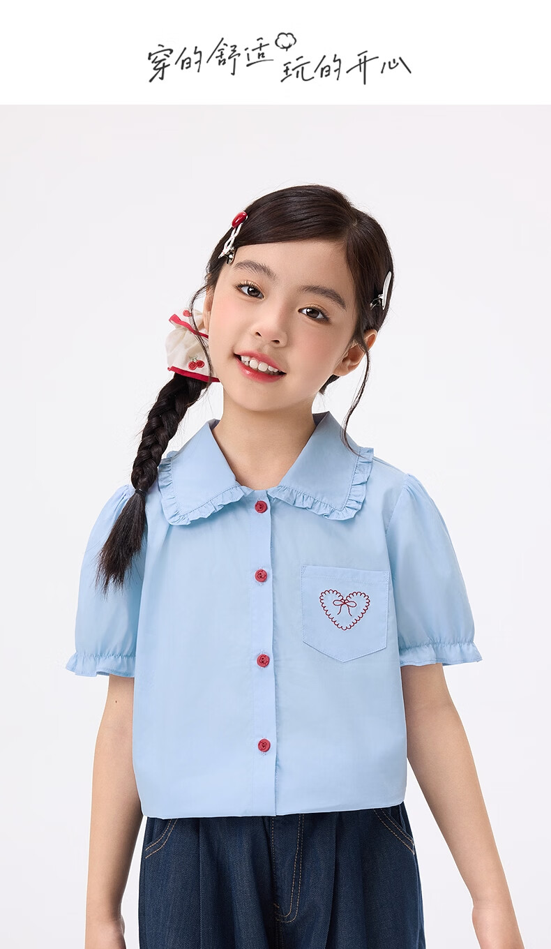Xiaoyinman children's clothing girls' puff sleeve pure cotton shirt with love embroidery 26 spring fashion lapel top for big children, white 120