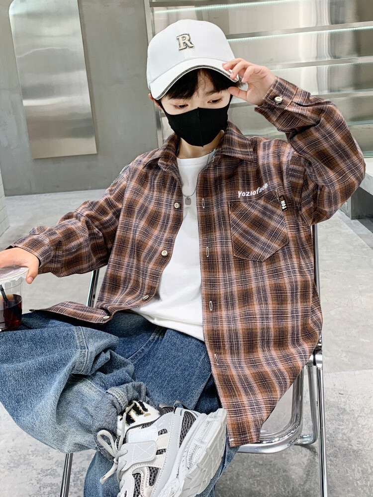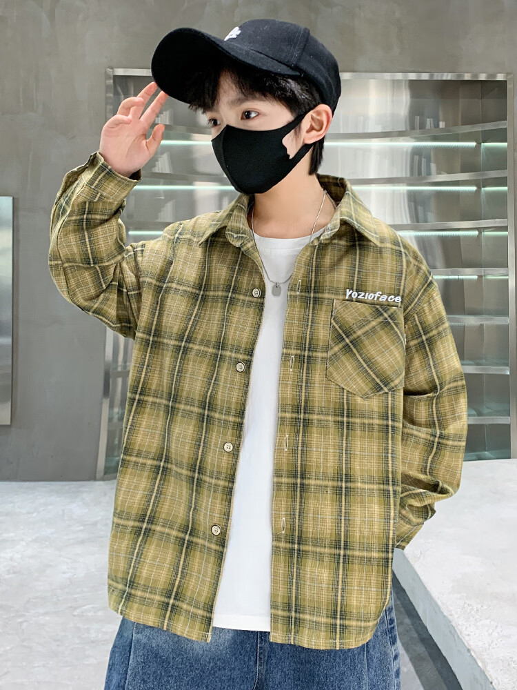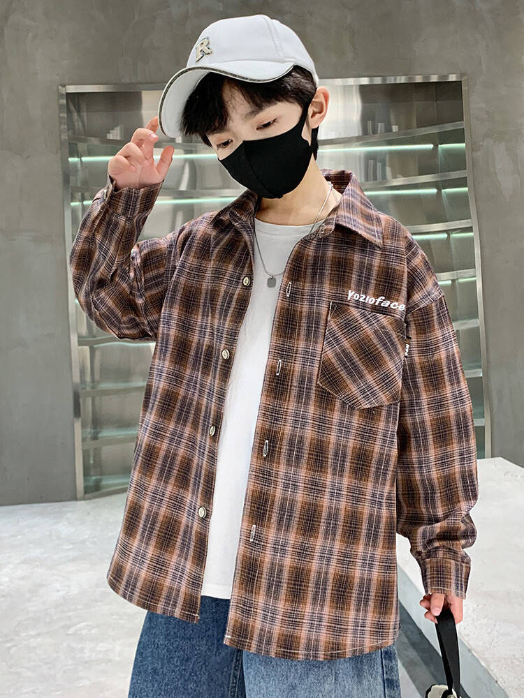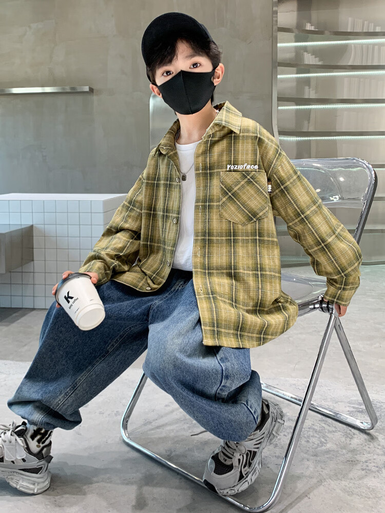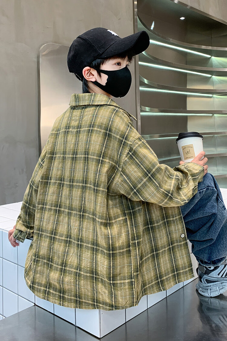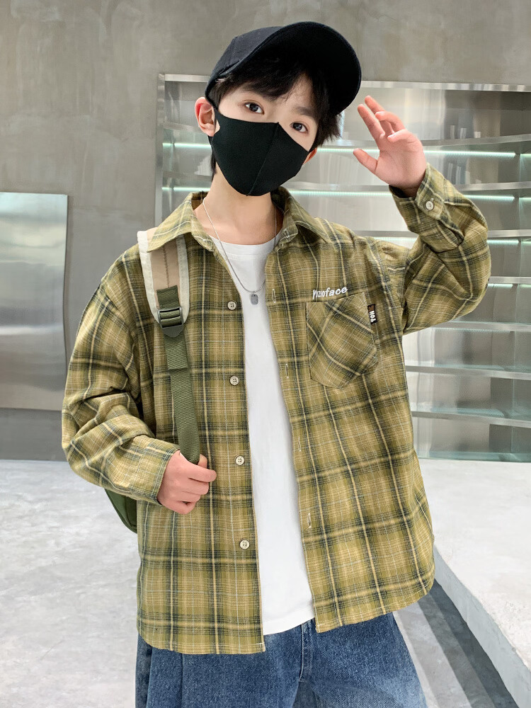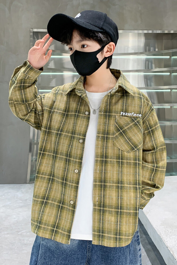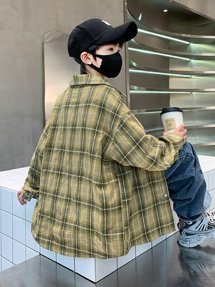 Boys' shirt jacket spring and autumn 2026 new medium and large children's autumn boys' autumn clothing children's handsome plaid shirt yellow 120 cm