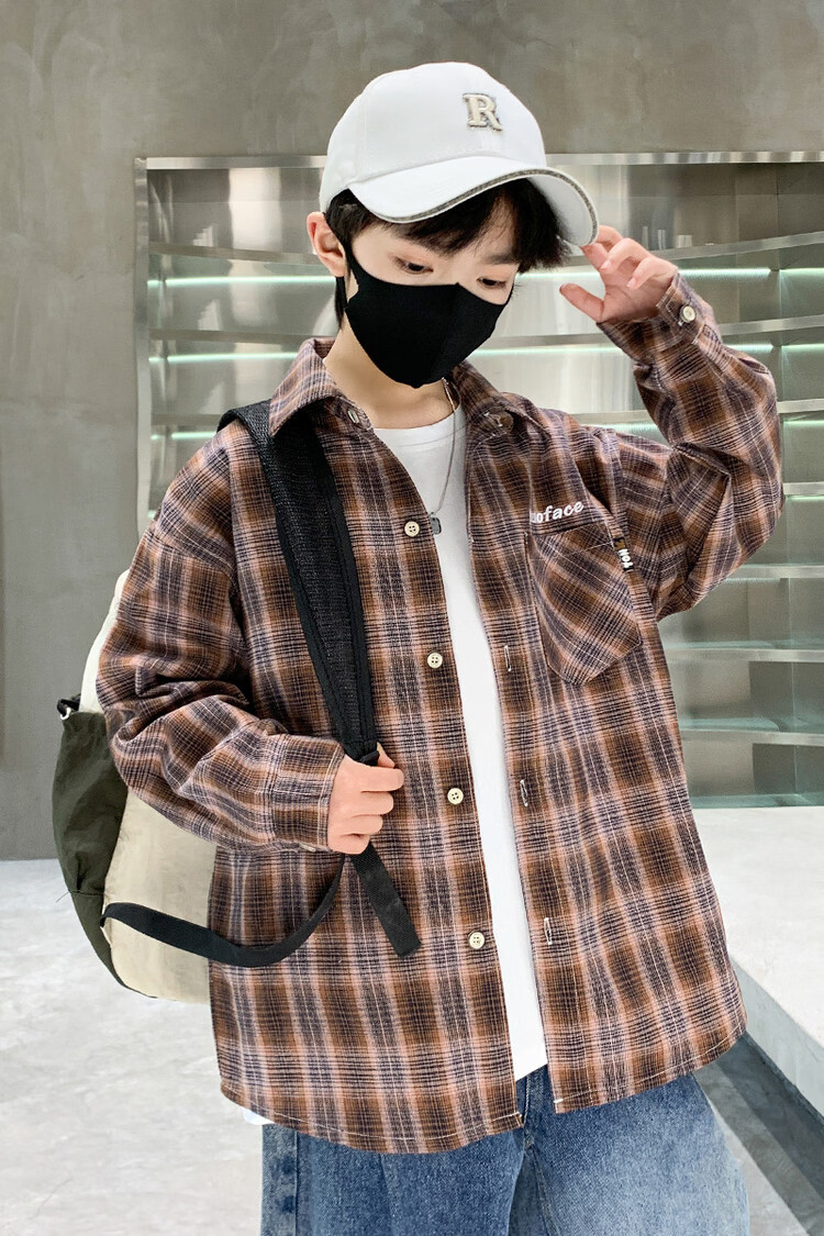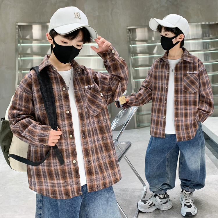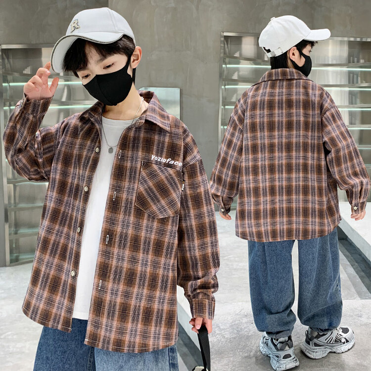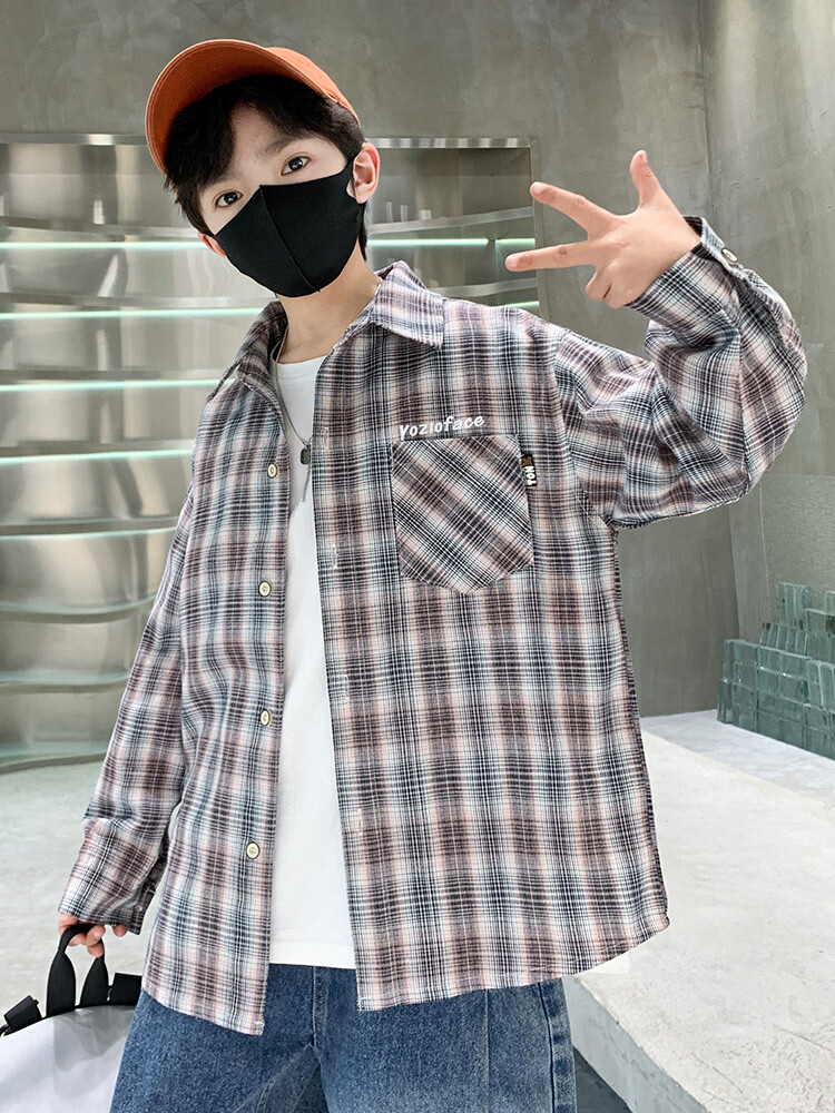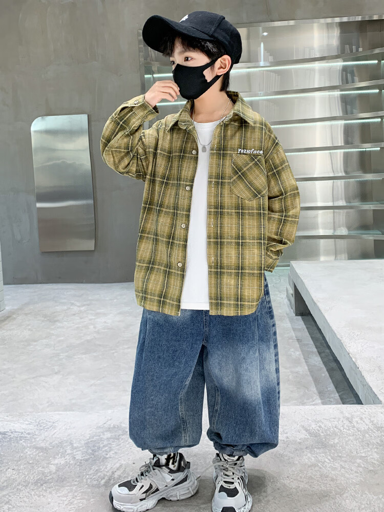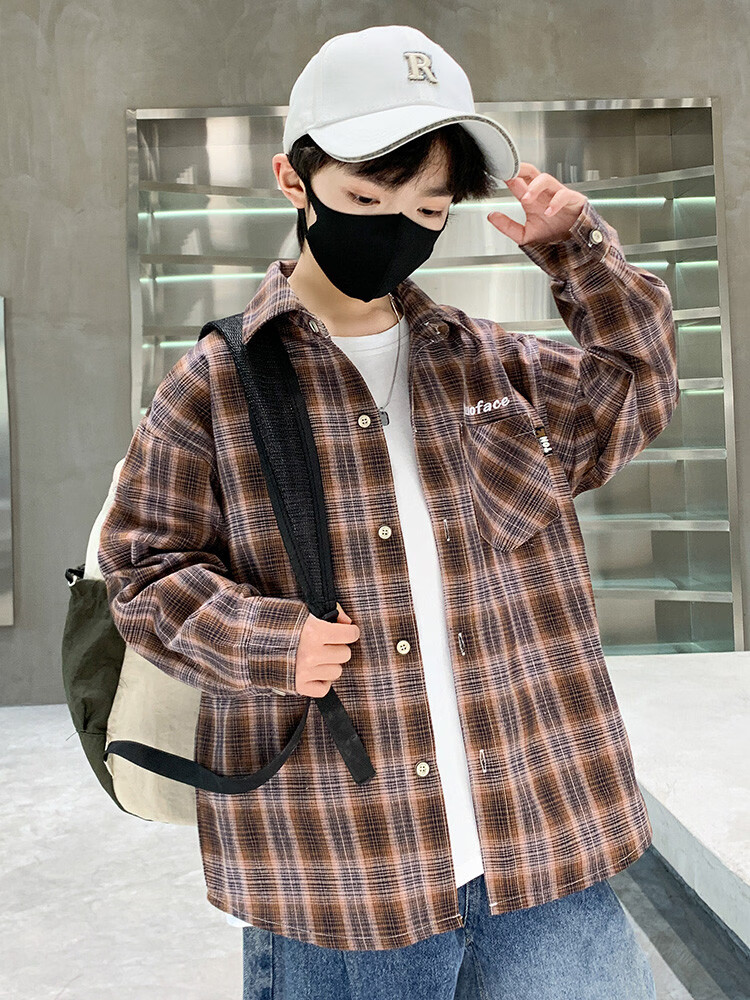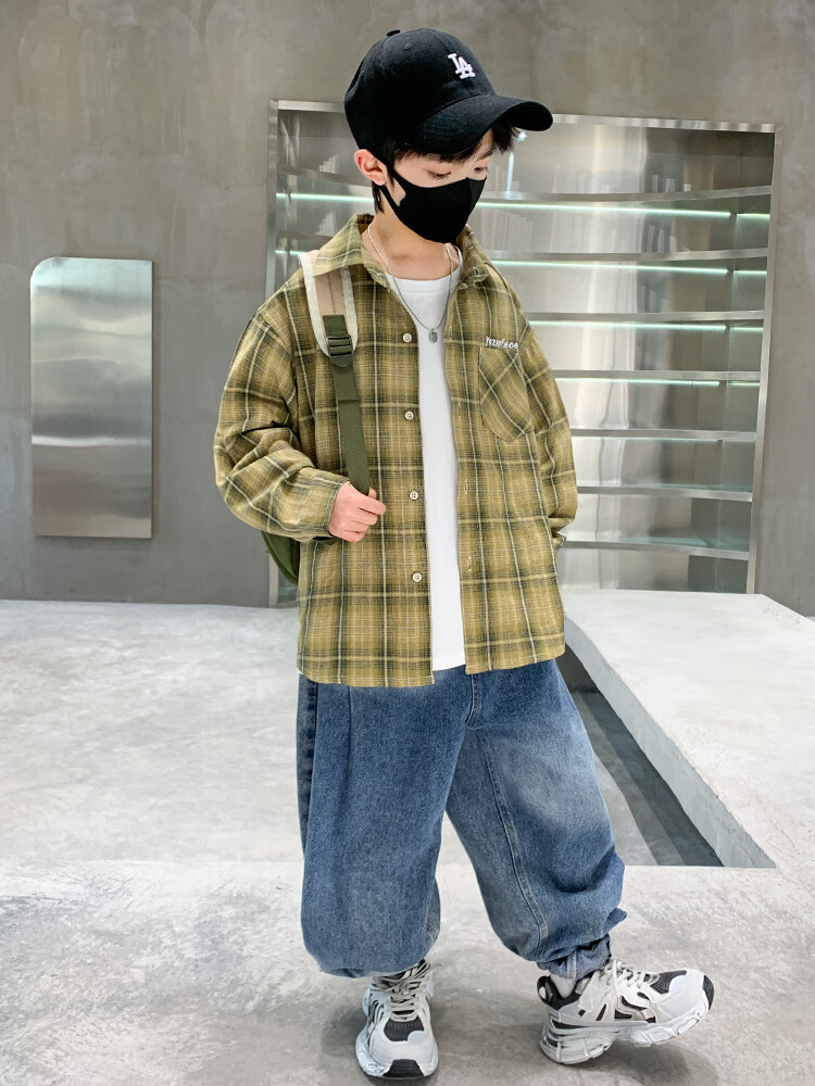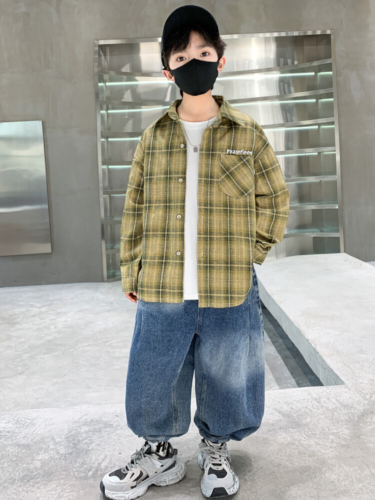 Boys' shirt jacket spring and autumn 2026 new medium and large children's autumn boys' autumn clothing children's handsome plaid shirt yellow 120 cm