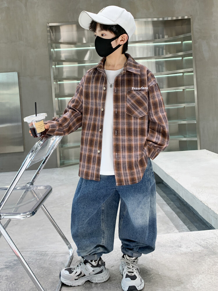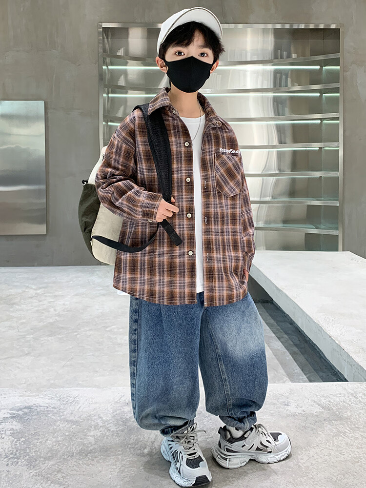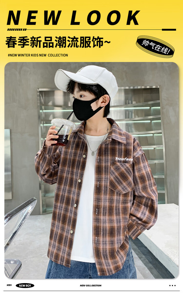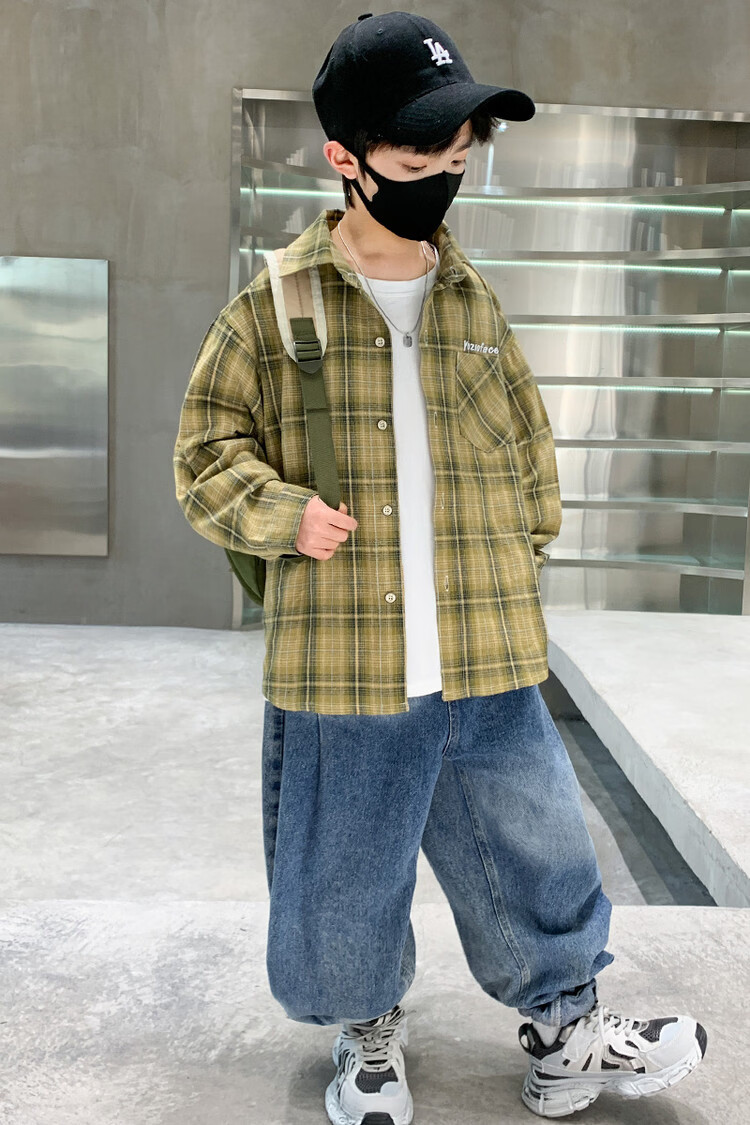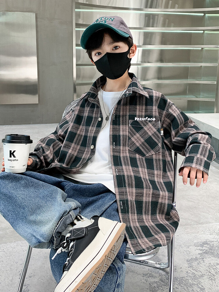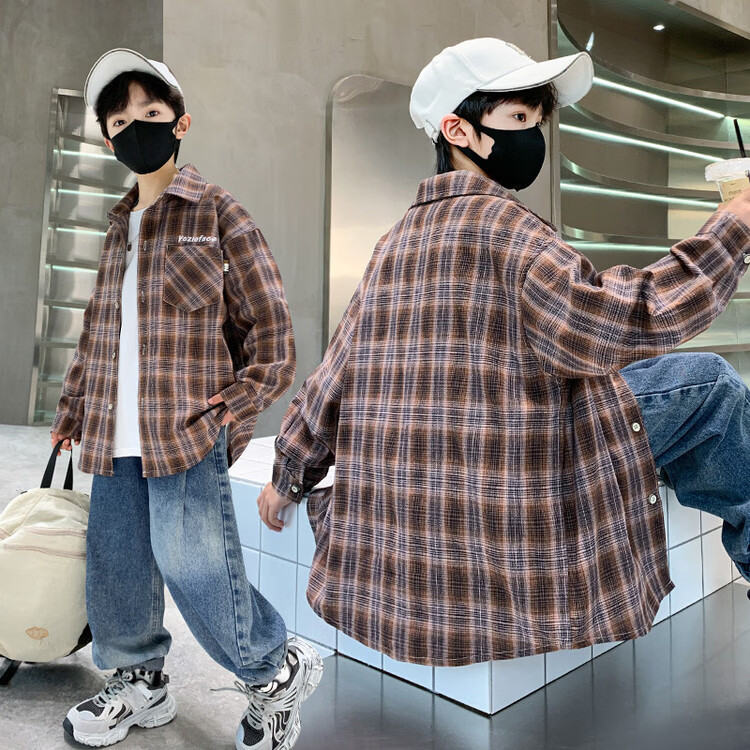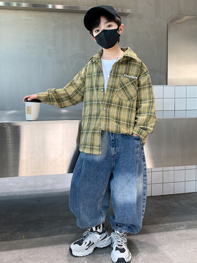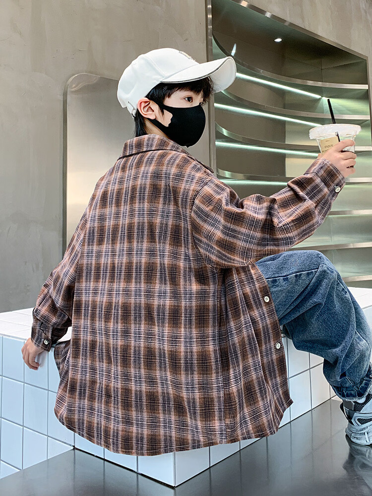 Boys' shirt jacket spring and autumn 2026 new medium and large children's autumn boys' autumn clothing children's handsome plaid shirt yellow 120 cm