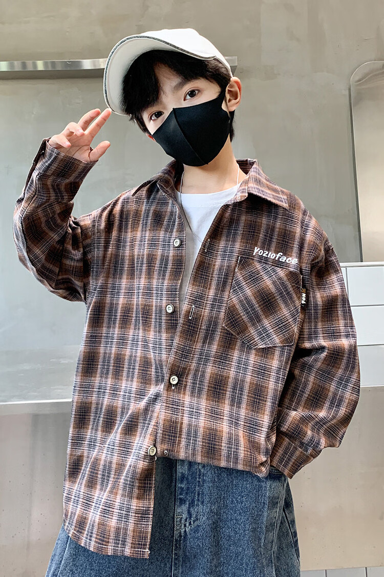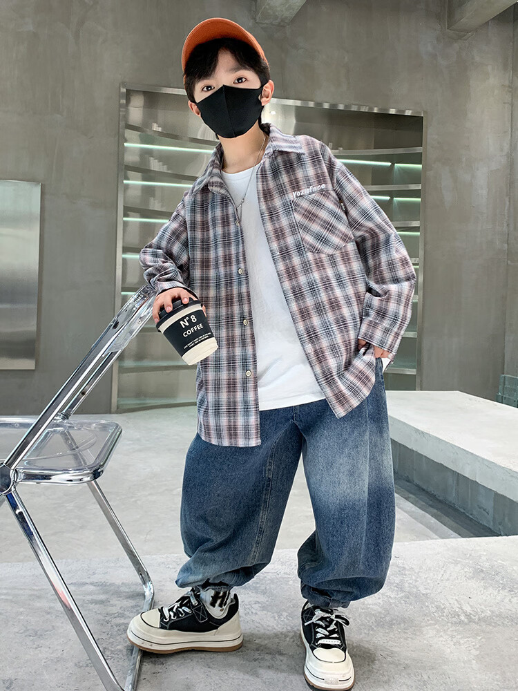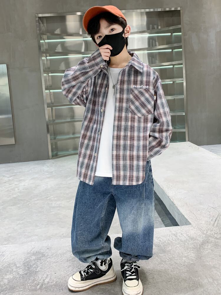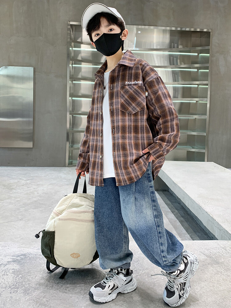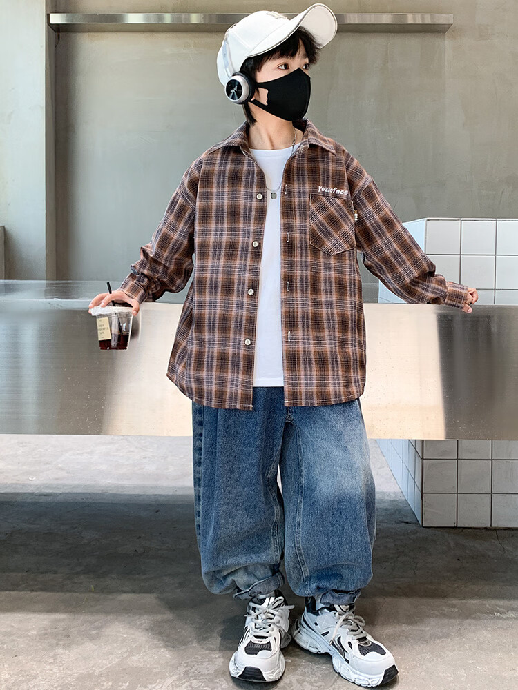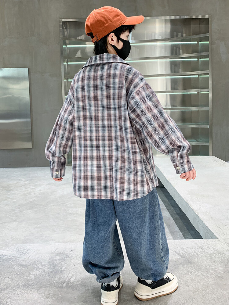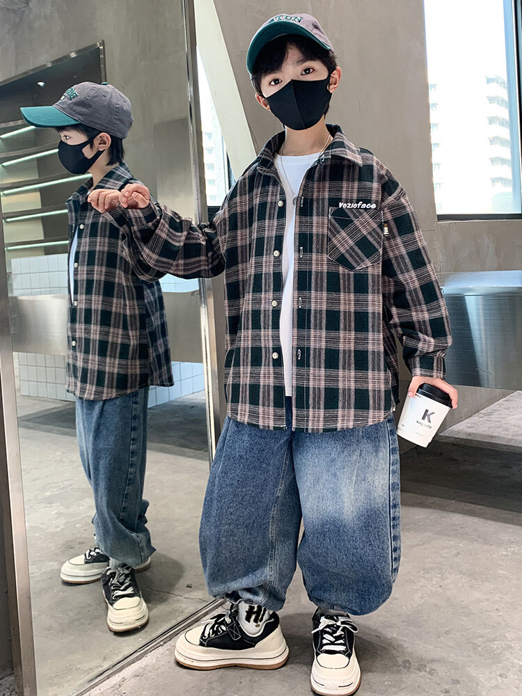 Boys' shirt jacket spring and autumn 2026 new medium and large children's autumn boys' autumn clothing children's handsome plaid shirt yellow 120 cm