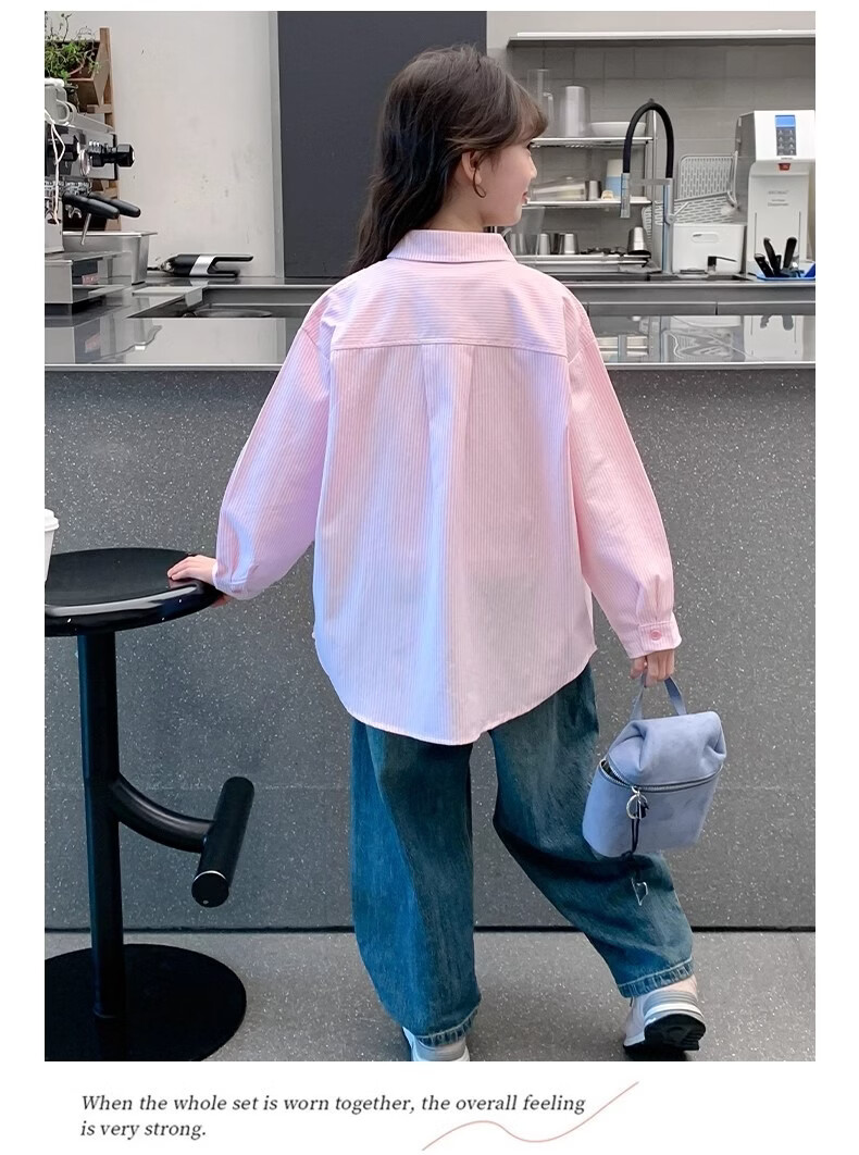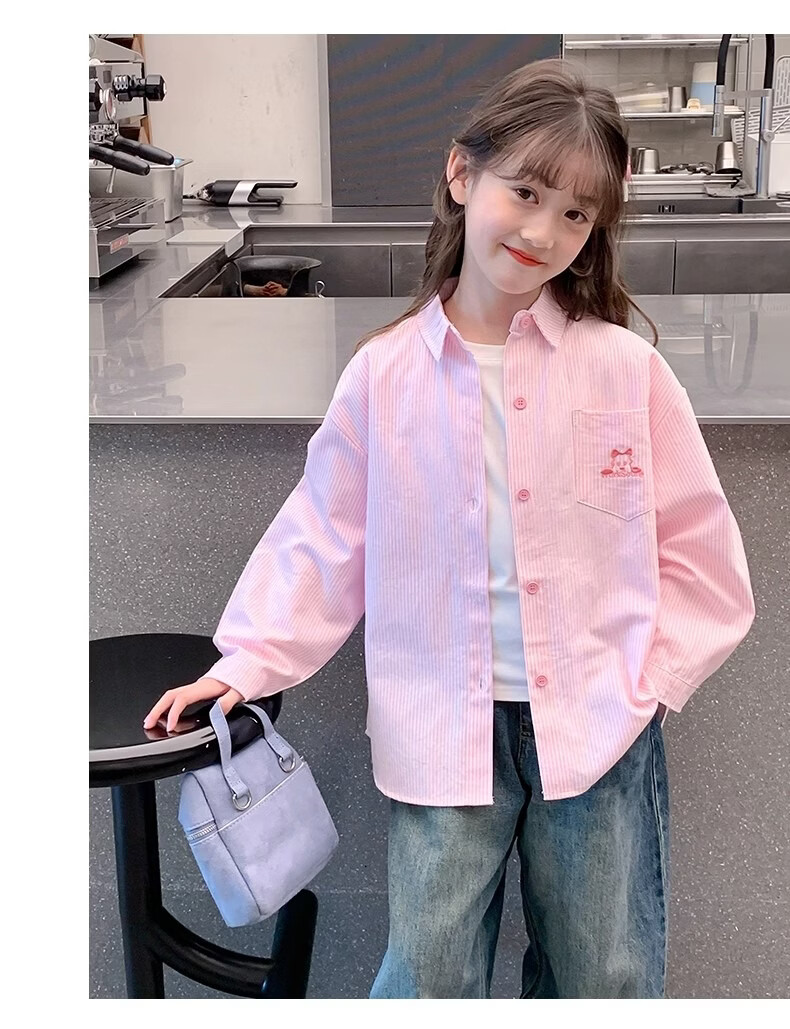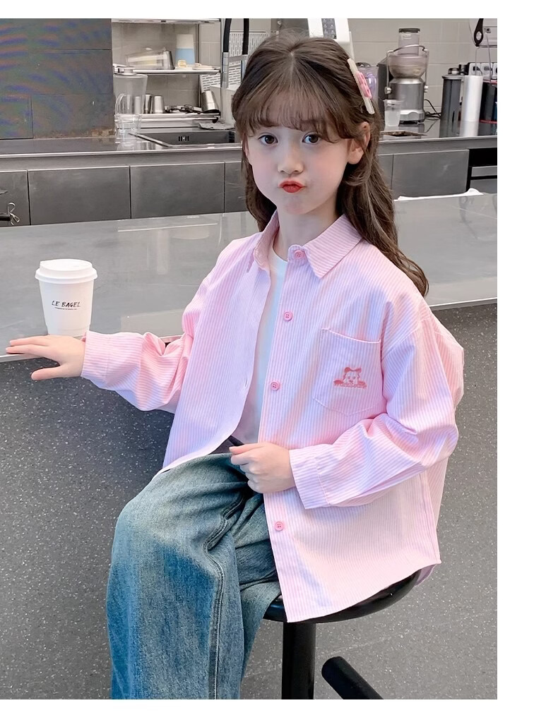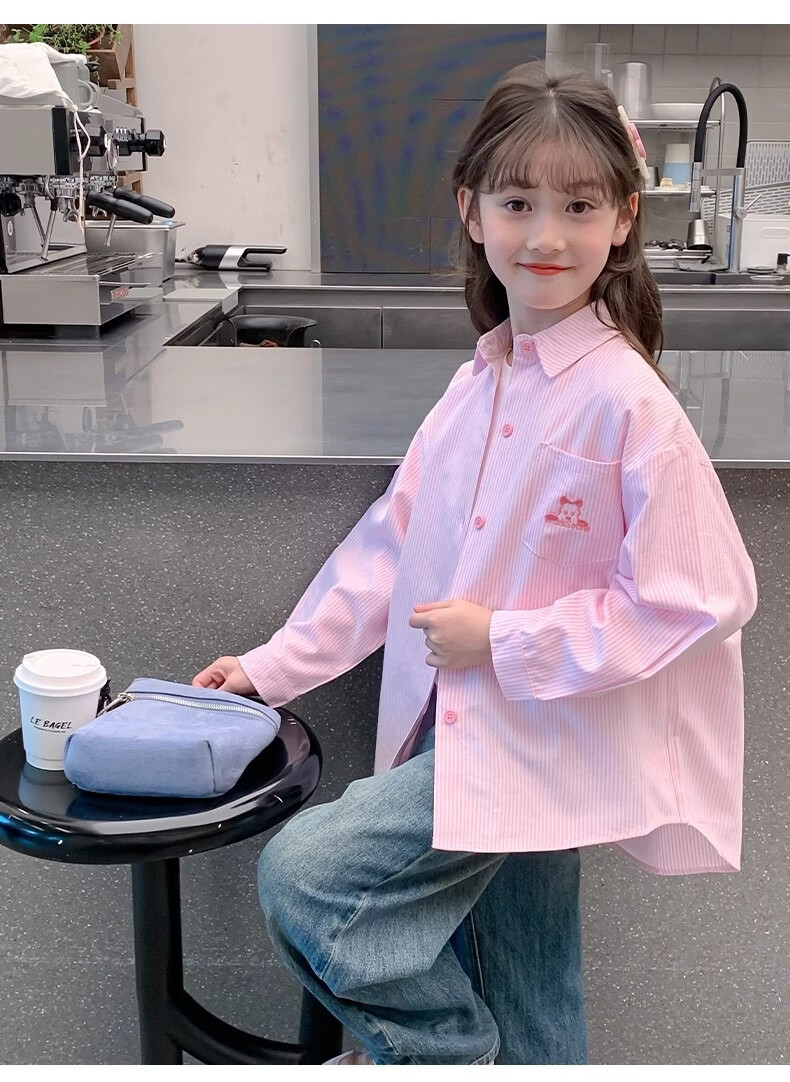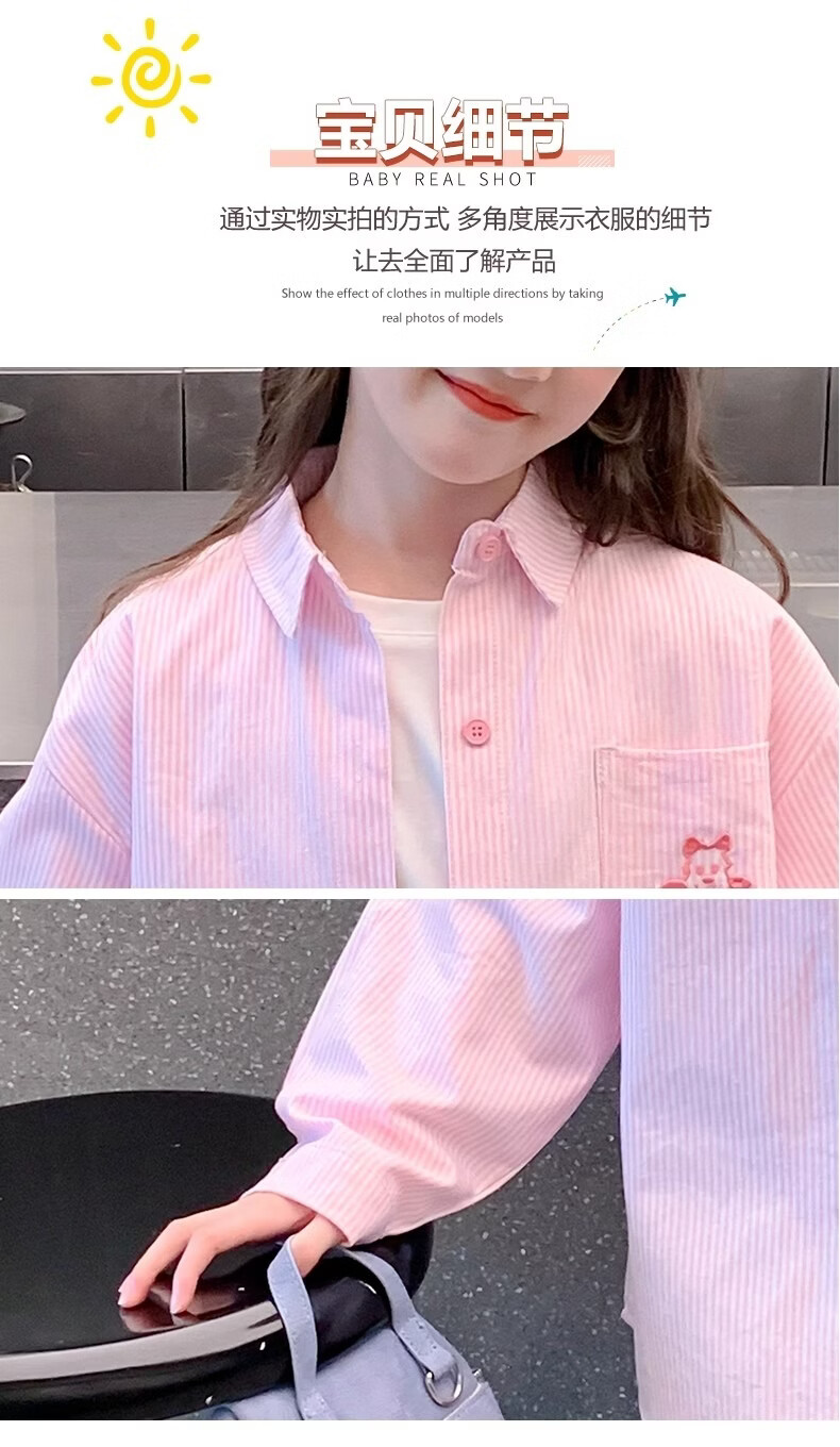 Girls' super nice shirt spring and autumn new children's striped loose long-sleeved shirt autumn girls trendy pink 130