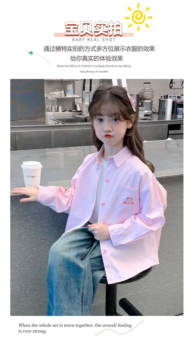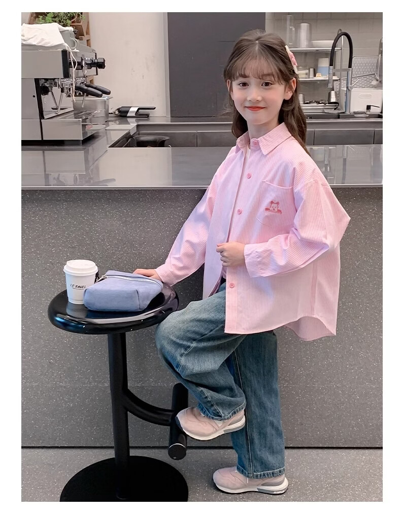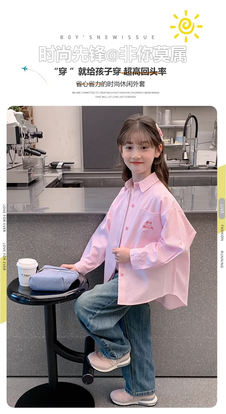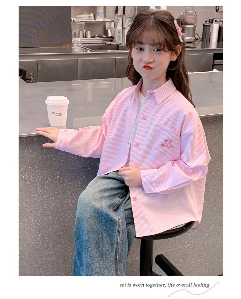 Girls' super nice shirt spring and autumn new children's striped loose long-sleeved shirt autumn girls trendy pink 130