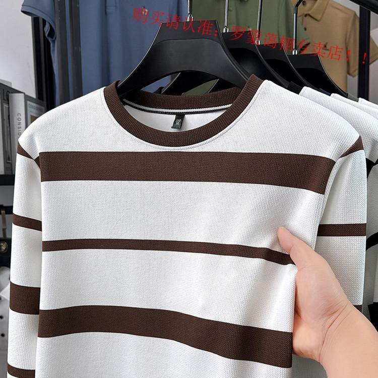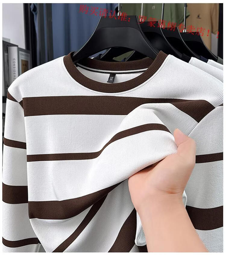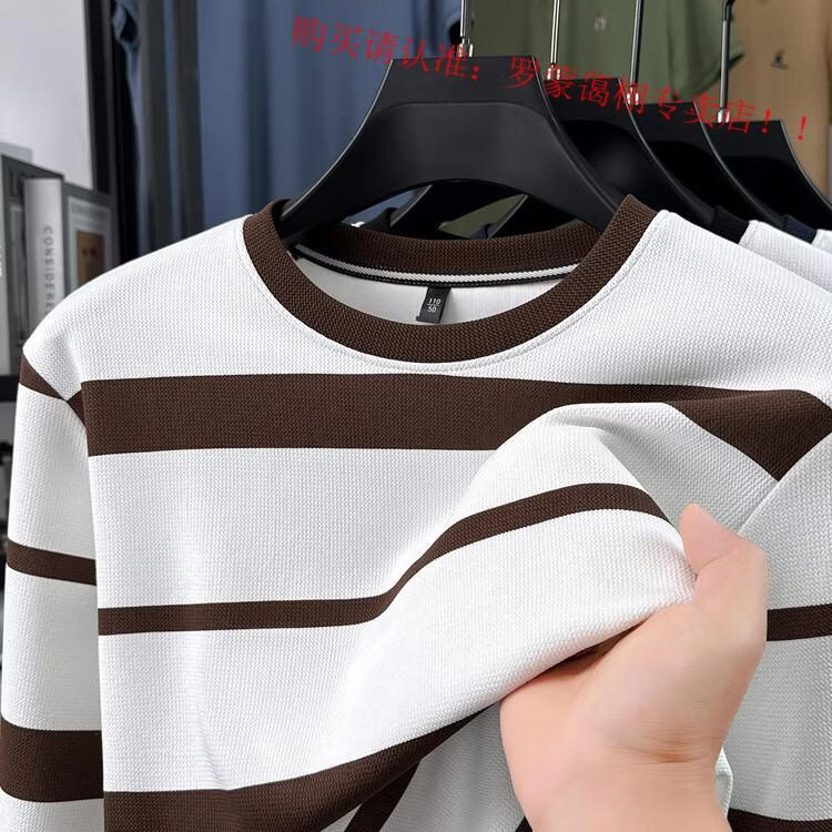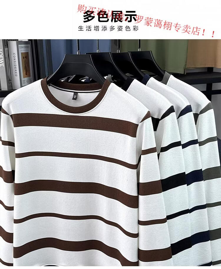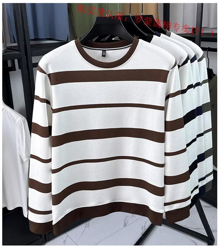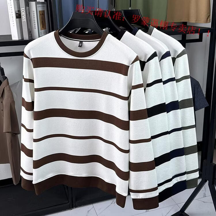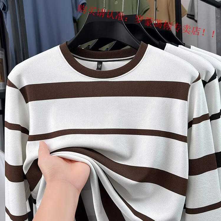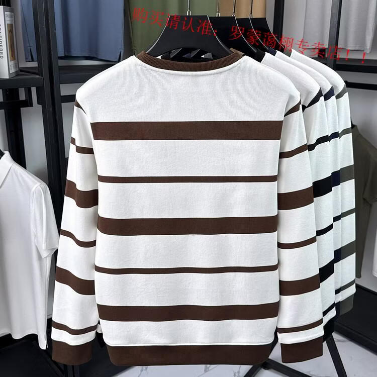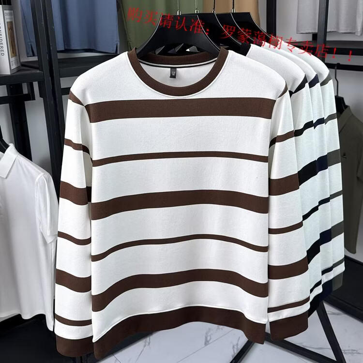 ROMON Men's Long Sleeve T-Shirt Striped Round Neck Contrast Color Top Spring and Autumn 2026 New Youth Round Neck Pullover Sweatshirt Brown M 48