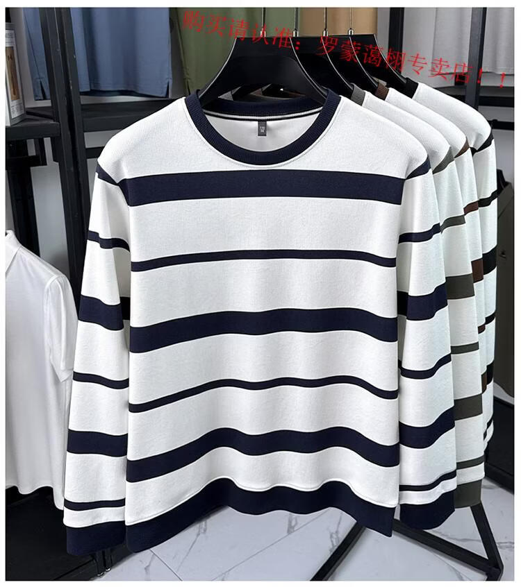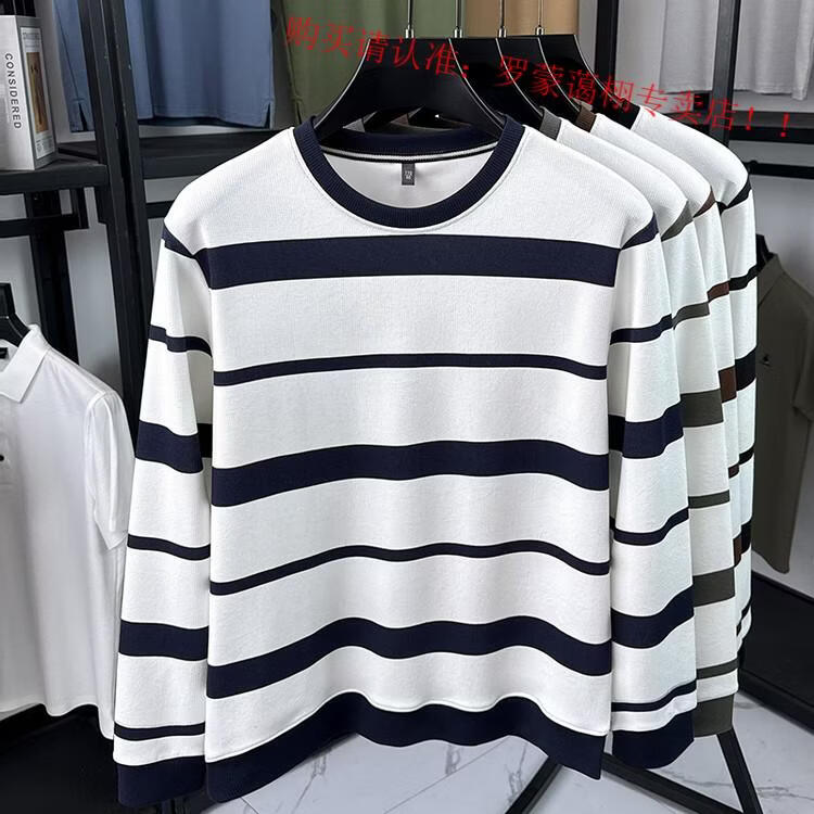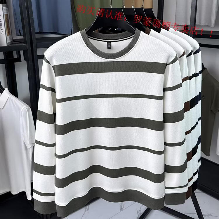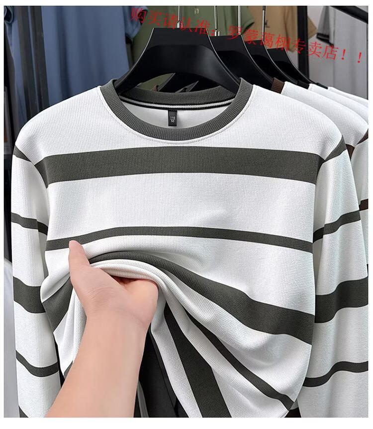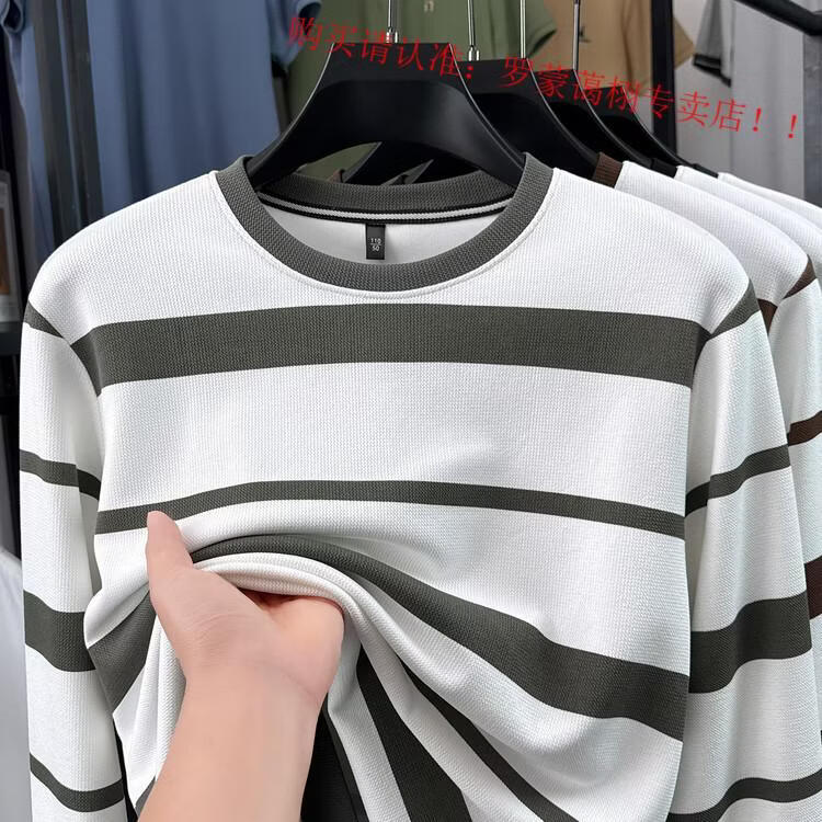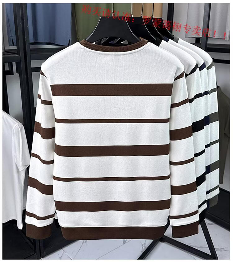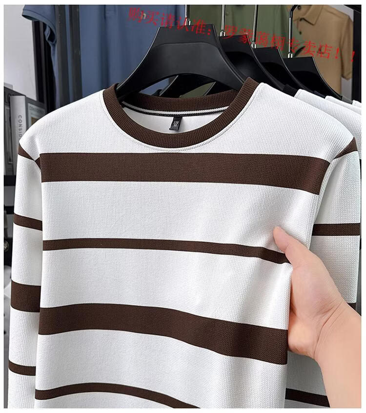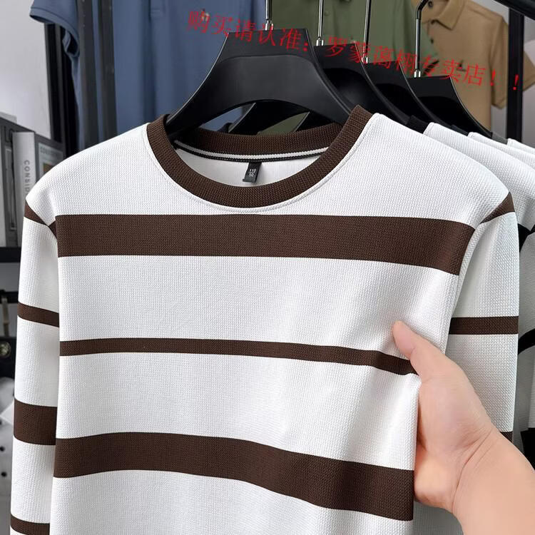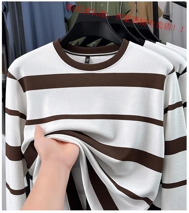 ROMON Men's Long Sleeve T-Shirt Striped Round Neck Contrast Color Top Spring and Autumn 2026 New Youth Round Neck Pullover Sweatshirt Brown M 48