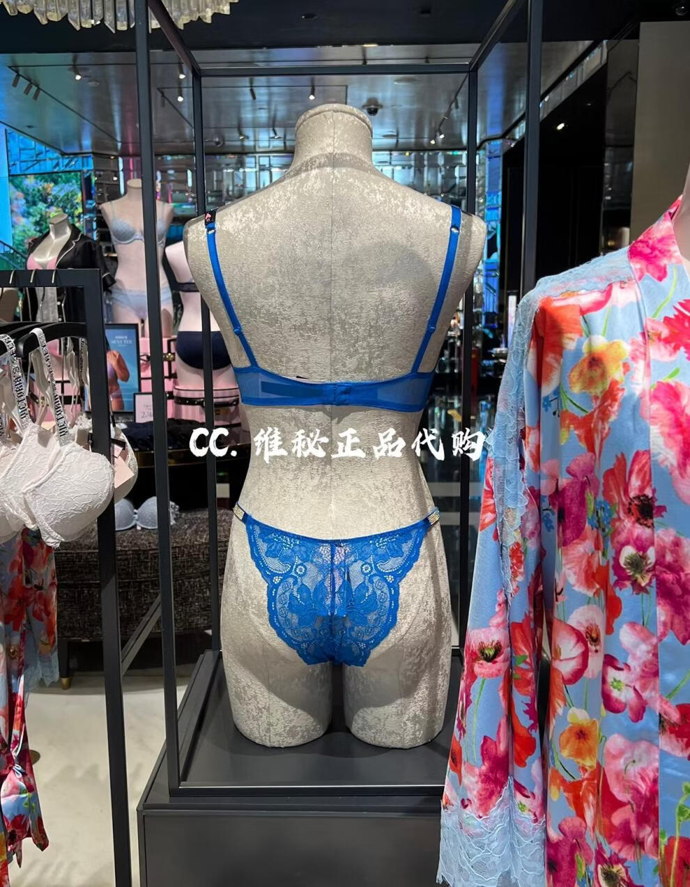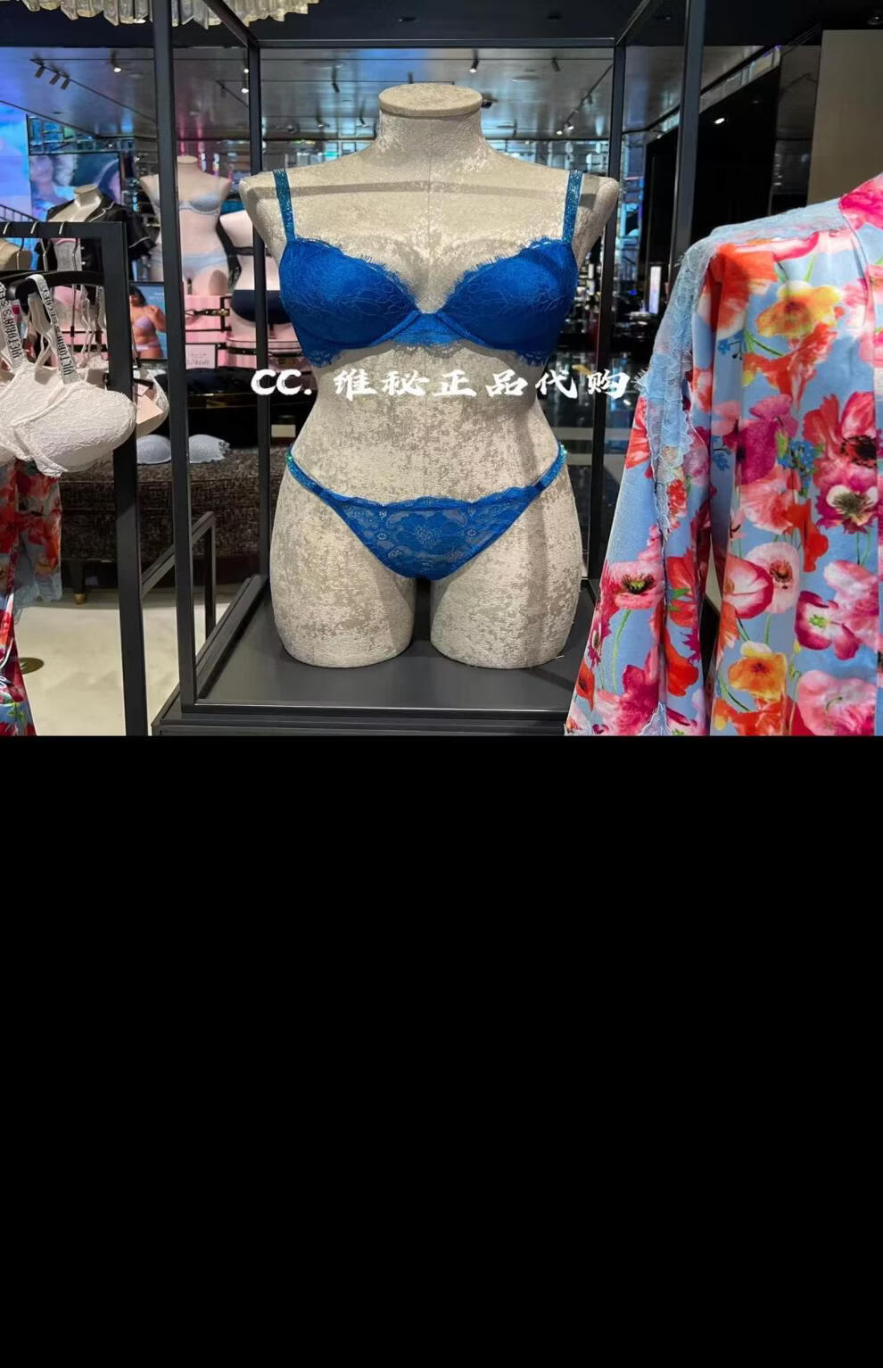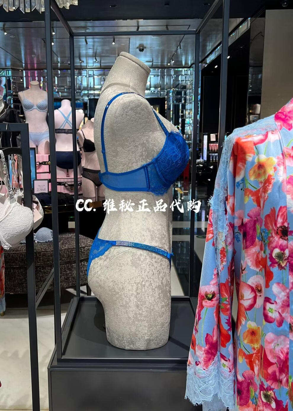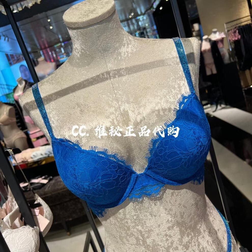 维多利亚的秘密人鱼渐层水钻可露肩带性感深v聚拢蕾丝内衣文胸 蓝色_不退换谢谢 4XL 32D