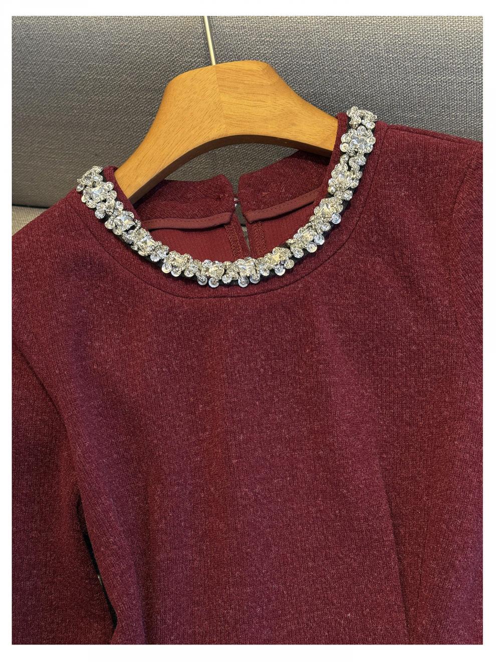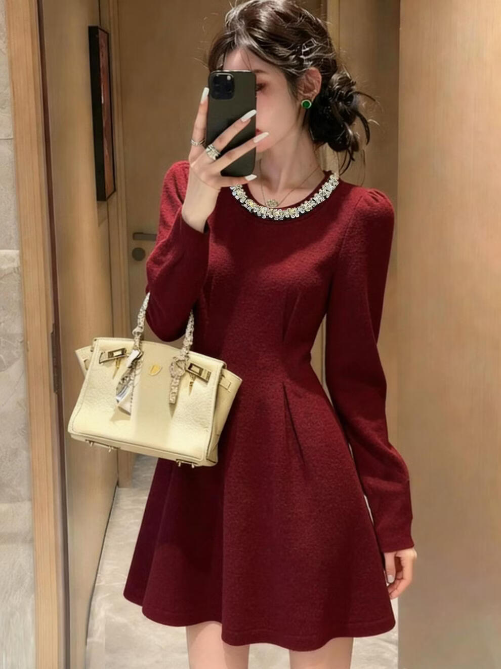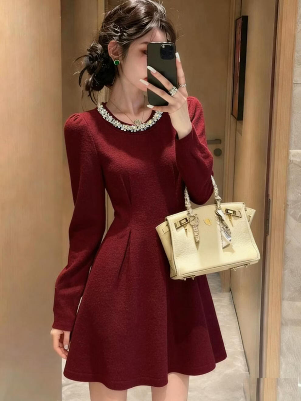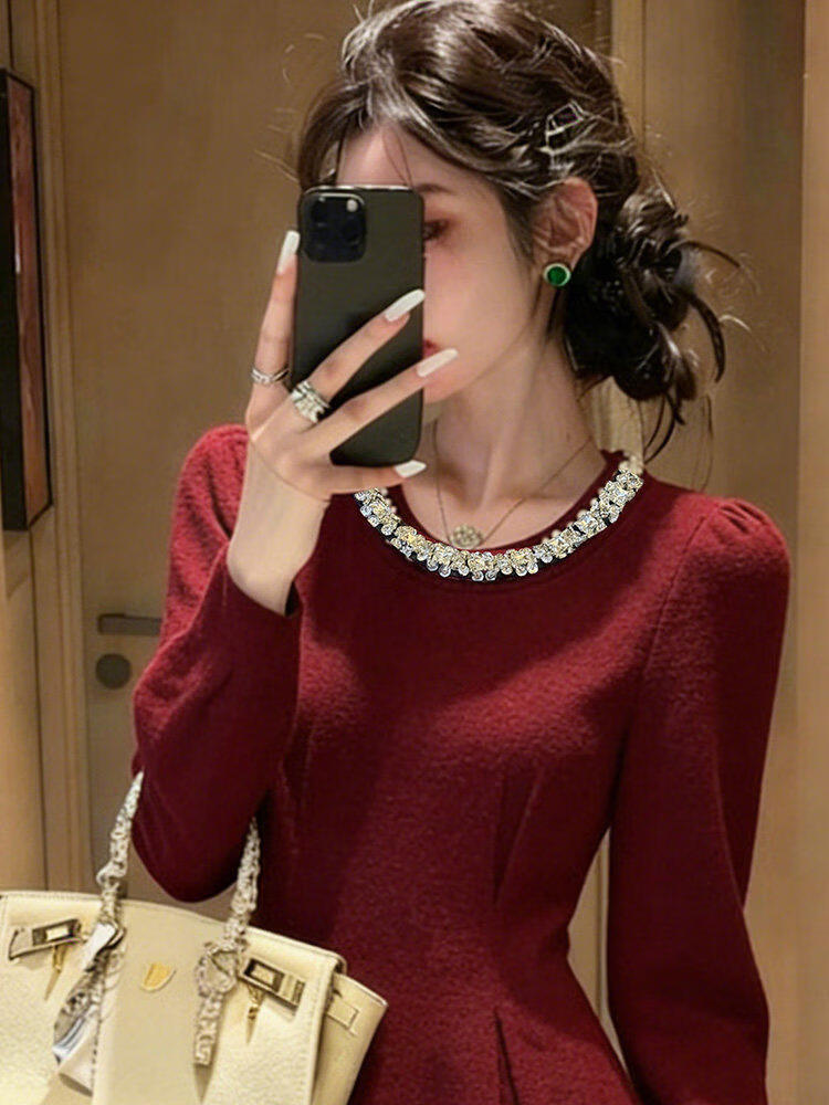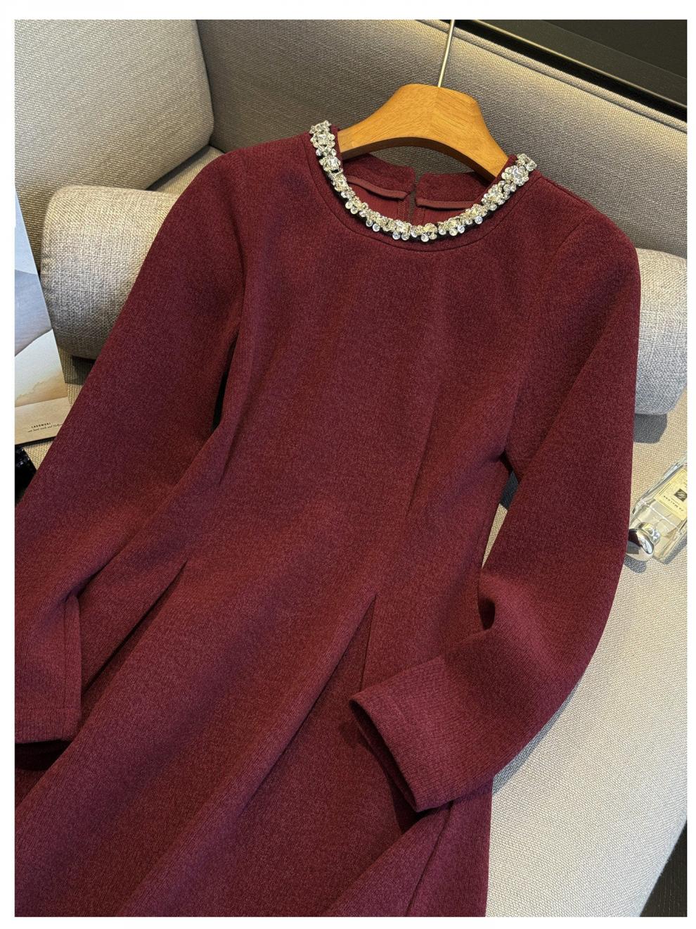 Xiaohongshu gold-embellished diamond red engagement dress for women, autumn and winter long-sleeved petite banquet toast, burgundy M