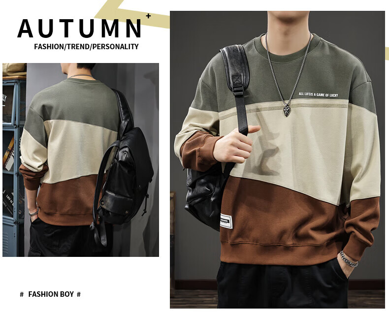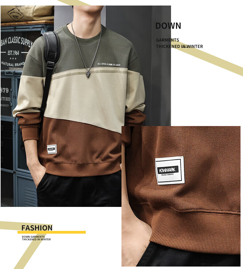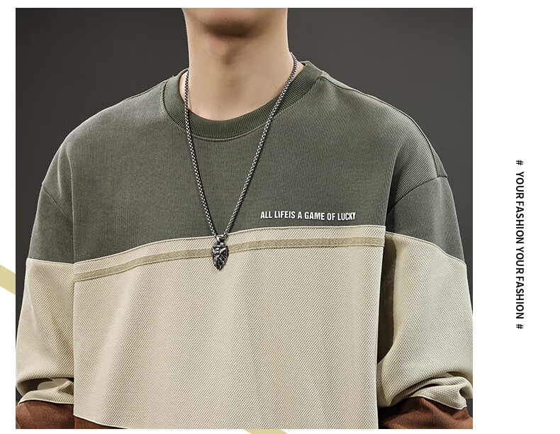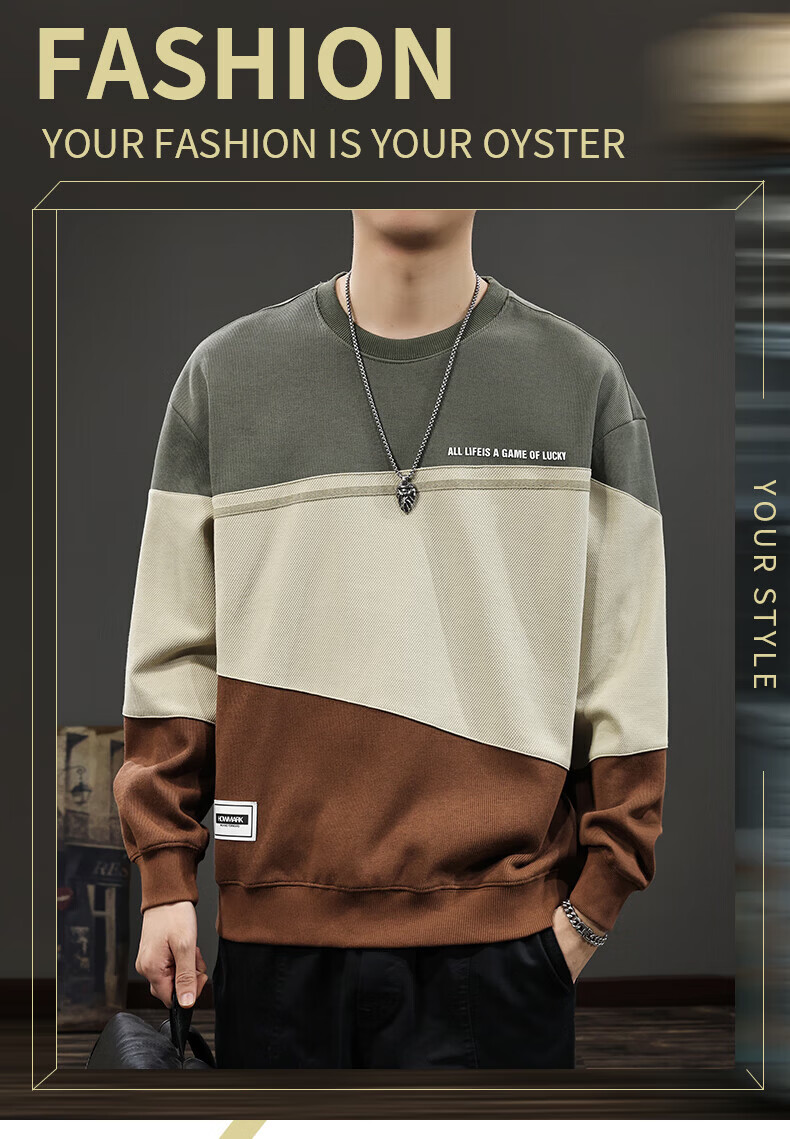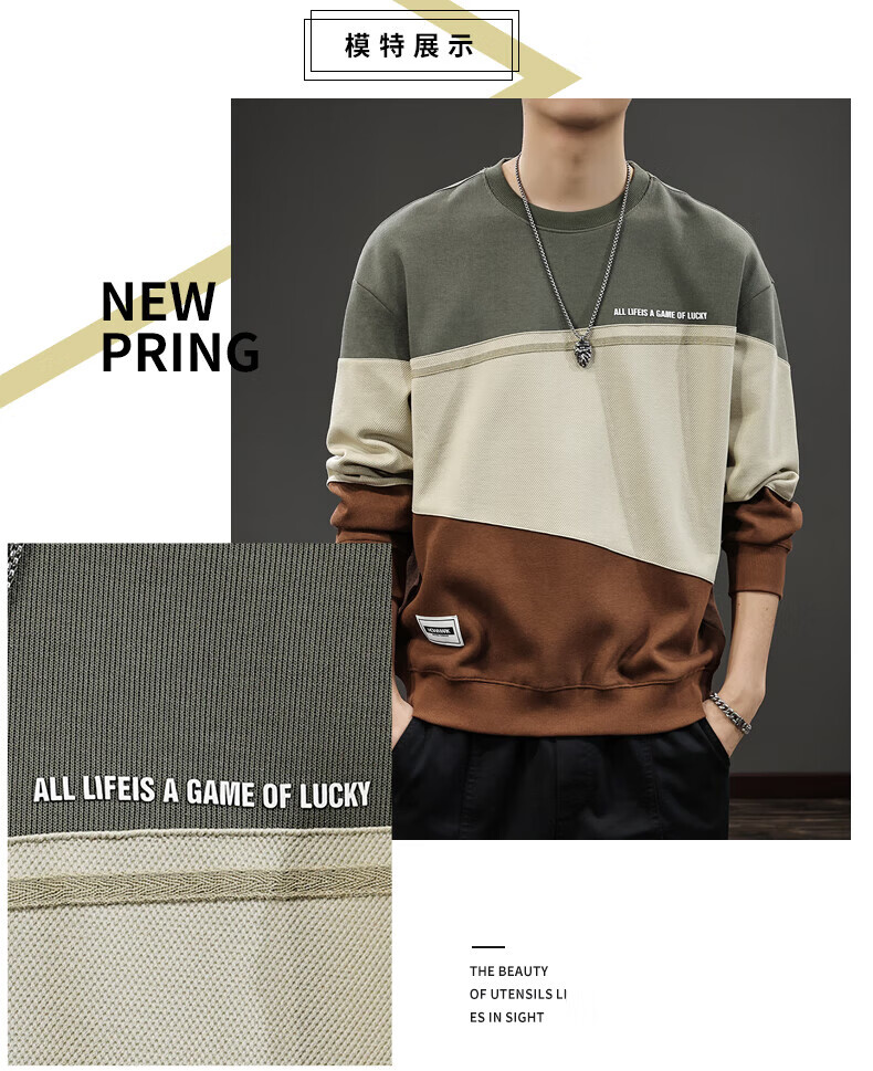 GXG.PR Diseño de costura con sentido, color contrastante, sudadera para hombre, otoño e invierno, cuello redondo suelto, camisa de manga larga, marca de moda estadounidense, top atractivo, gris, verde, M, peso adecuado 100-120 Jin Jin equivale a 0,5 kg
