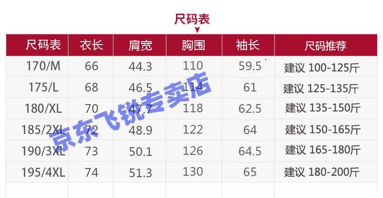 China (cm) 165 / 88-90 170 / 96-98 175 / 108-110 180 / 118-122 185 / 126-130