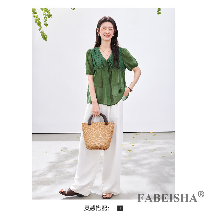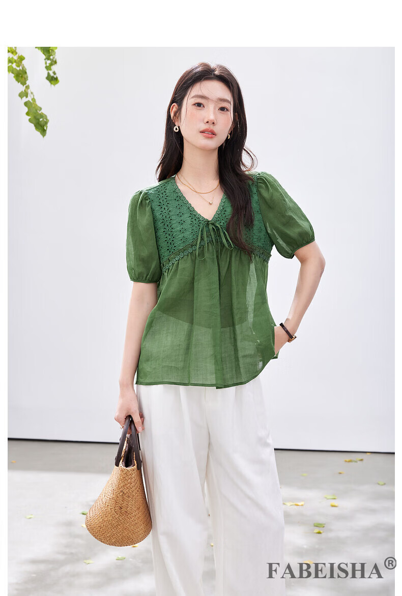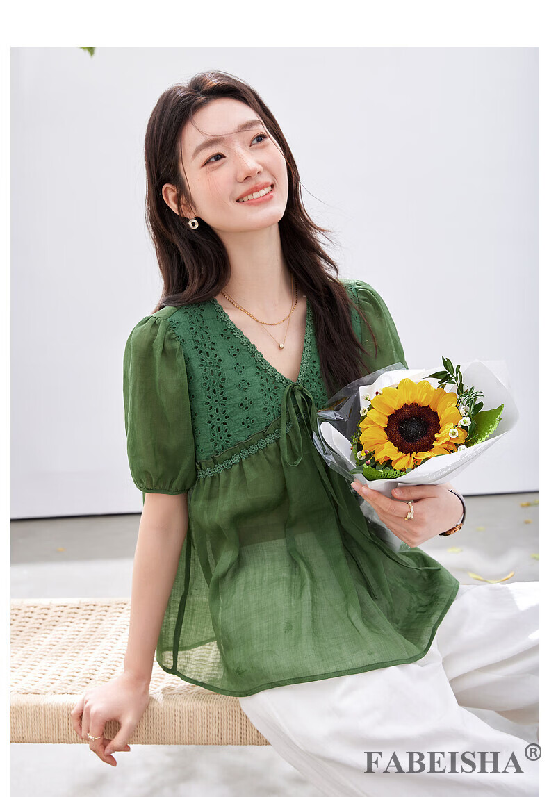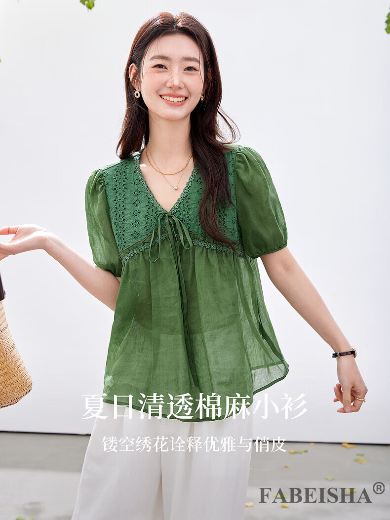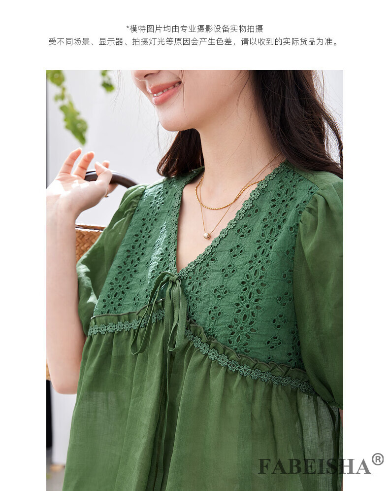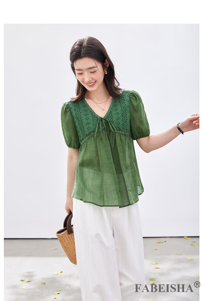 Fabersa brand pastoral style breathable ramie shirt for women 2026 summer new style hollow embroidered V-neck tie short-sleeved top dill green L (recommended 110-120Jin Jin equals 0.5kg)