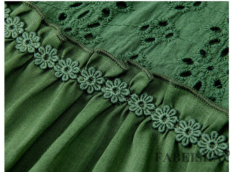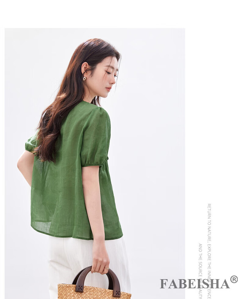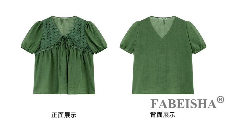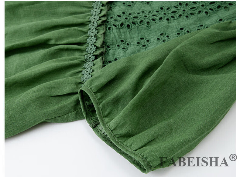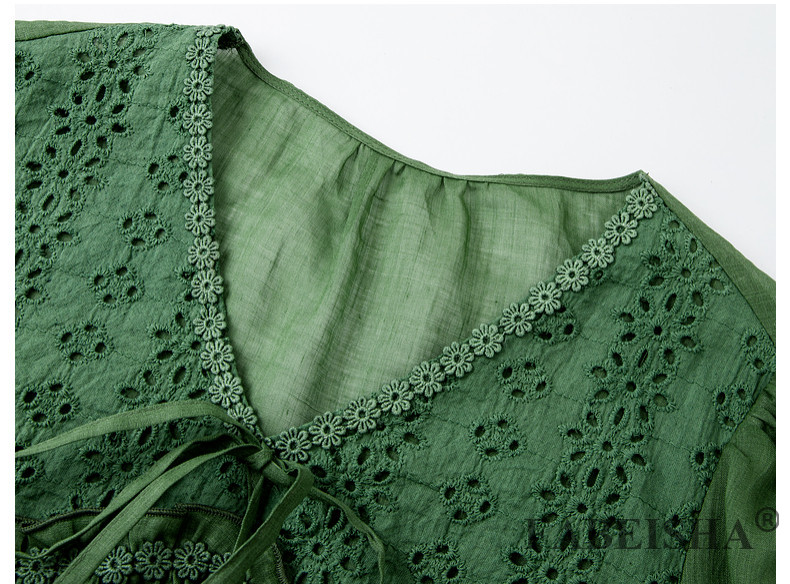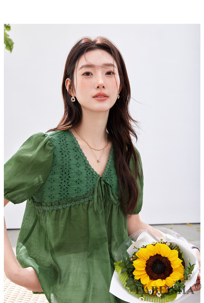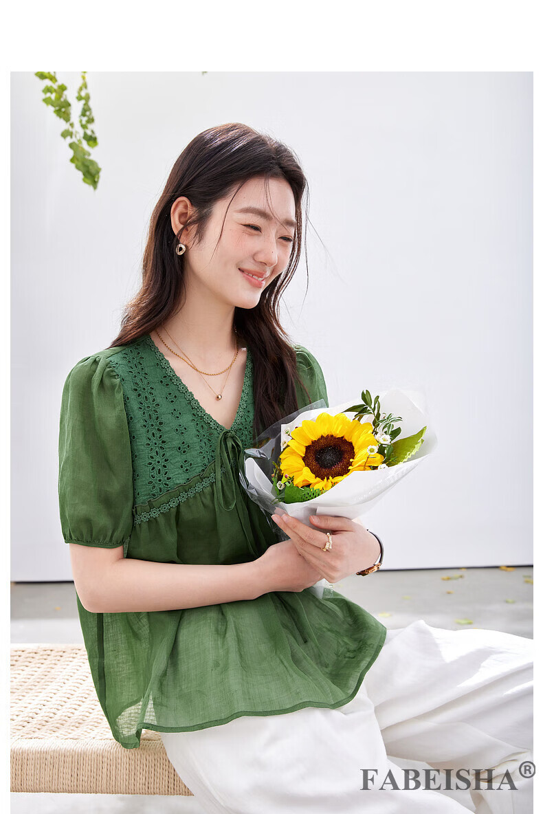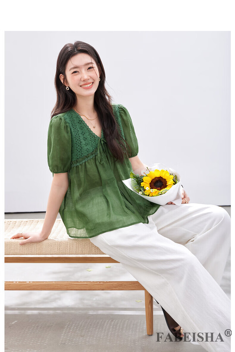 Fabersa brand pastoral style breathable ramie shirt for women 2026 summer new style hollow embroidered V-neck tie short-sleeved top dill green L (recommended 110-120Jin Jin equals 0.5kg)