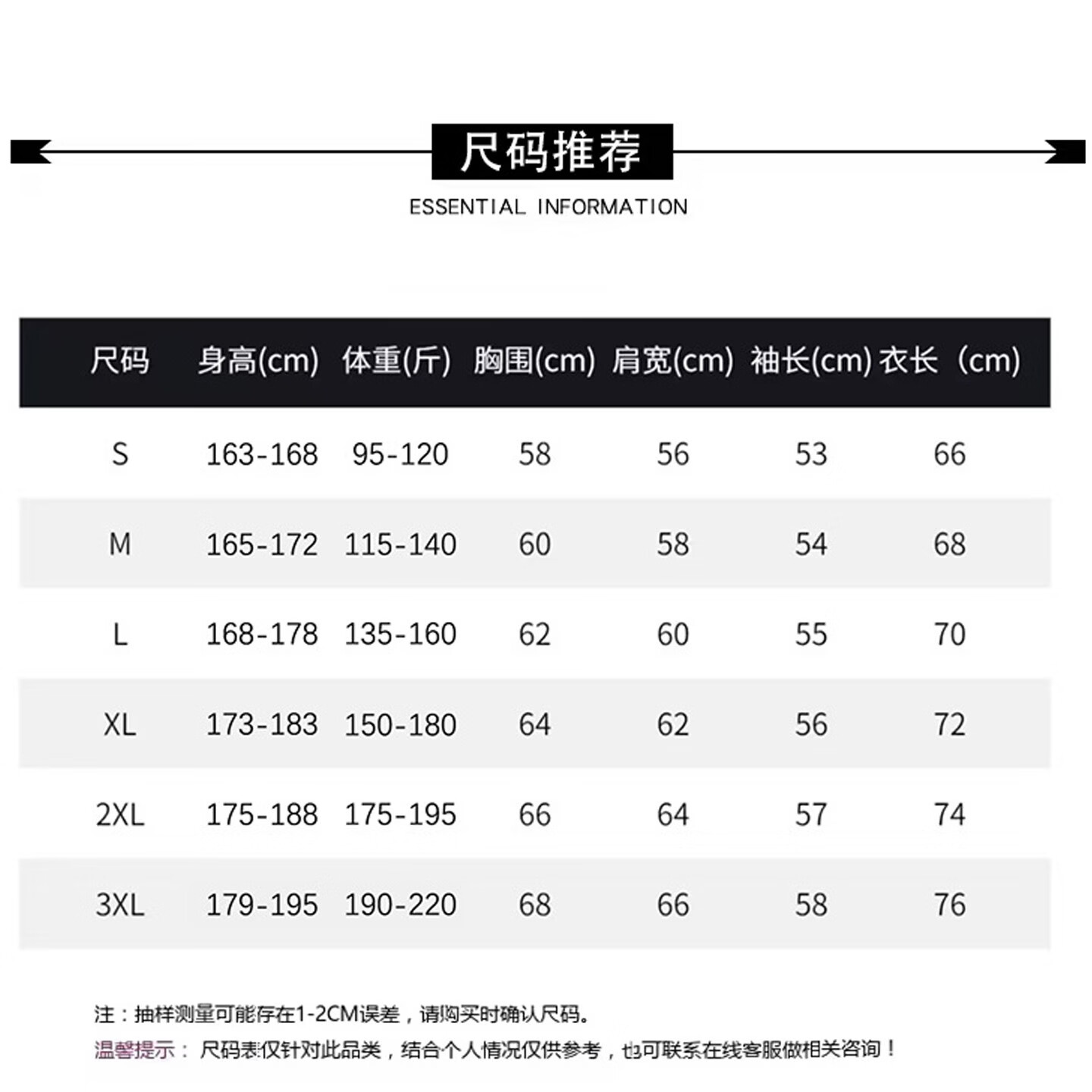 China (cm) 165 / 88-90 170 / 96-98 175 / 108-110 180 / 118-122 185 / 126-130