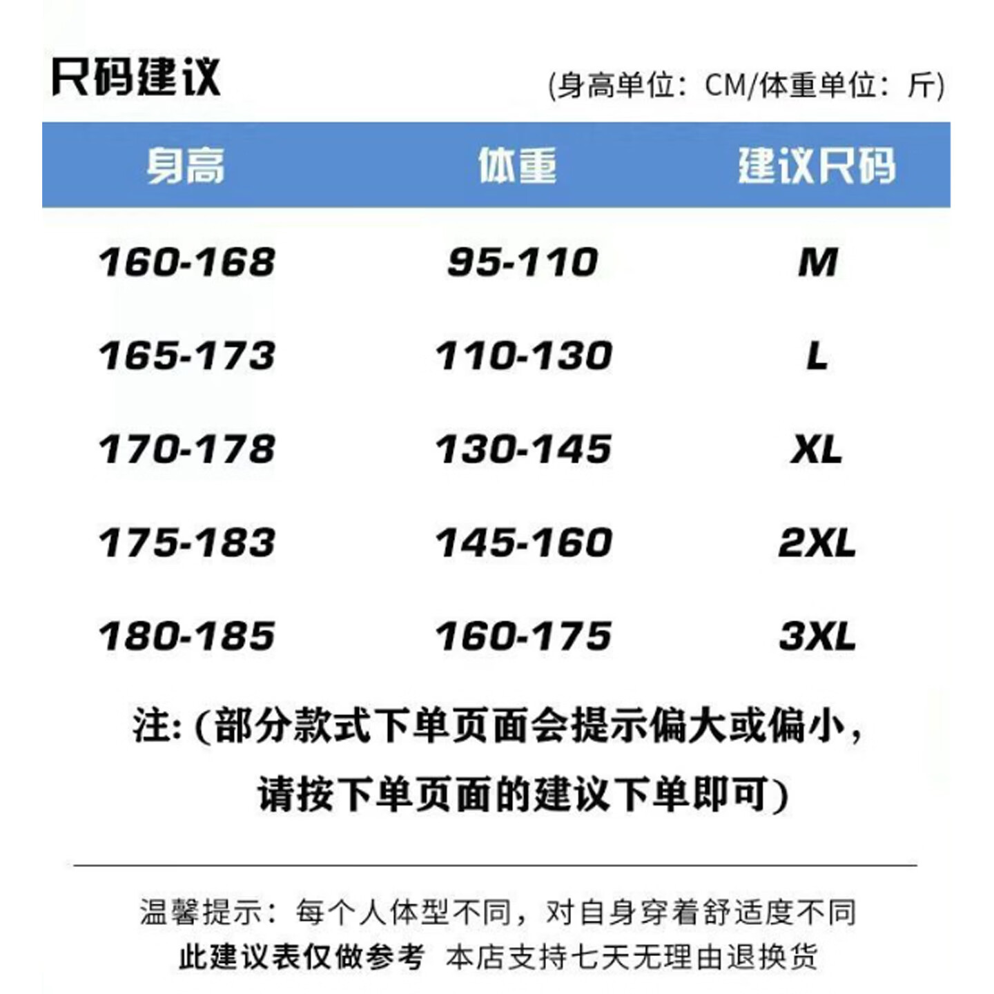 China (cm) 165 / 88-90 170 / 96-98 175 / 108-110 180 / 118-122 185 / 126-130