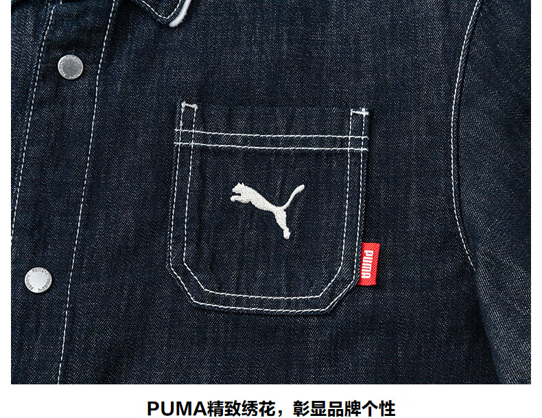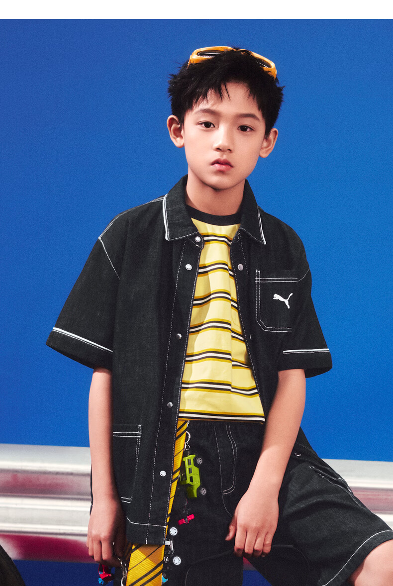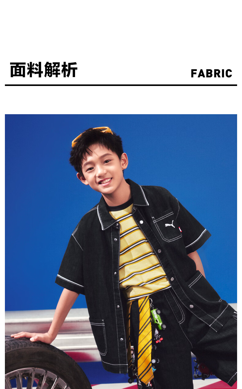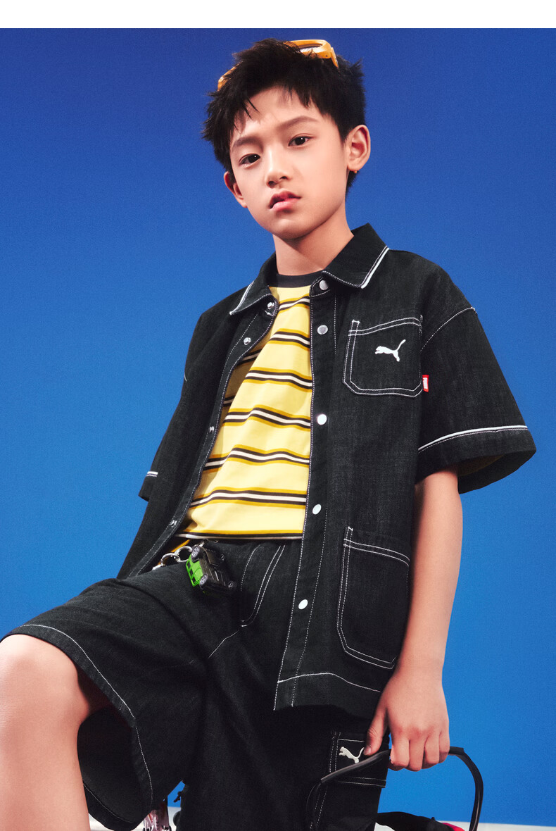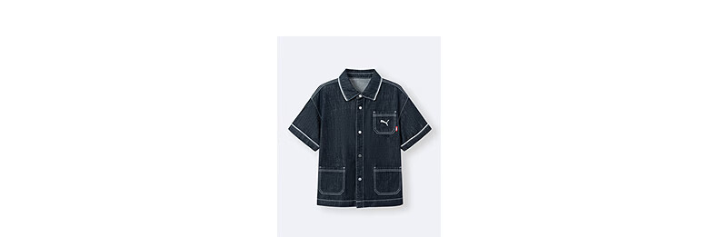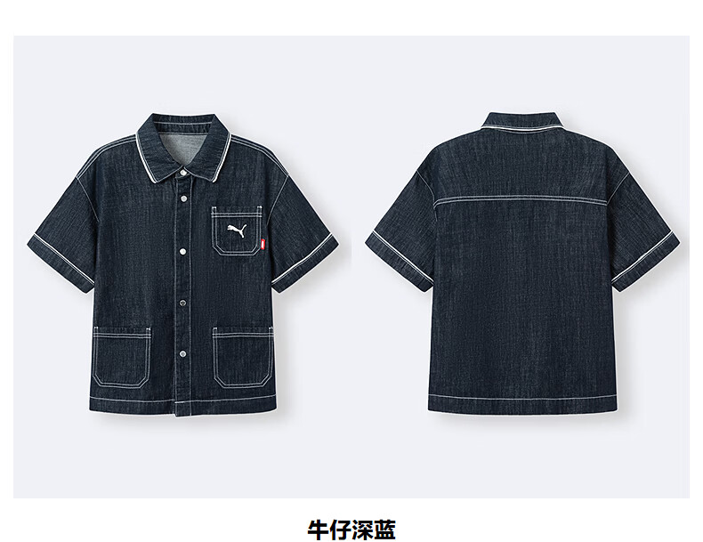 Puma (PUMA) Puma children's clothing 2026 summer new style children's boys short-sleeved shirts denim tops retro trend denim dark blue 88301 110