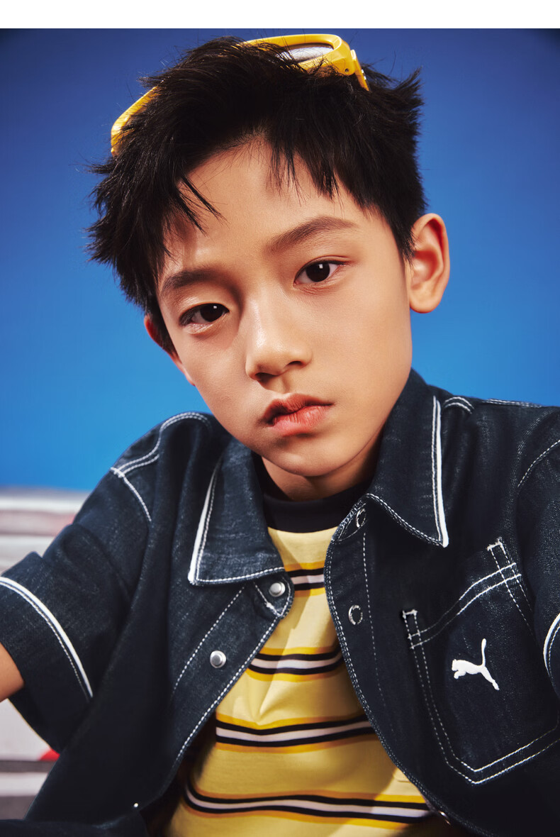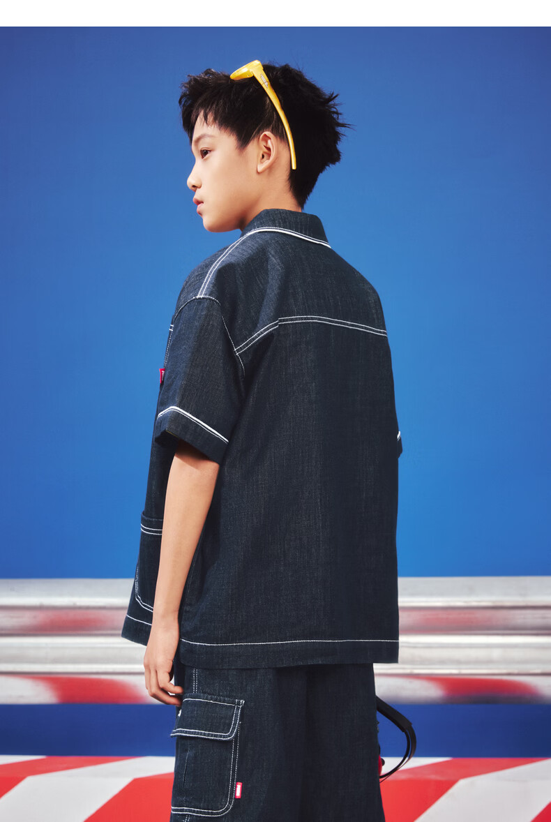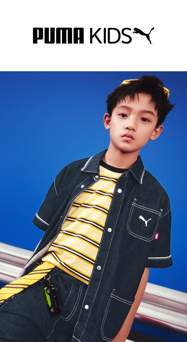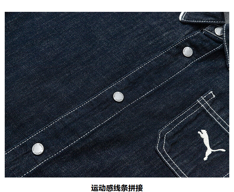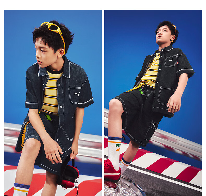 Puma (PUMA) Puma children's clothing 2026 summer new style children's boys short-sleeved shirts denim tops retro trend denim dark blue 88301 110