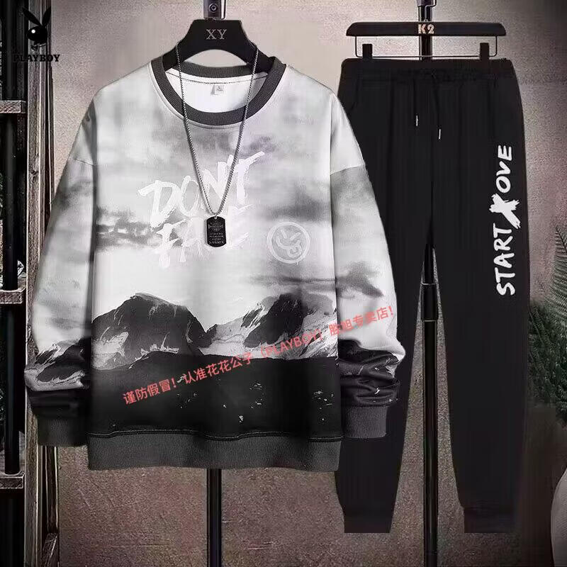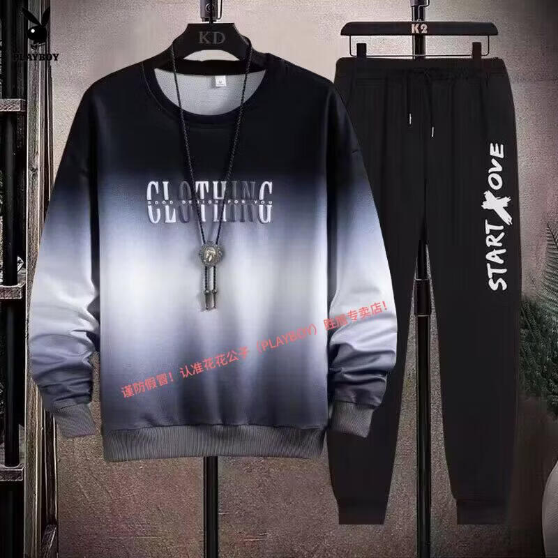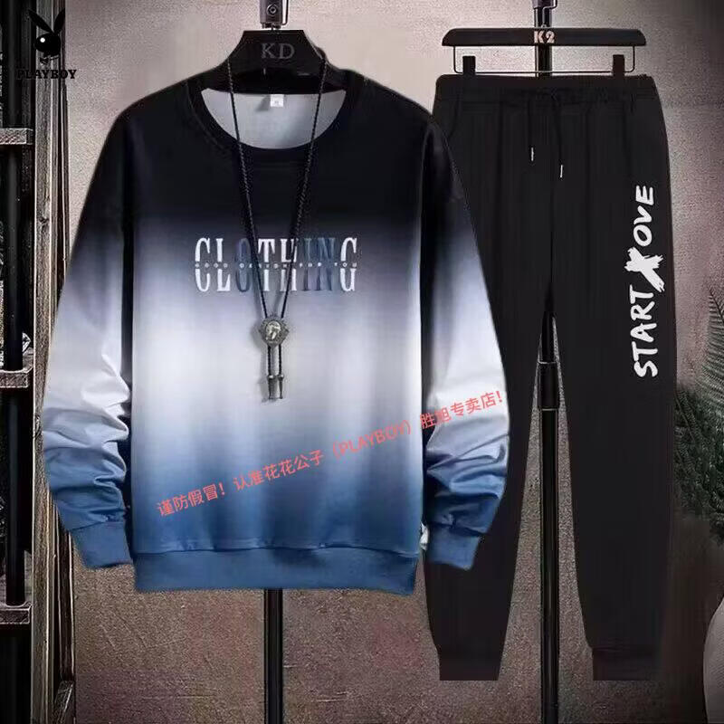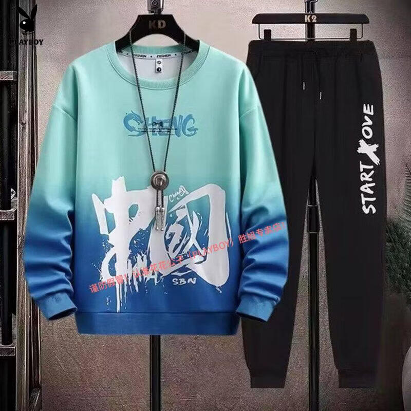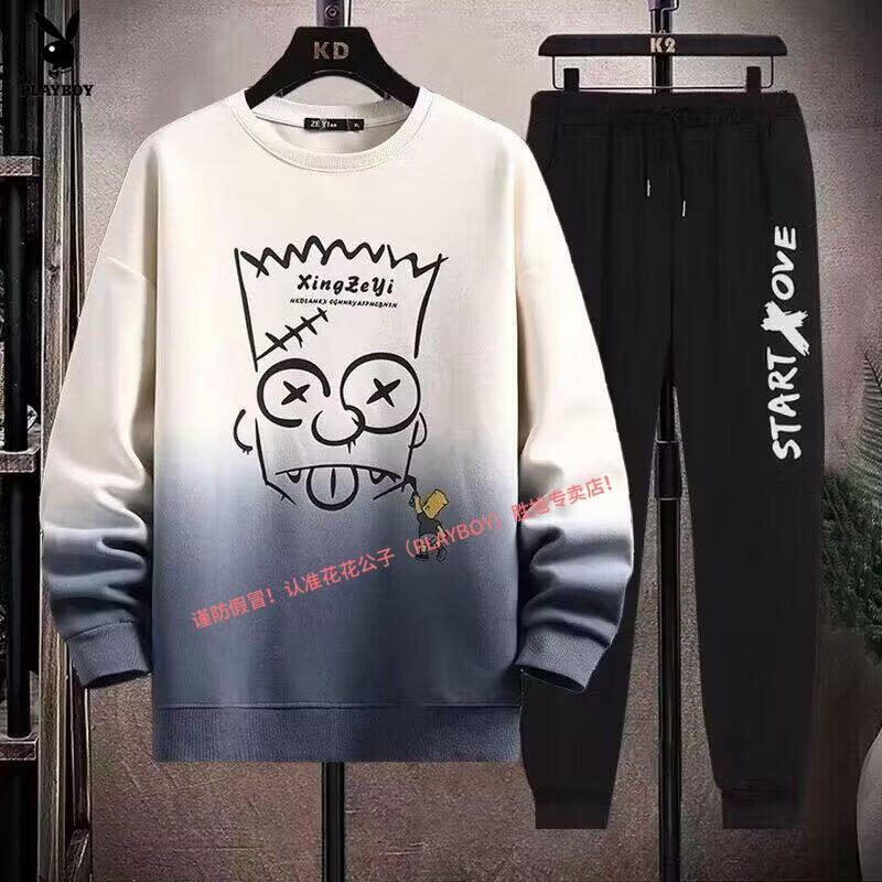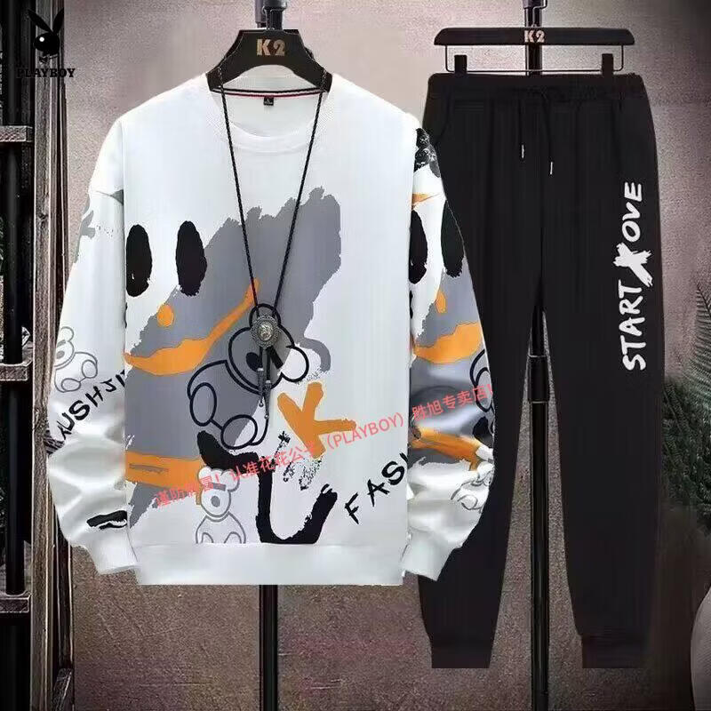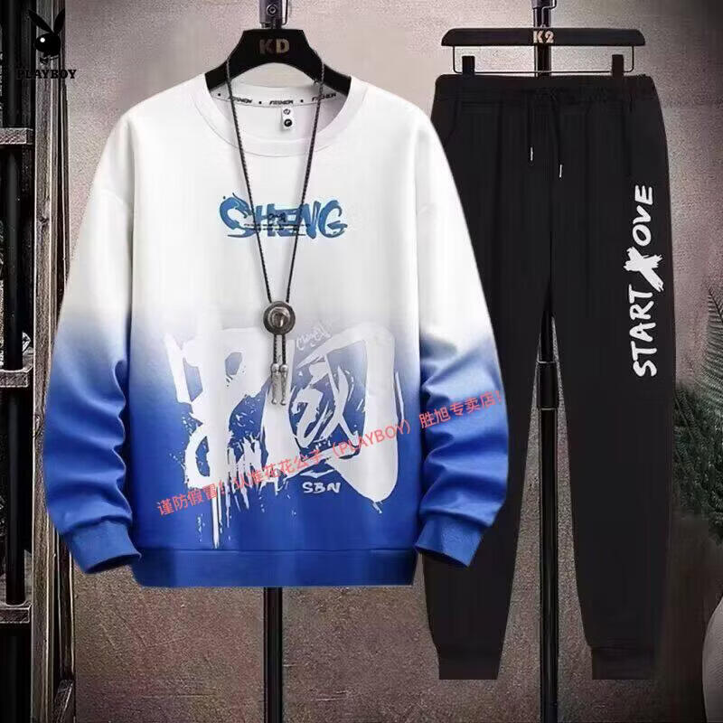 Playboy pure cotton sports suit men's spring and autumn jacket men's casual sweatshirt men's handsome large size youth two-piece set new w92 Chinese white blue + k04 pants S recommended 85-95Jin Jin equals 0.5 kg