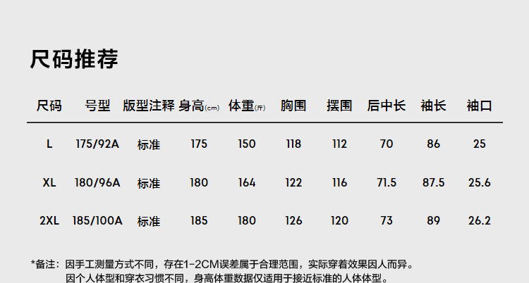 China (cm) 160-165/84-86 165-170 / 88-90 167-172 / 92-96 168-173 / 98-102 170-176 / 106-110