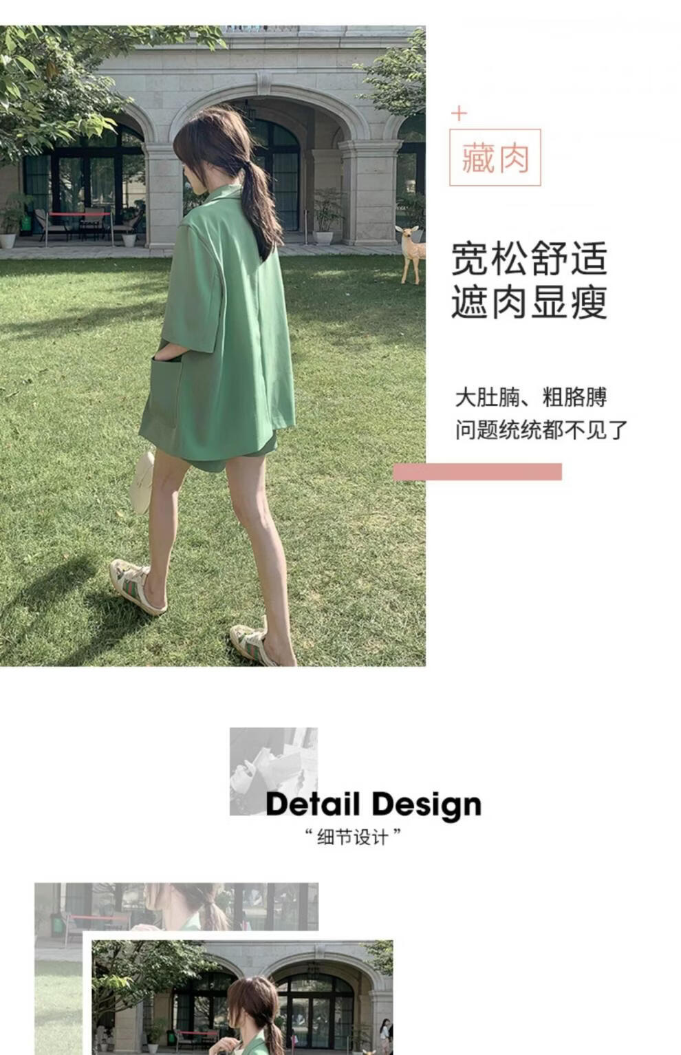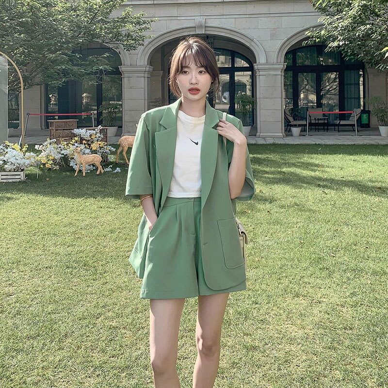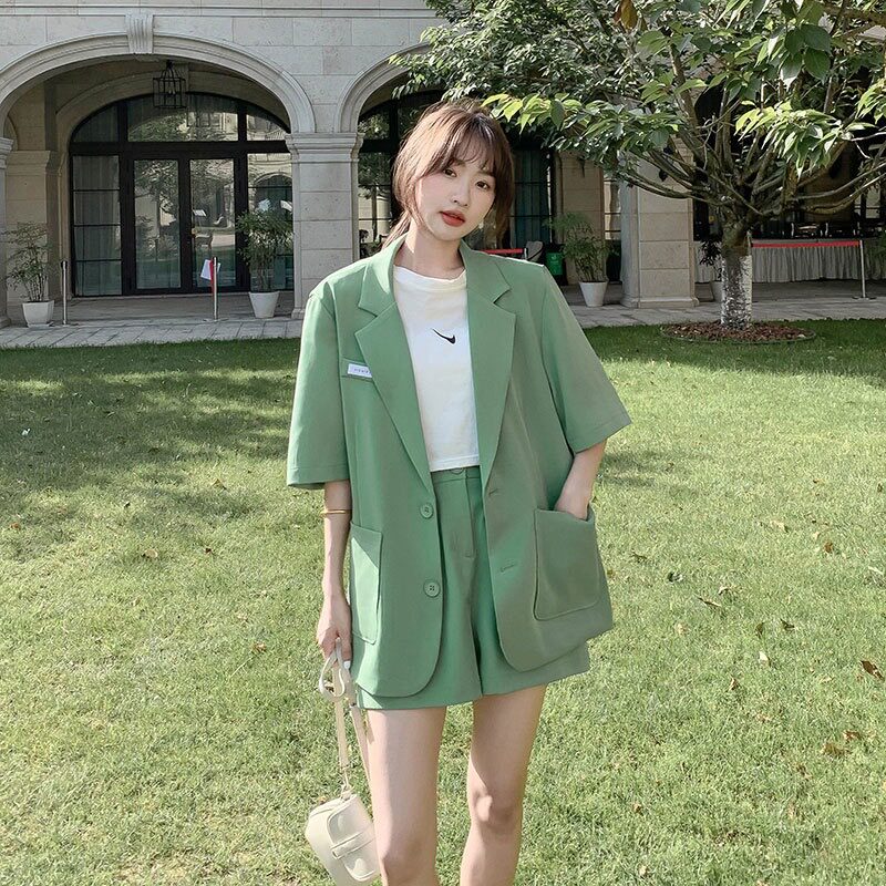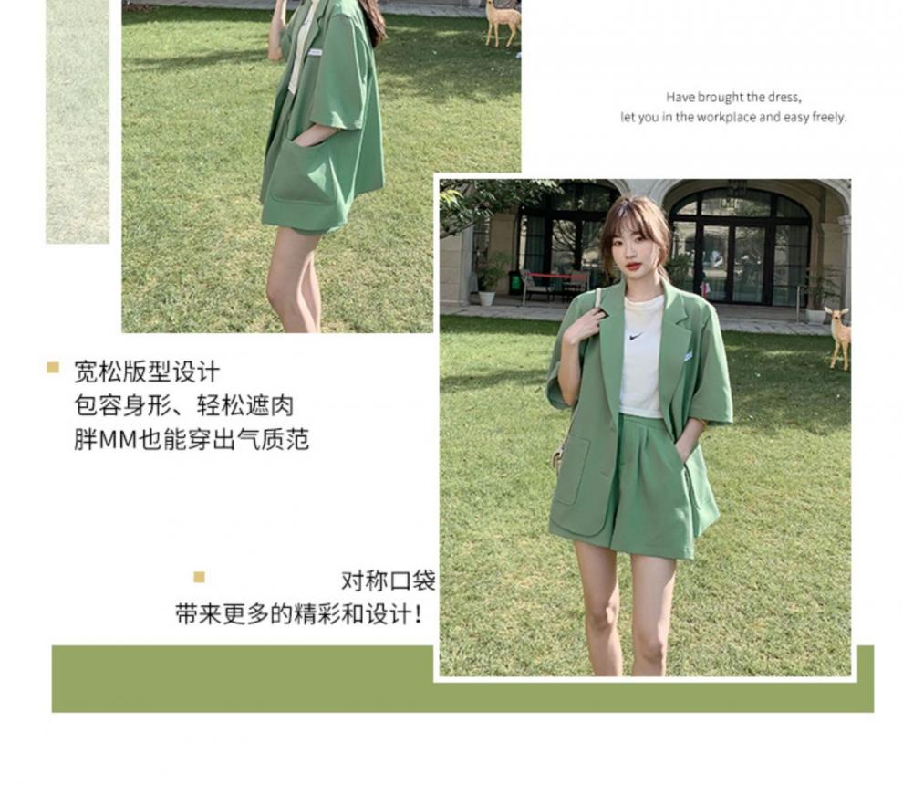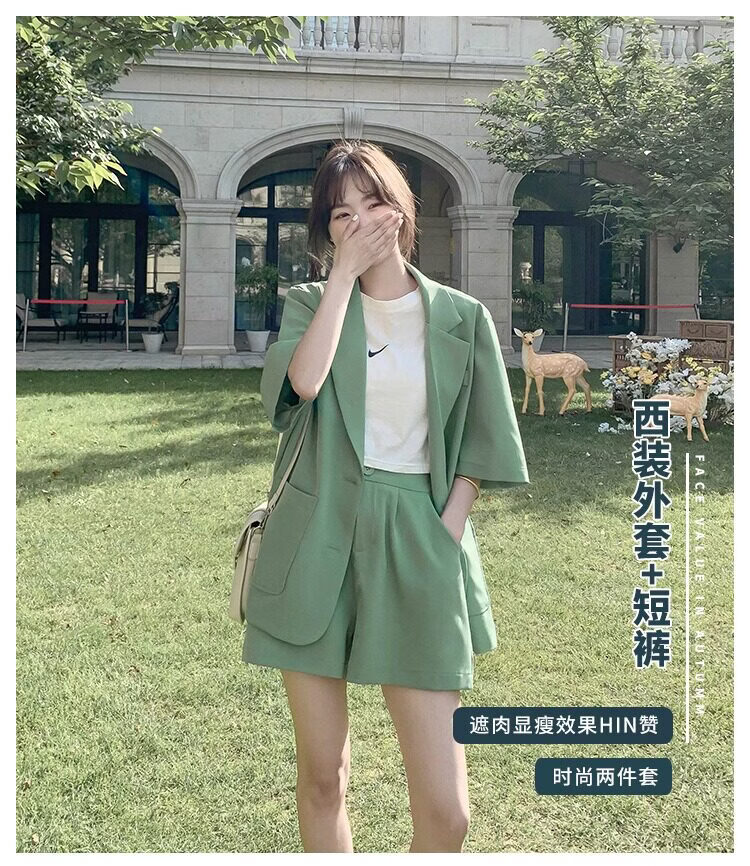 ROMON suit shorts suit for women summer new large size fat girl to cover the flesh and look slim Western style casual Internet celebrity two-piece set Green M recommended 80-100Jin Jin is equal to 0.5 kg