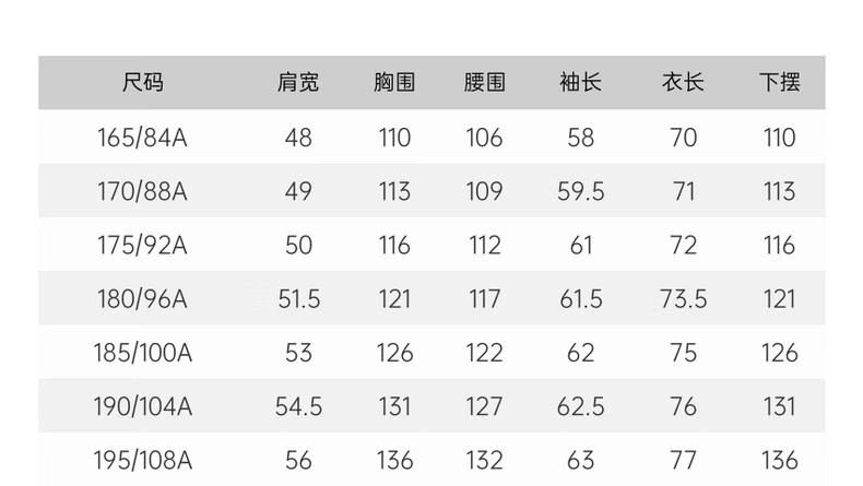 China (cm) 160-165/84-86 165-170 / 88-90 167-172 / 92-96 168-173 / 98-102 170-176 / 106-110