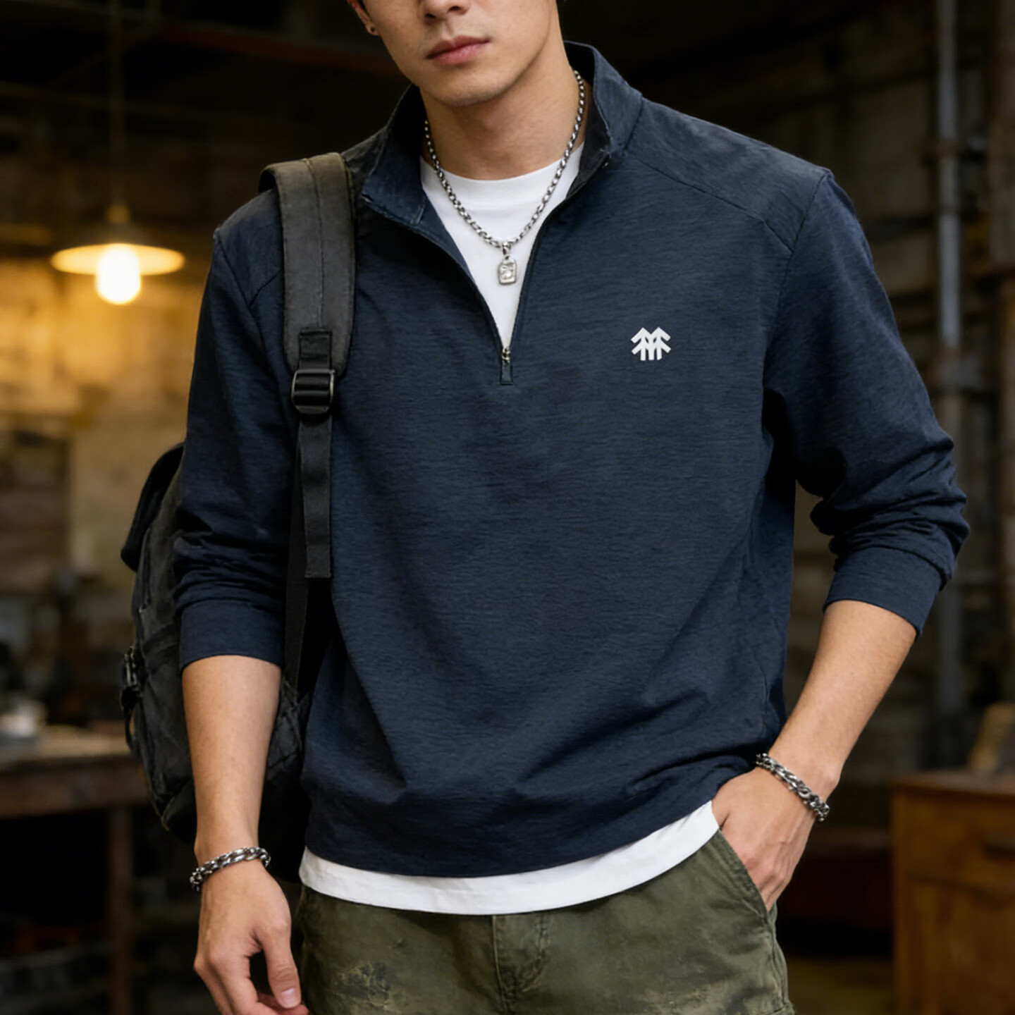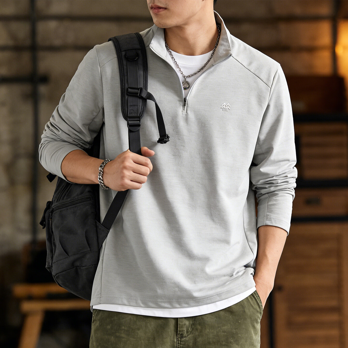 Romon half-zip sweatshirt for men 2026 spring stand-up collar thin loose casual long-sleeved bottoming shirt half-cardigan for men light gray L