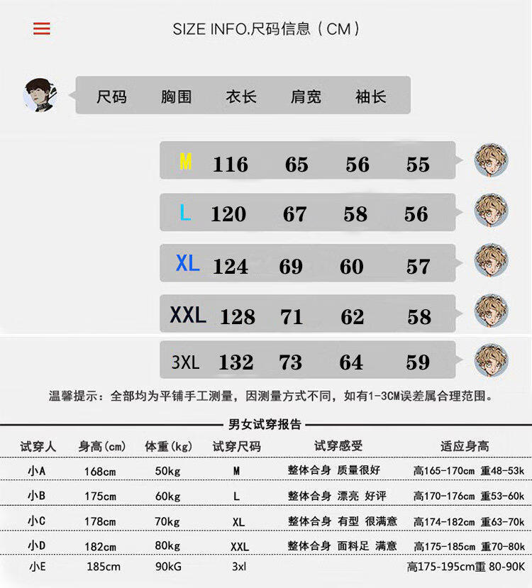 China (cm) 165 / 88-90 170 / 96-98 175 / 108-110 180 / 118-122 185 / 126-130